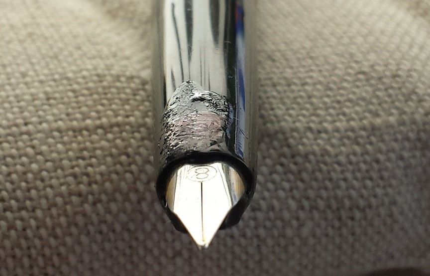 Ho provato ad esercitare più pressione, non ottenendo nulla se non una piccola crepa nella sezione e una limitata deformazione del pennino, durissimo, in acciaio.