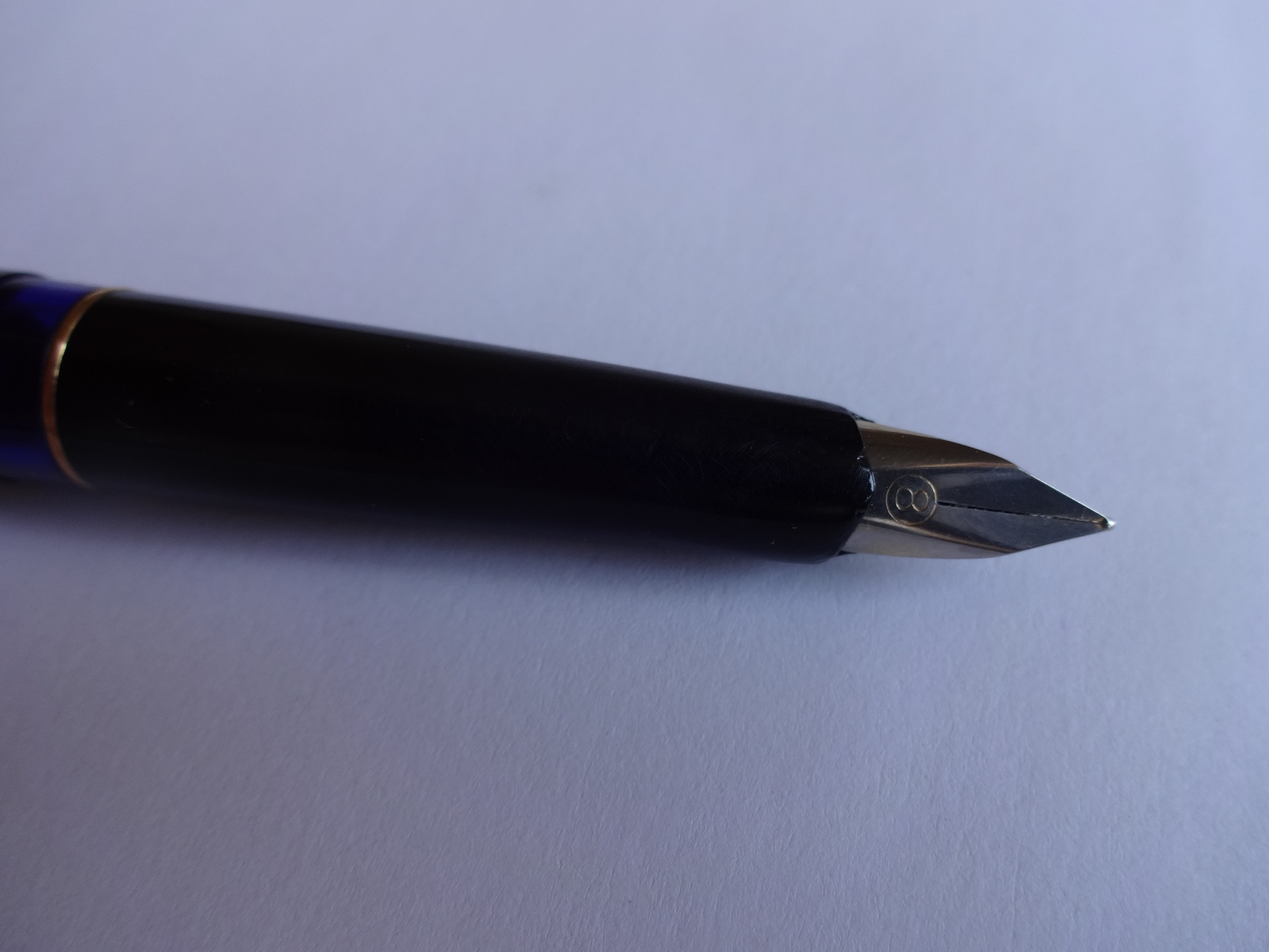 Inoltre sospetto che il pennino, che credo fosse gold plated visto che presenta qualche lontana traccia di doratura nella parte inferiore, non sia un Pelikan. L'unica scritta presente é un "8" cerchiato, e non ho mai visto un pennino Pelikan senza il logo o la scritta della marca.