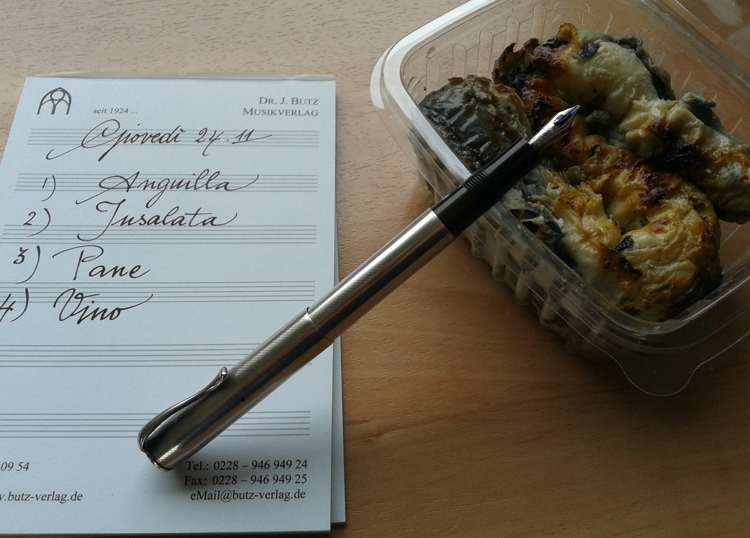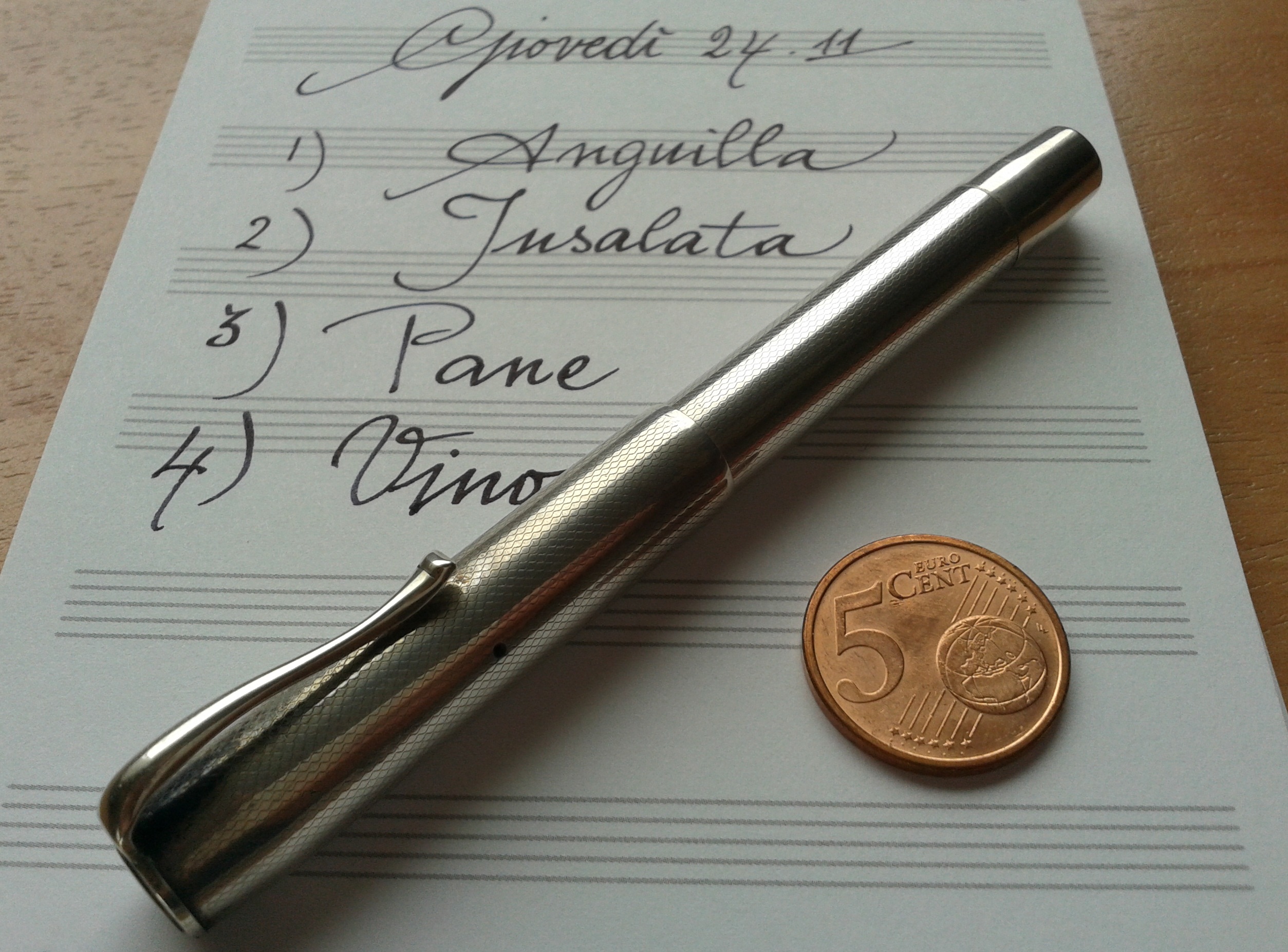 una anonima trovatella di origine tedesca, prodotta nel secondo dopoguerra, rivestita in argento 900 con pennino stub (“garantito acciaio prima qualità”) e caricamento a pistone con finestrella di ispezione (chiusa cm.10,7, con cappuccio calzato cm.13,5).
