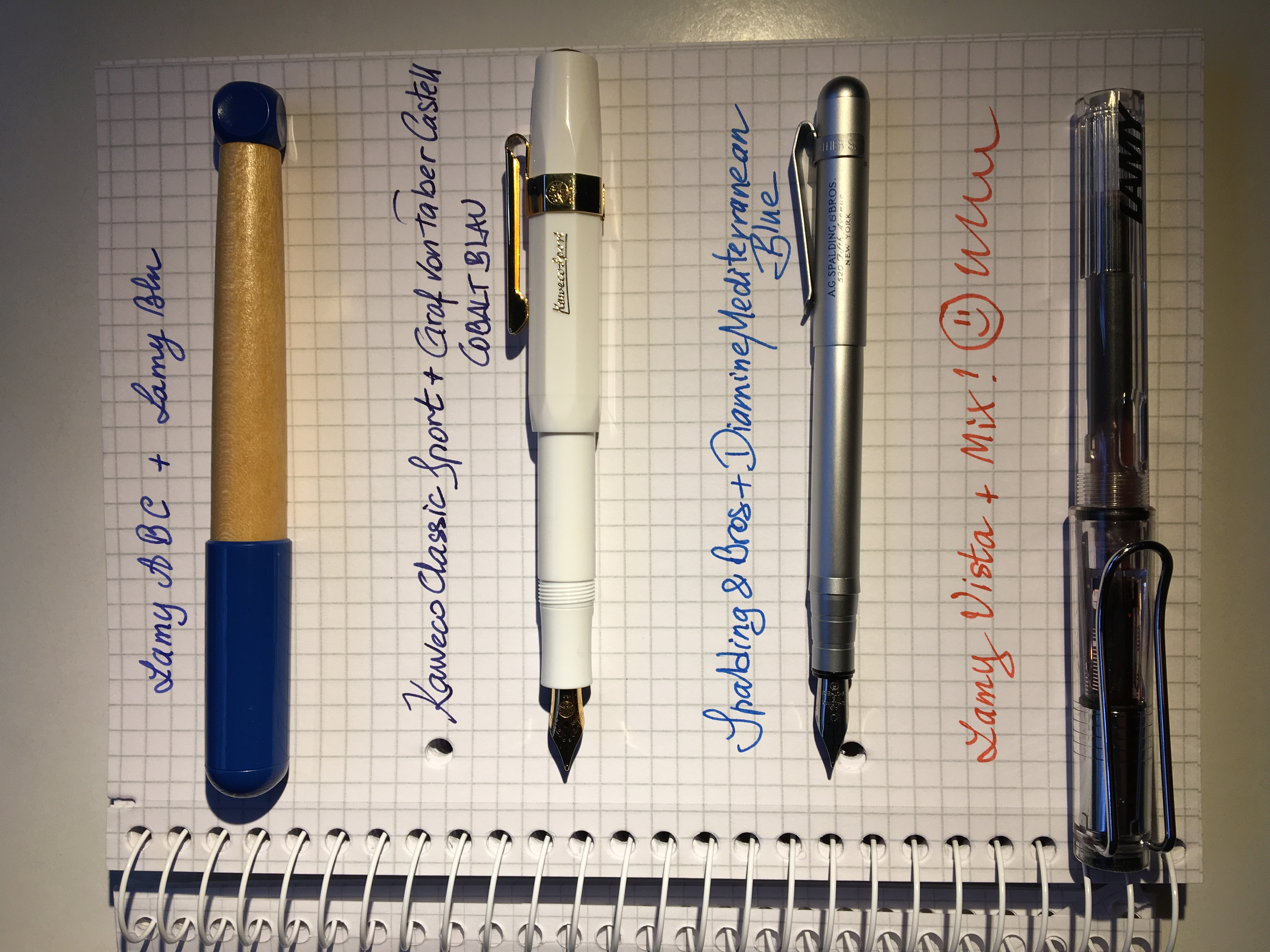 attualmente porto con me una Lamy ABC blu (inchiostro Lamy blu), una Kaweco Classic Sport bianca (Graf von Faber Castell Cobalt Blu), una Spalding & Bros. mini (Diamine Mediterranean Blue) e una Lamy Vista con inchiostro mixato: in origine c'era una cartuccia di Lamy Coral, poi finito questo inchiostro, senza nemmeno risciacquare (che brutalità vero?!?...