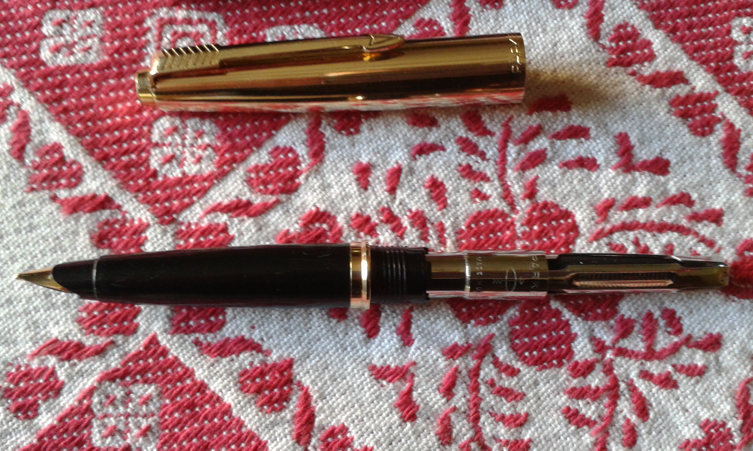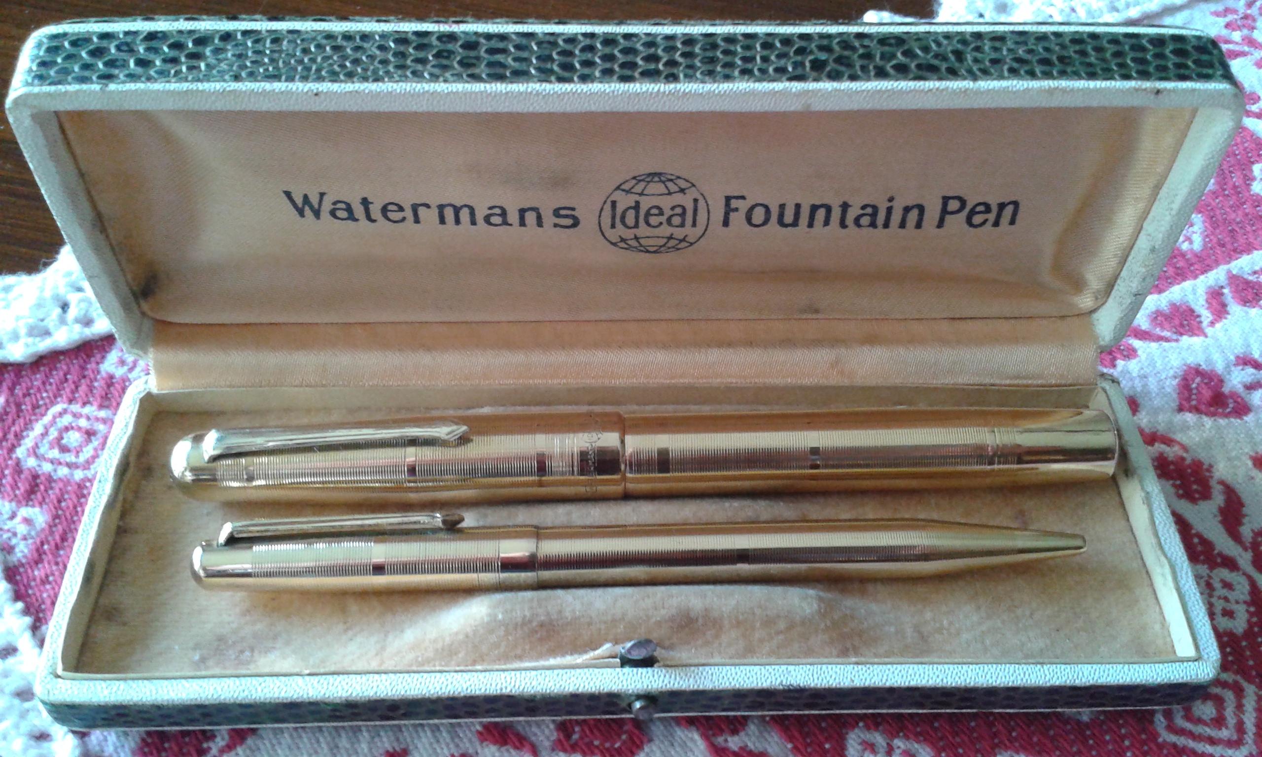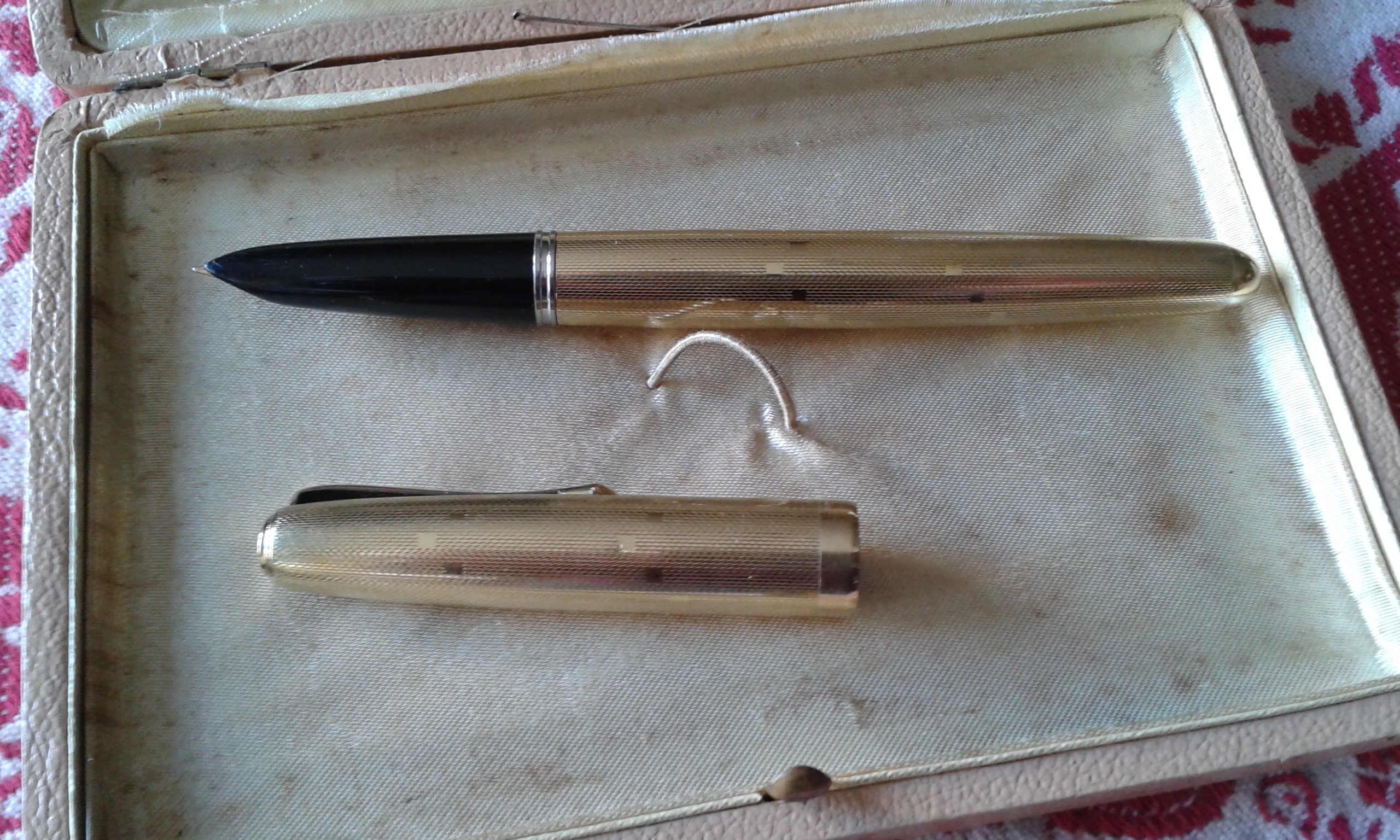 Vi presento i miei nuovi arrivi: Parker 45 pennino oro e converter in buone condizioni; parure stilo e mina Waterman Ideal oro con scatola in buone condizioni (ignoro il modello); Parker 51 laminata oro (laminatura credo Italiana), in buone condizioni con scatola; Pelikan 140 in ottime condizioni; stiloforo anonimo con pennino placcato oro Omas, caricamento pulsante di fondo in buone condizioni; infine set Pelikan Calligraphy, con stiloforo, confezione con tre boccette inchiostro e due pennini per calligrafia, tutto seminuovo.