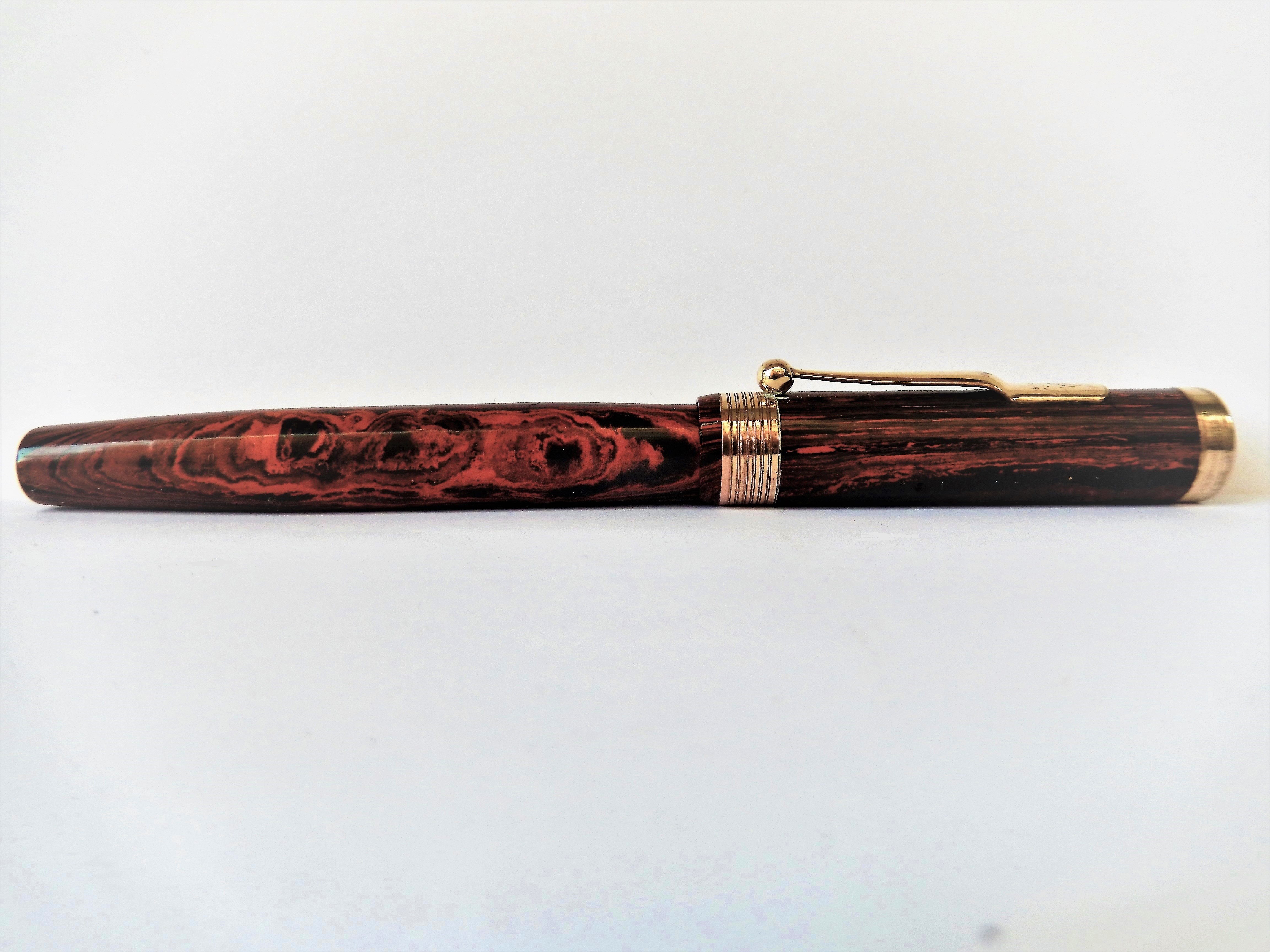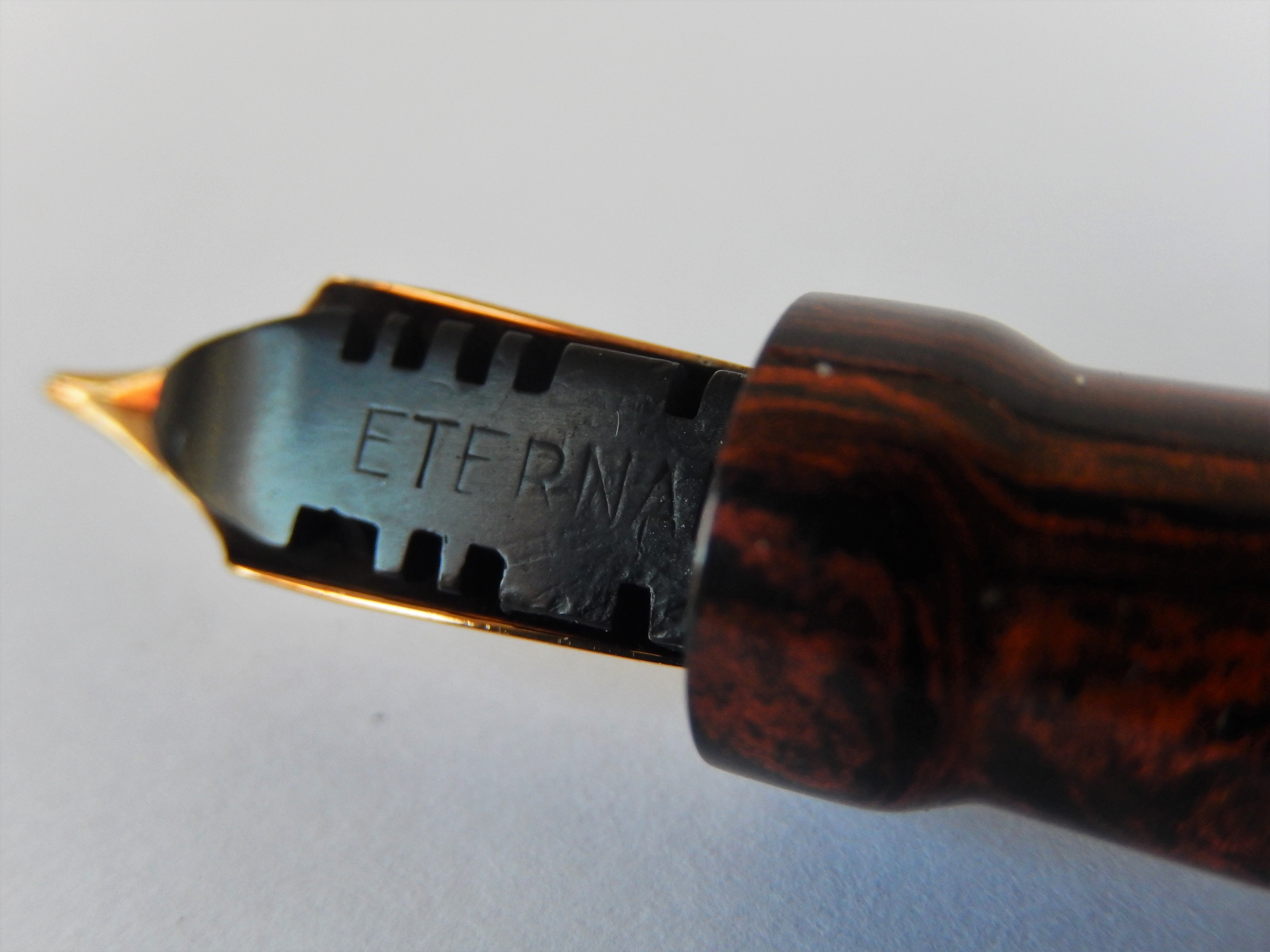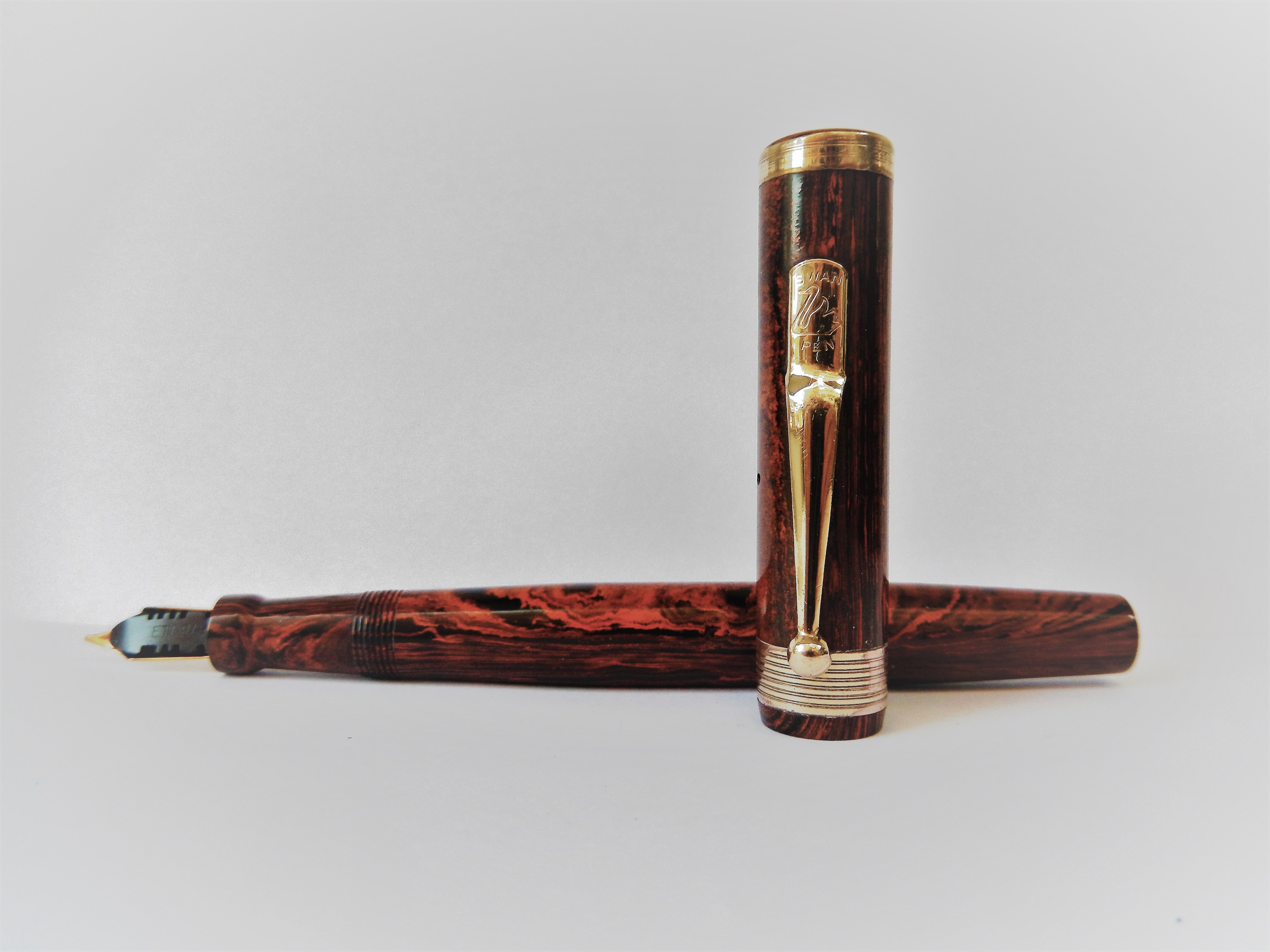 Il marchio era stato infatti nel 1915 ceduto dalla originaria proprietà americana alla finanziariamente più solida filiale inglese, avviandosi così a divenire il marchio di quella che fu poi definita " la stilografica dell'impero ". Rinviando per la gloriosa storia della casa alla bellissima trattazione che ne fa il nostro wiki, mi limito a ricordare che comunque lo stabilimento americano continuò a produrre ancora fino a dopo il 1930 ed è per questo che del modello oggi in presentazione, la Eternal, possiamo trovare sia esemplari prodotti negli Stati uniti che in Inghilterra. La Eternal, che in quegli anni fu il modello di punta della casa, già nel nome rivela la volontà di essere la risposta alla garanzia a vita offerta dal white dot della Sheaffer; il modello fu immesso sul mercato intorno al 1924, prima in ebanite e poi successivamente, intorno al 1927, anche in bellissime celluloidi colorate. Questo in presentazione è un esemplare prodotto in Inghilterra in una ebanite mottled che ancora oggi mantiene grande fascino.