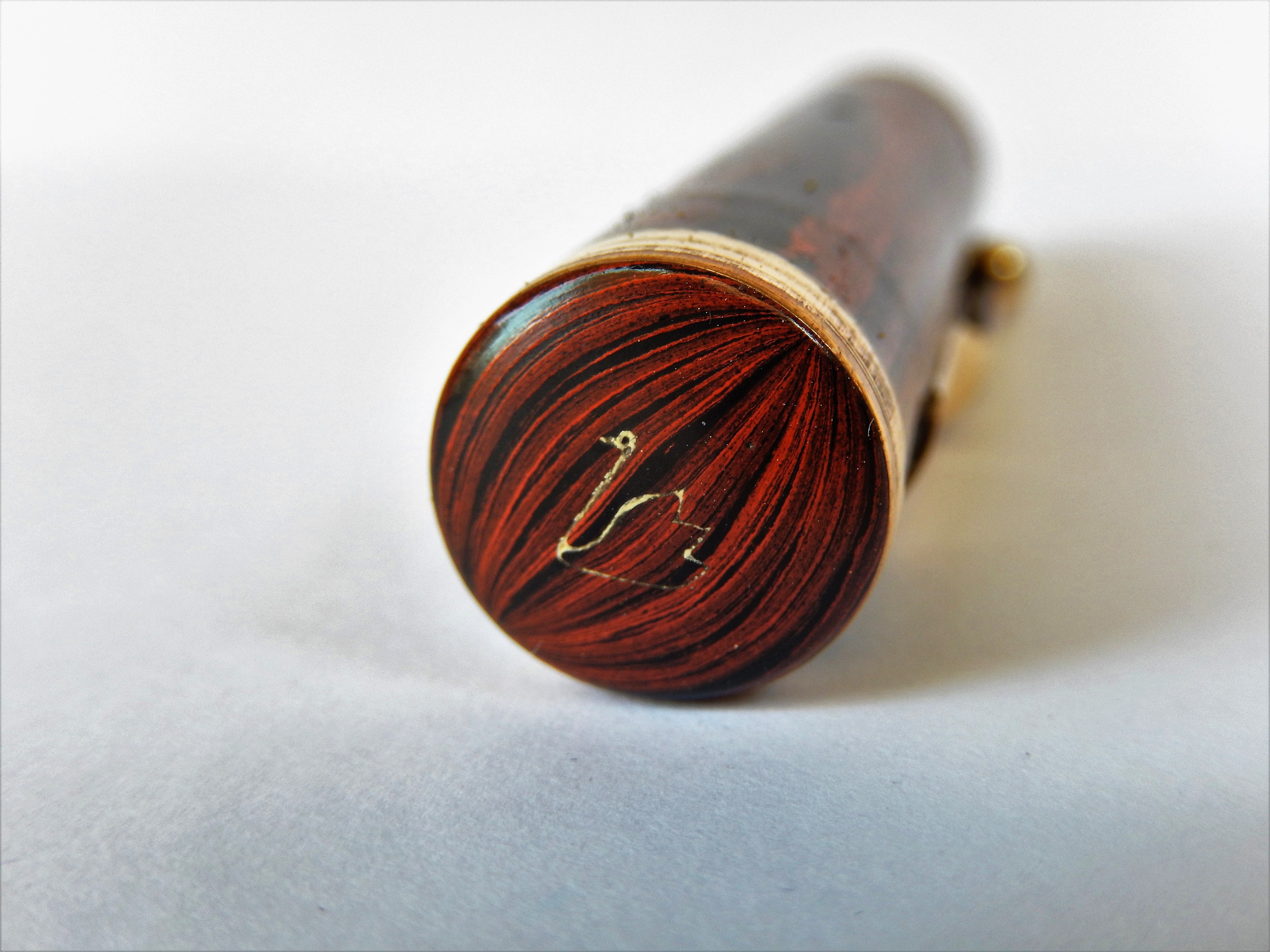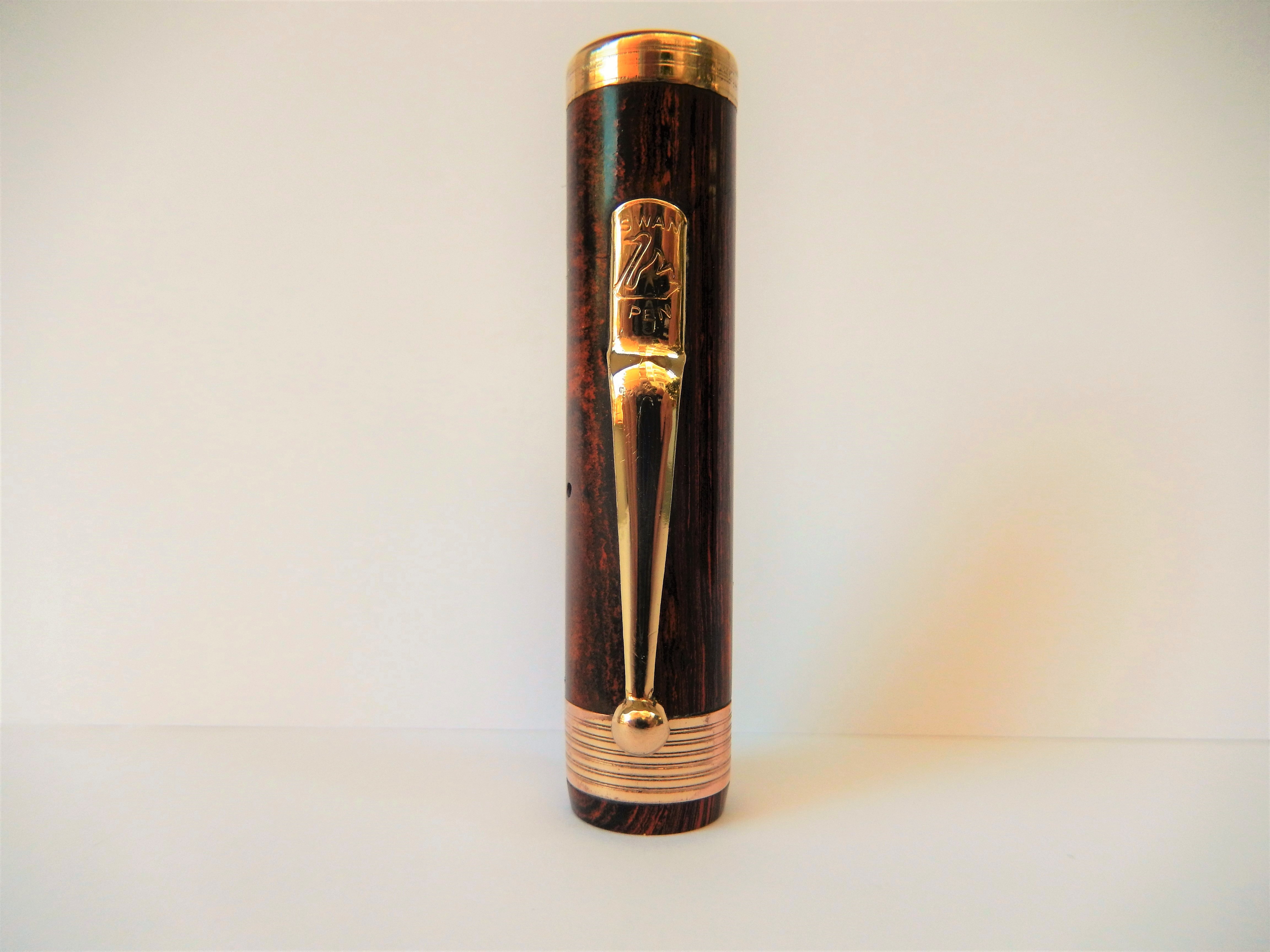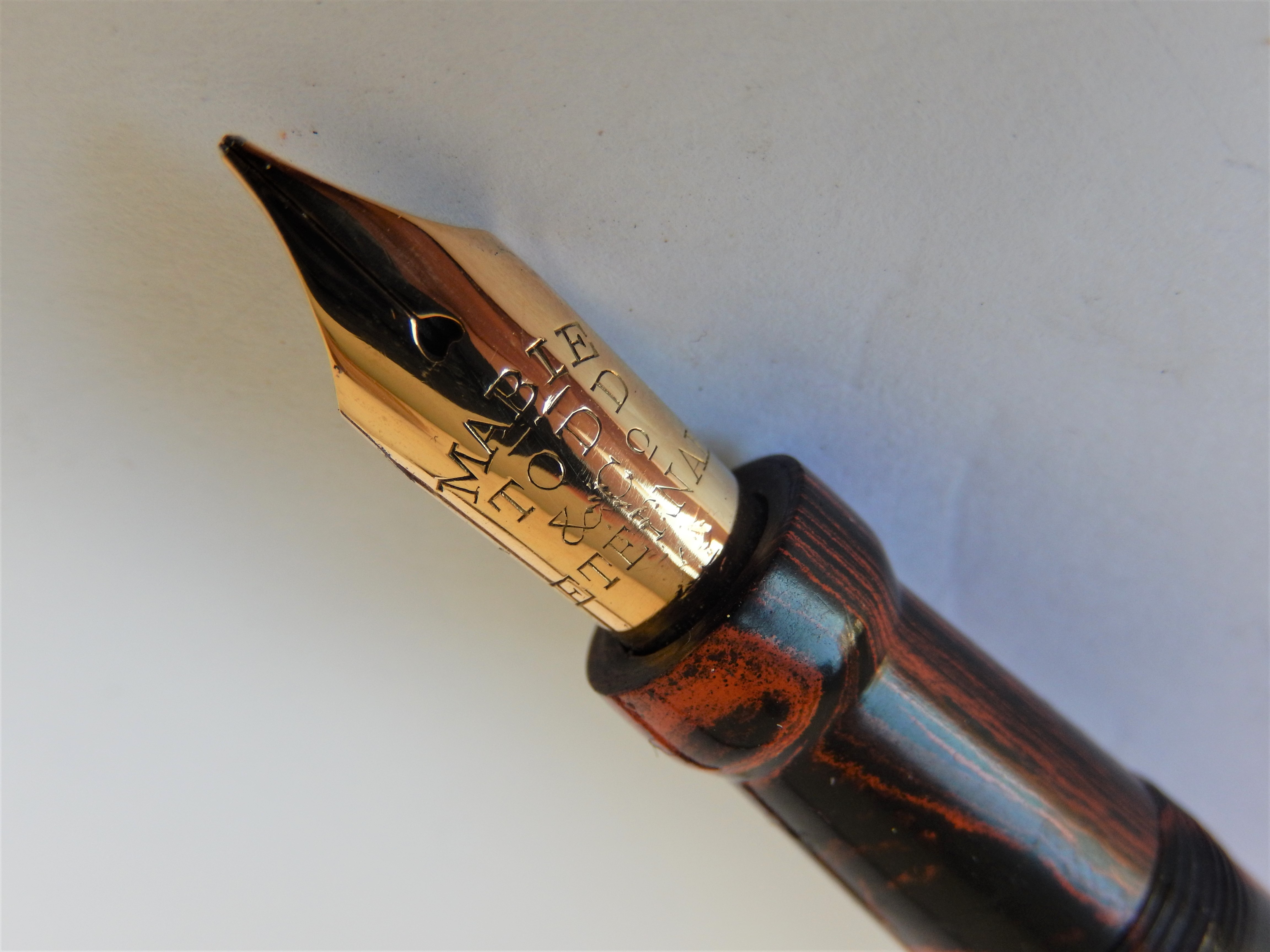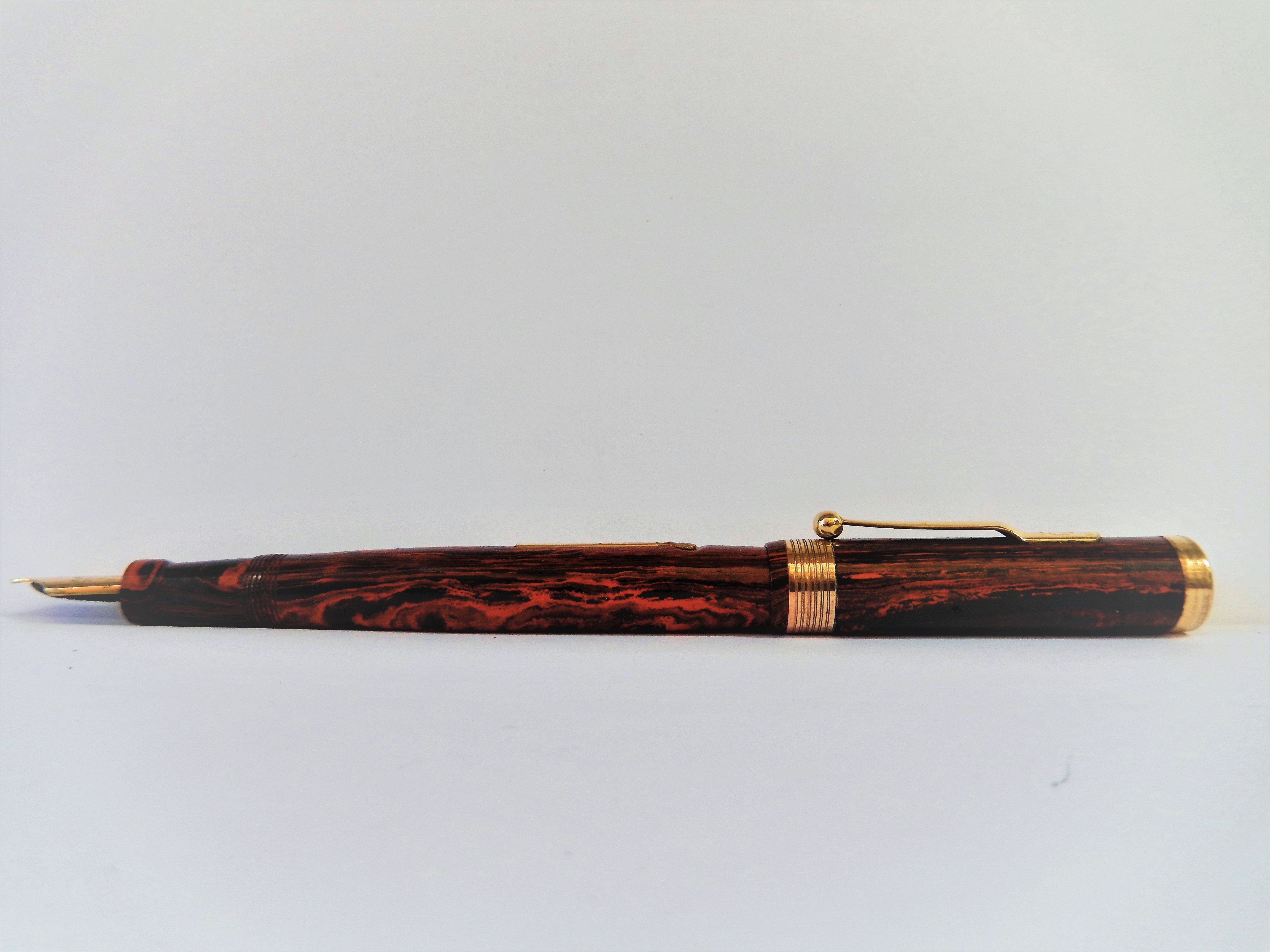 Il marchio era stato infatti nel 1915 ceduto dalla originaria proprietà americana alla finanziariamente più solida filiale inglese, avviandosi così a divenire il marchio di quella che fu poi definita " la stilografica dell'impero ". Rinviando per la gloriosa storia della casa alla bellissima trattazione che ne fa il nostro wiki, mi limito a ricordare che comunque lo stabilimento americano continuò a produrre ancora fino a dopo il 1930 ed è per questo che del modello oggi in presentazione, la Eternal, possiamo trovare sia esemplari prodotti negli Stati uniti che in Inghilterra. La Eternal, che in quegli anni fu il modello di punta della casa, già nel nome rivela la volontà di essere la risposta alla garanzia a vita offerta dal white dot della Sheaffer; il modello fu immesso sul mercato intorno al 1924, prima in ebanite e poi successivamente, intorno al 1927, anche in bellissime celluloidi colorate. Questo in presentazione è un esemplare prodotto in Inghilterra in una ebanite mottled che ancora oggi mantiene grande fascino.