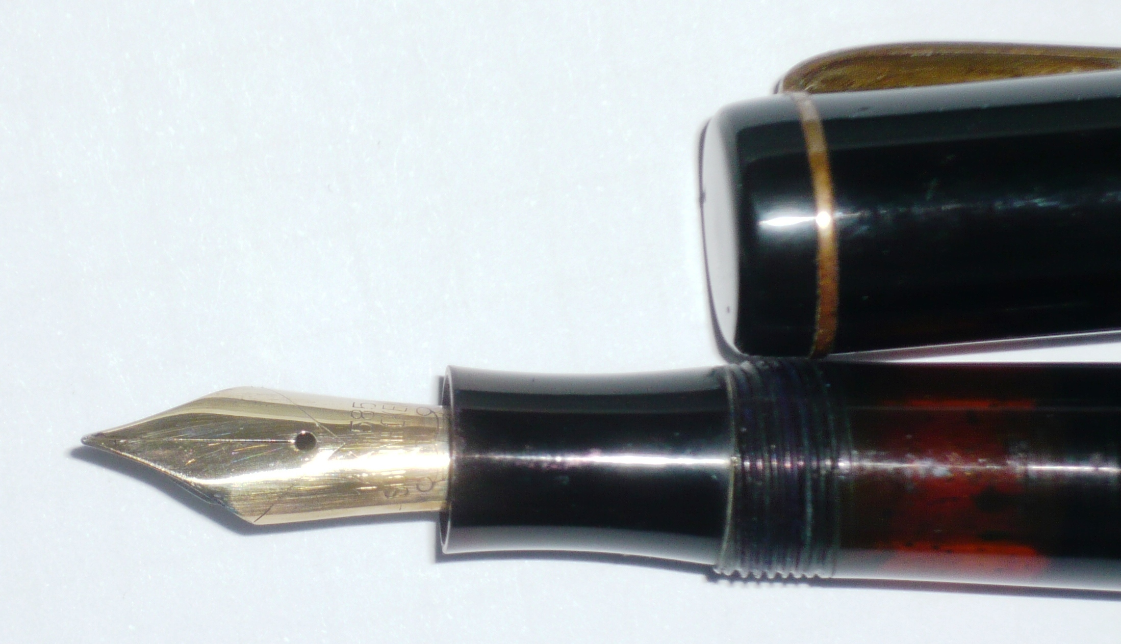 Buongiorno a tutti. Mi è appena arrivata questa penna e ve la fotografo senza nemmeno averle dato una ripulita, ma quando ho visto che pennino ha mi sono eccitato e volevo subito condividerla con voi! Più flessibile di una vecchia Omas che anche lei non scherzava affatto. Il problema è che non so cosa ho comprato. Una 510? Anche il venditore non mi ha aiutato nell'identificazione. Qualcuno di voi sa qualcosa? La penna, chiusa, è lunga circa 118mm, il tappo 54mm, solo il corpo dalla punta del pennino alla base dello stantuffo 115mm, il diametro del fusto circa 12mm. Un grazie a chiunque sappia dirmi qualcosa in merito. Ah, dimenticavo, il pennino è un EF, come indicato anche sulla manopola del pistone.