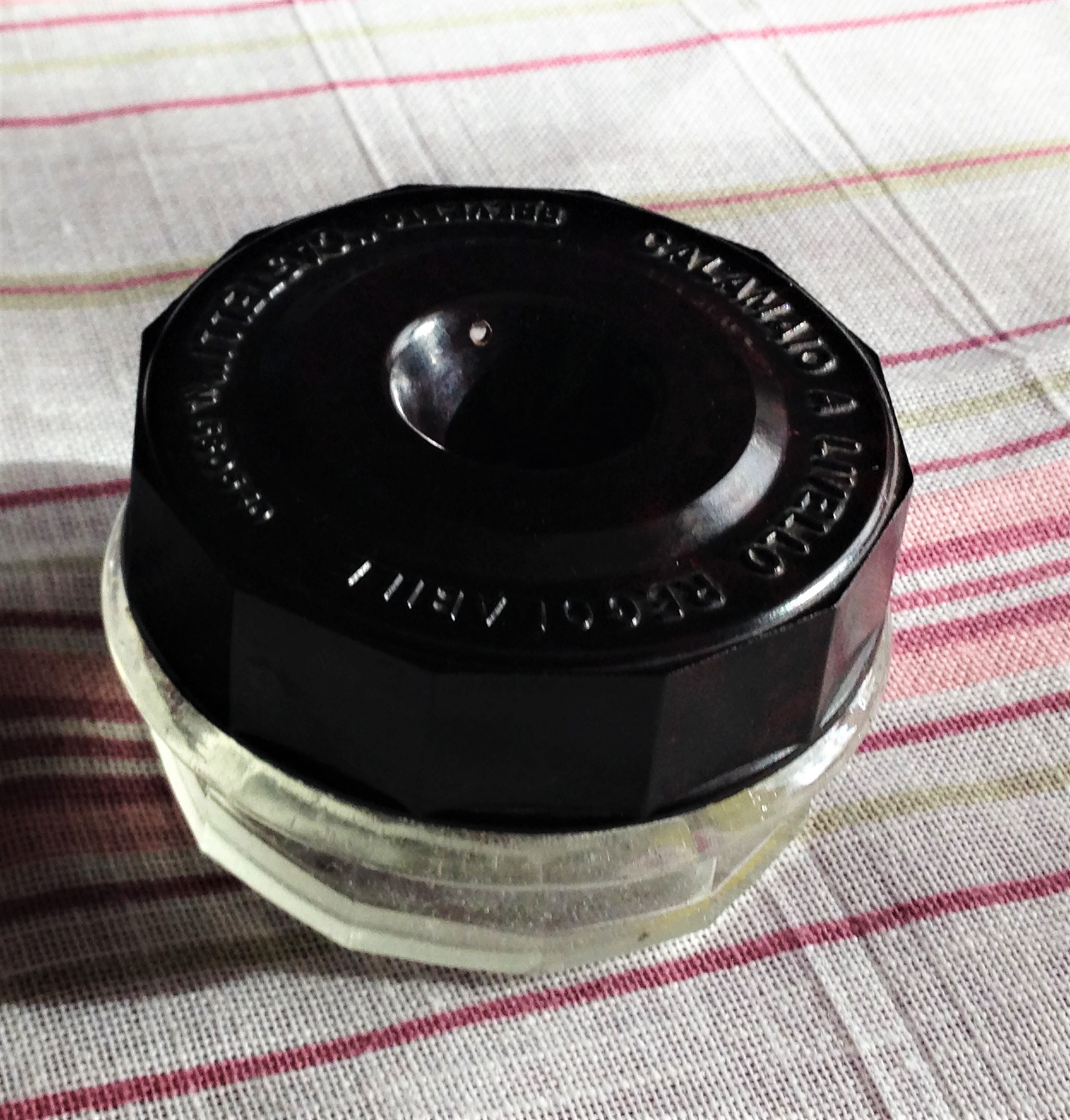 E' un calamaio da banco di scuola, quelli che si mettevano nell'apposito foro e che il bidello passava a riempire tutte le mattine, non ha nessun valore né una particolare bellezza, è solo un ritorno alla monella che regolarmente imbrattava i quaderni con macchie d'inchiostro e nel cercare di cancellare i disastri finiva col fare i buchi :oops: