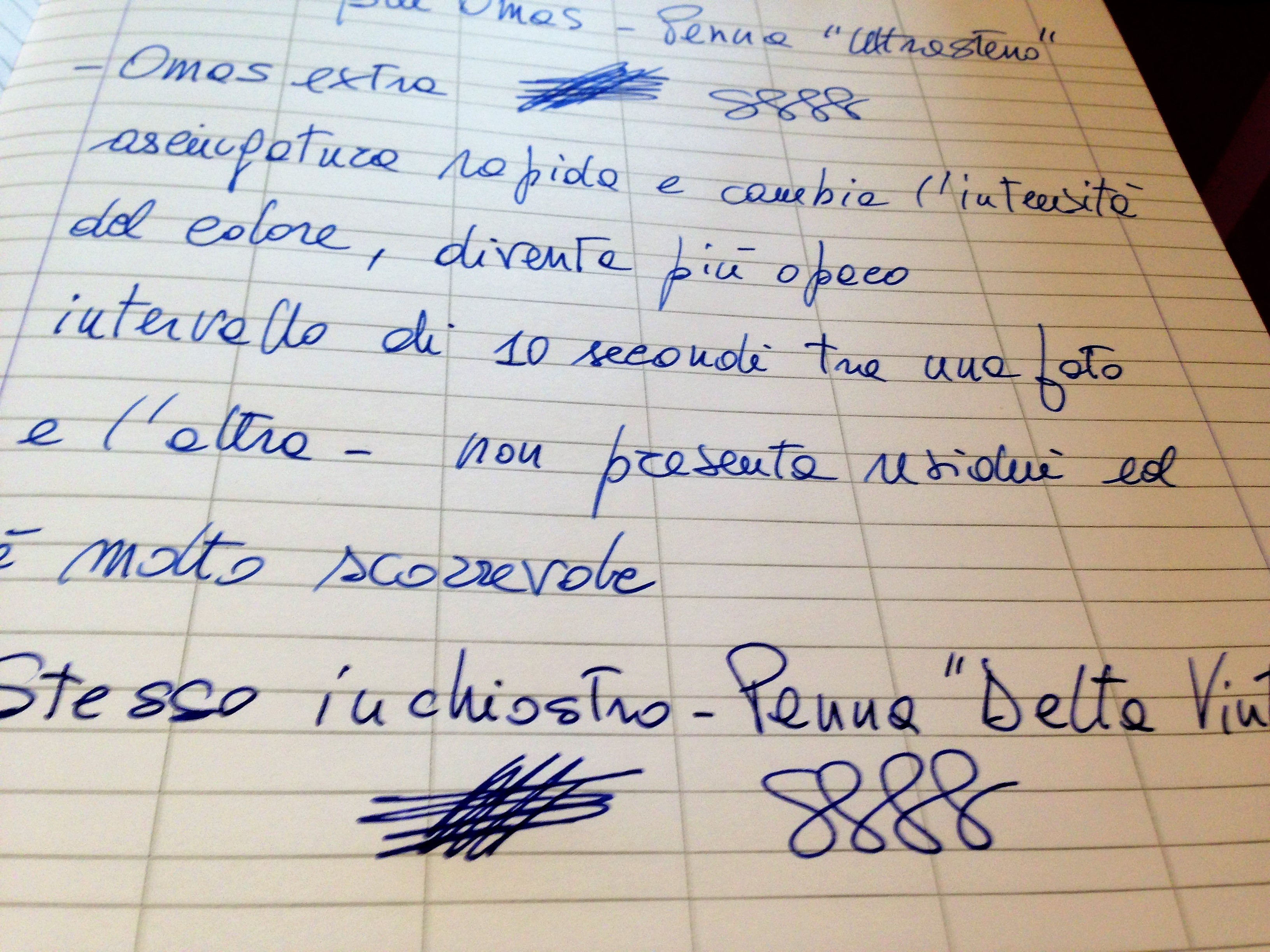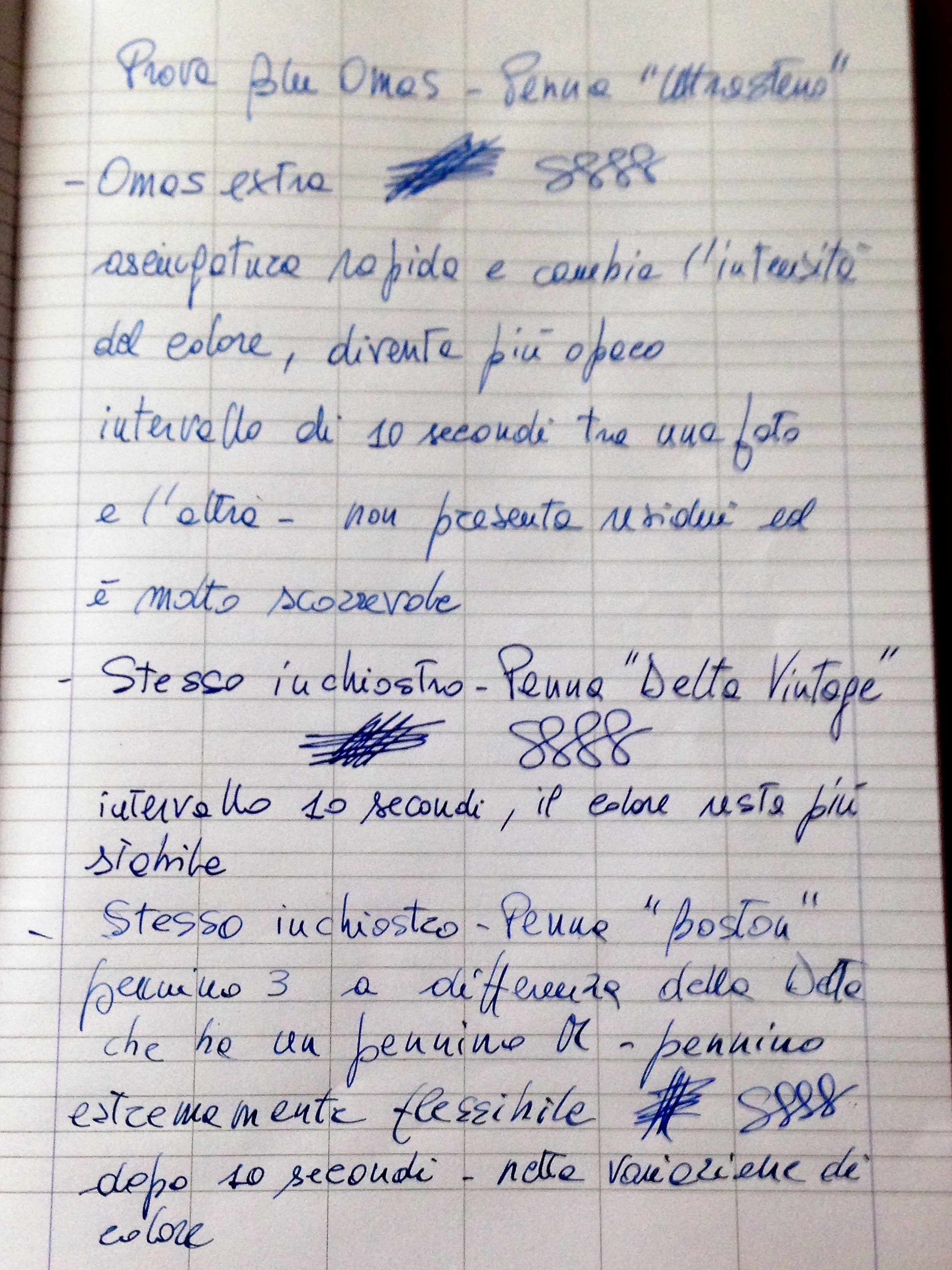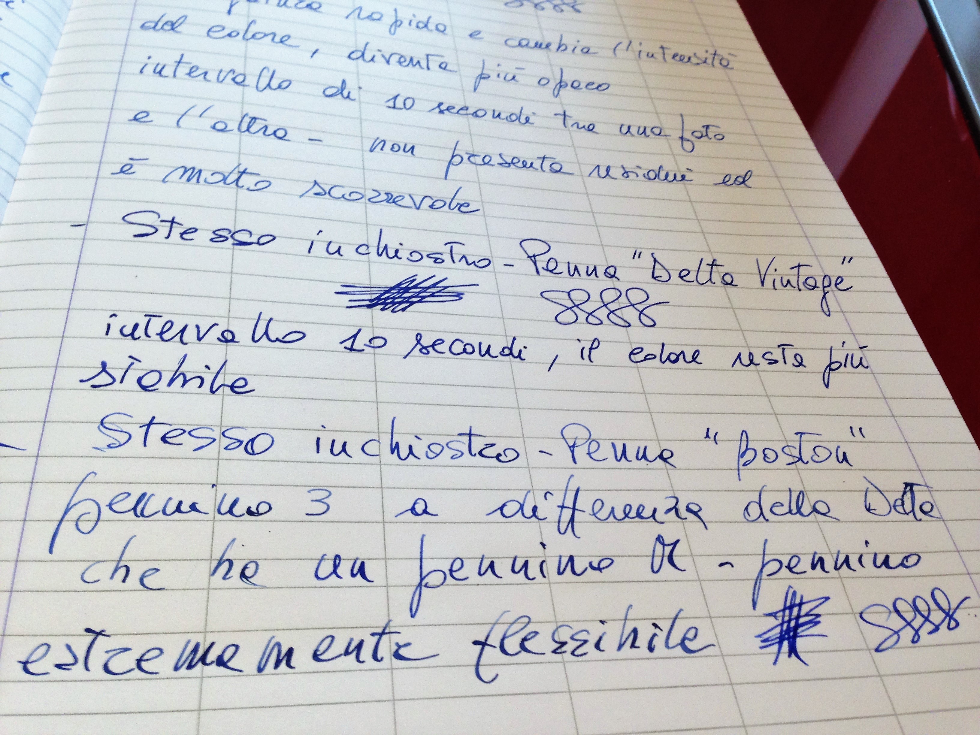 Avevo già provato i due inchiostri e cromaticamente sono identici, entrambi perfettamente conservati senza tracce di residui, tanto che ho caricato con tranquillità la Delta Vintage Bianca che sto usando, è carica da venerdì, se ne sta tranquillamente sul tavolo in orizzontale, la uso per tutti gli appunti e riparte senza nessuna indecisione, come vedrai dalle foto è una delle penne che ho usato per fare le prove, le altre due penne sono state usate per intinzione.