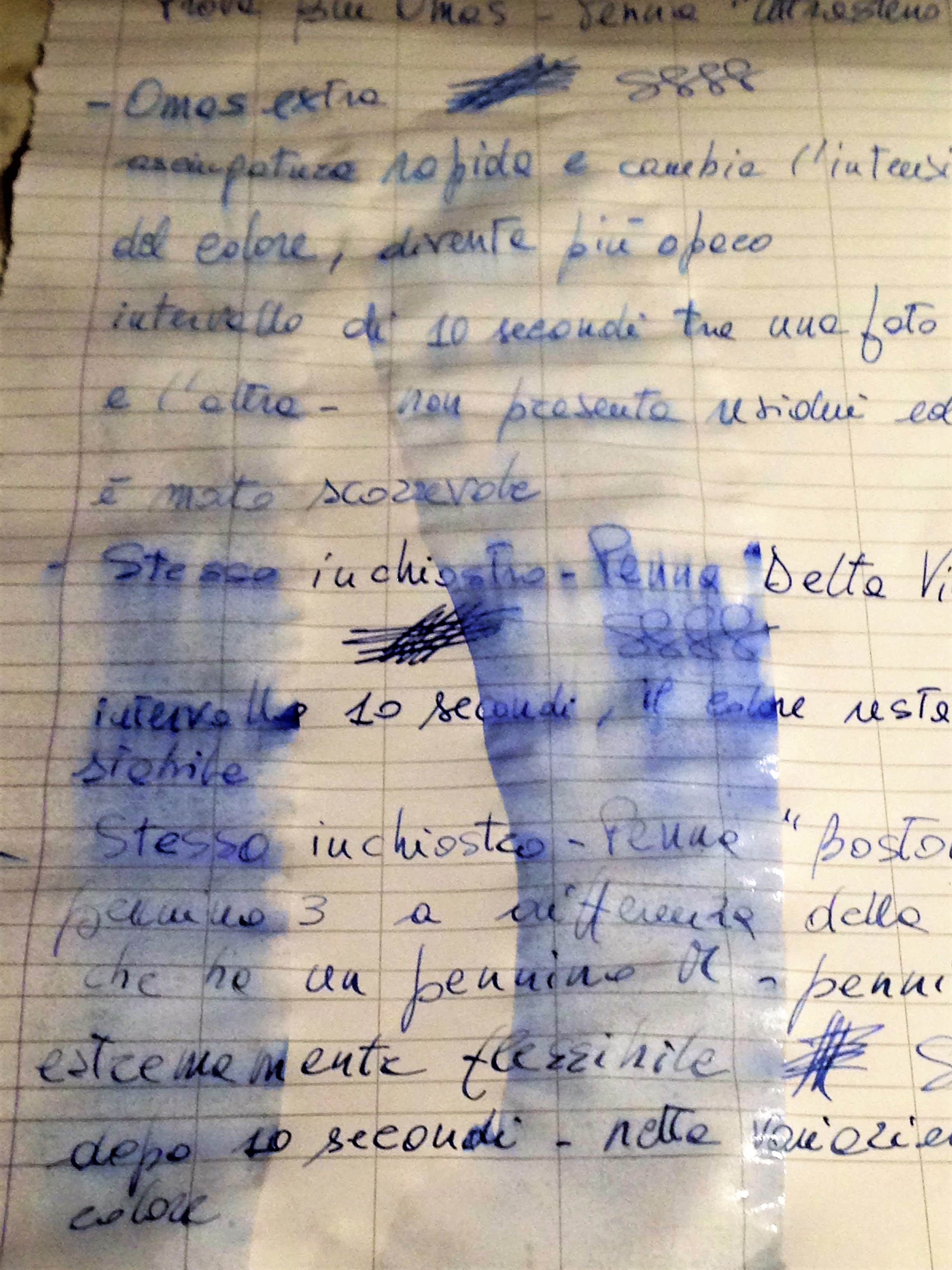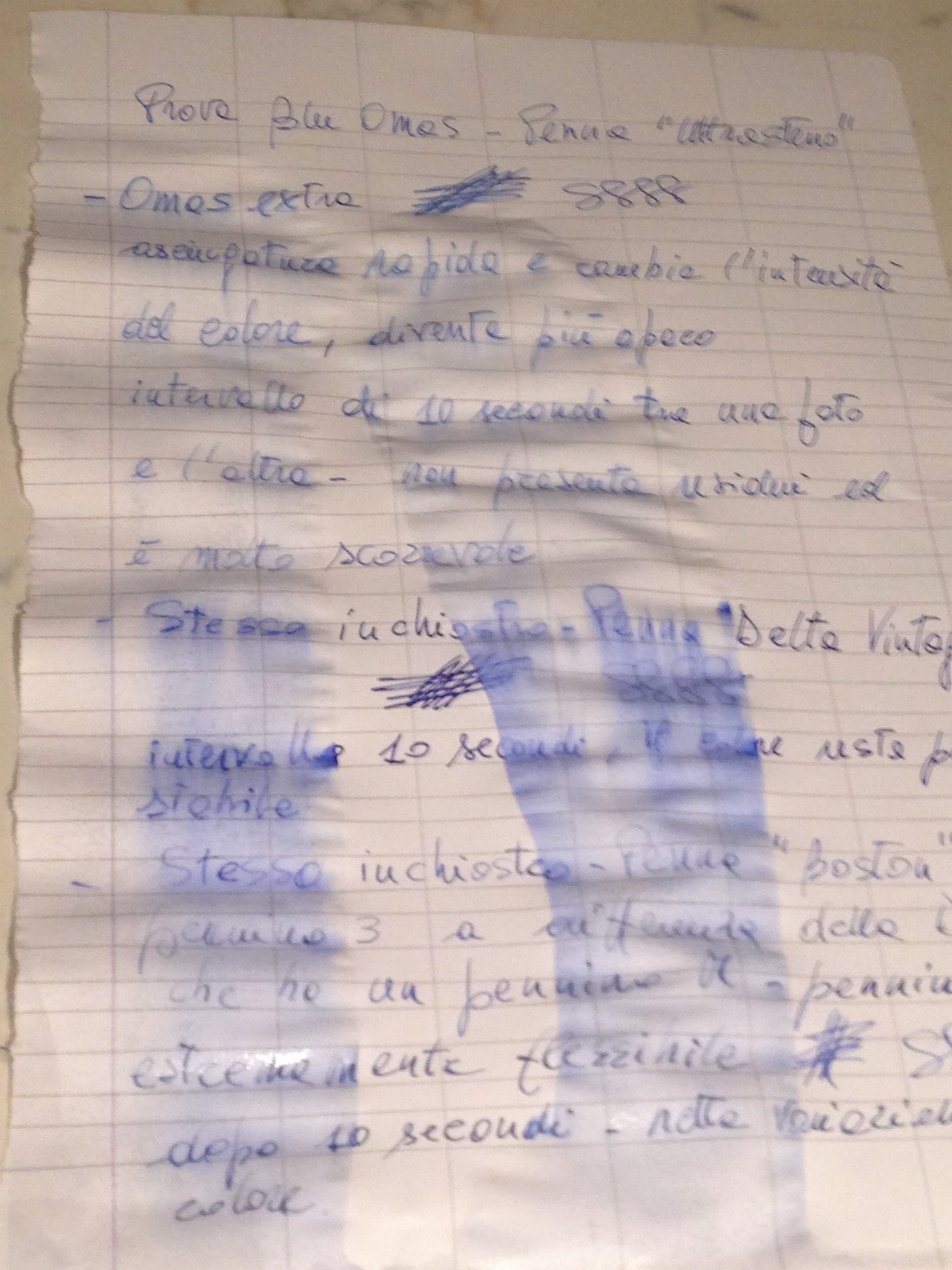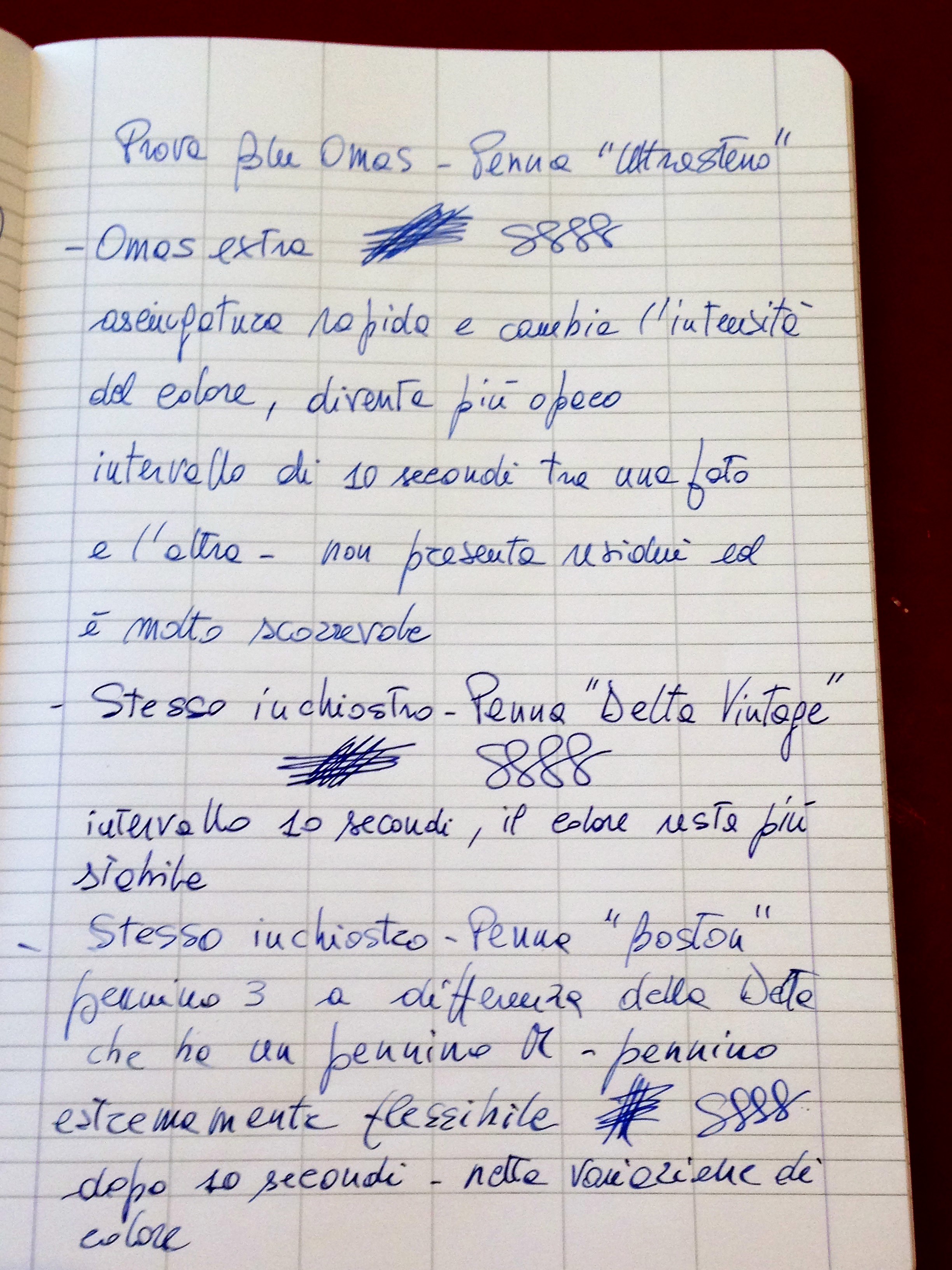Avevo già provato i due inchiostri e cromaticamente sono identici, entrambi perfettamente conservati senza tracce di residui, tanto che ho caricato con tranquillità la Delta Vintage Bianca che sto usando, è carica da venerdì, se ne sta tranquillamente sul tavolo in orizzontale, la uso per tutti gli appunti e riparte senza nessuna indecisione, come vedrai dalle foto è una delle penne che ho usato per fare le prove, le altre due penne sono state usate per intinzione.