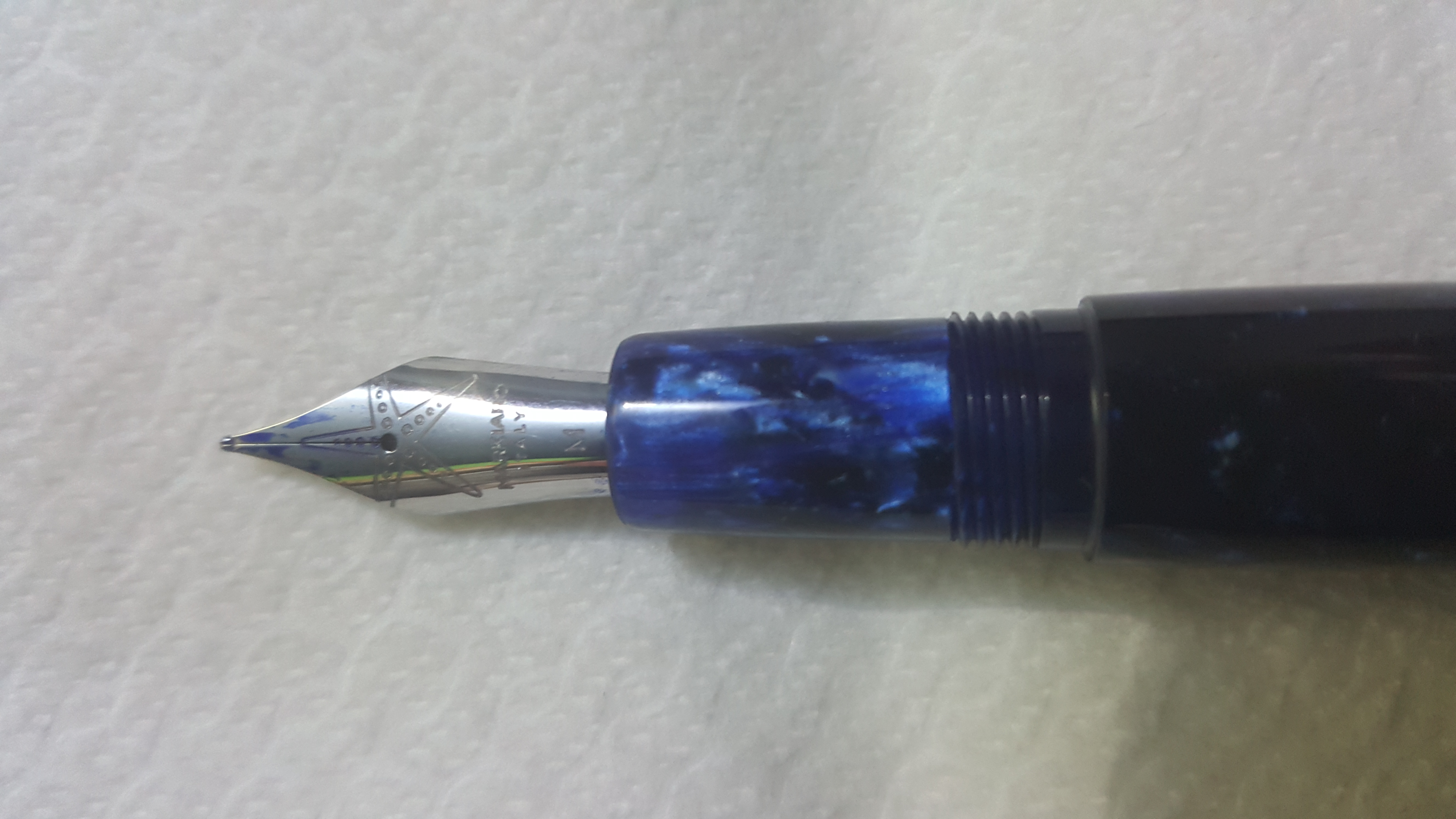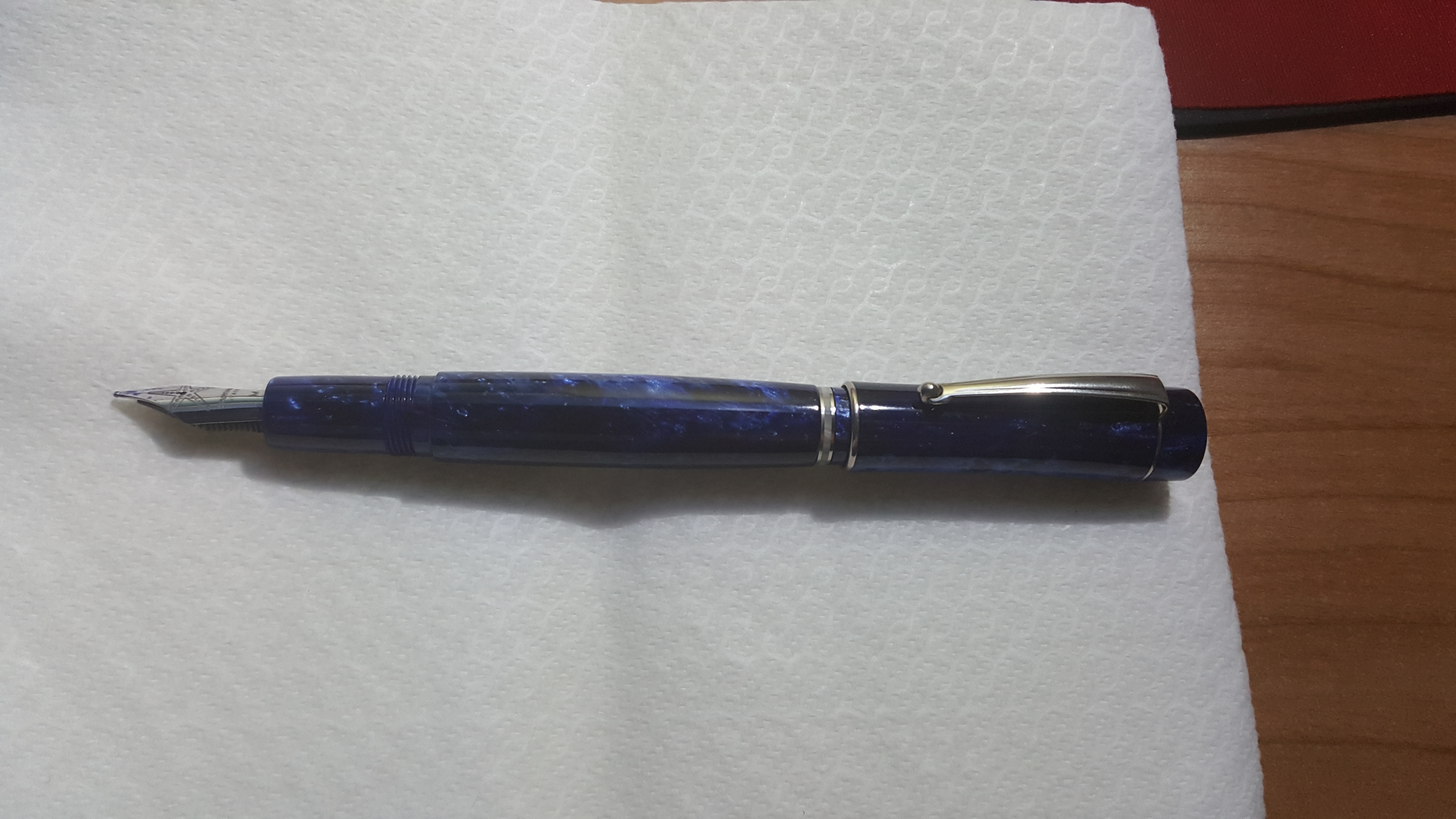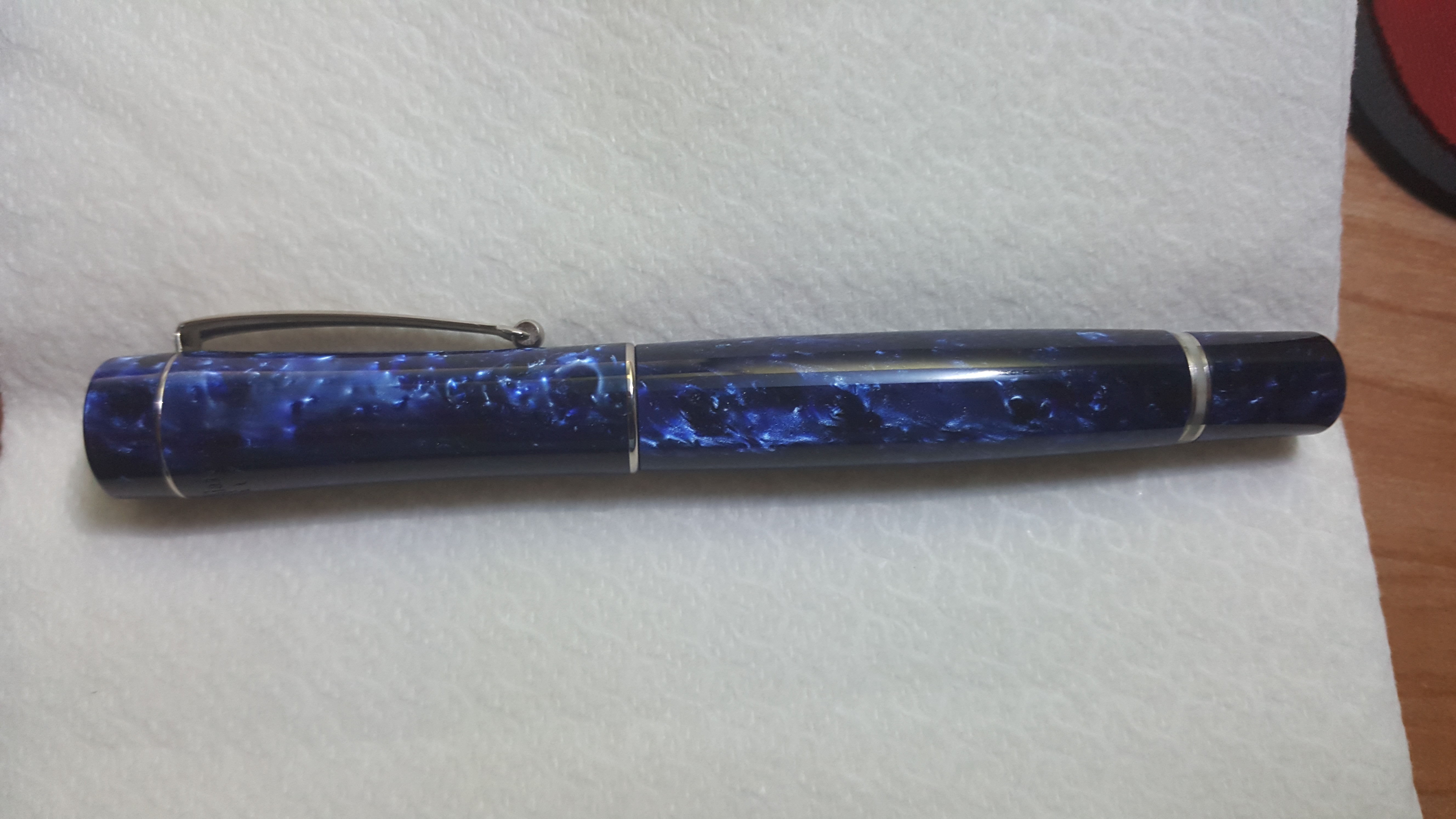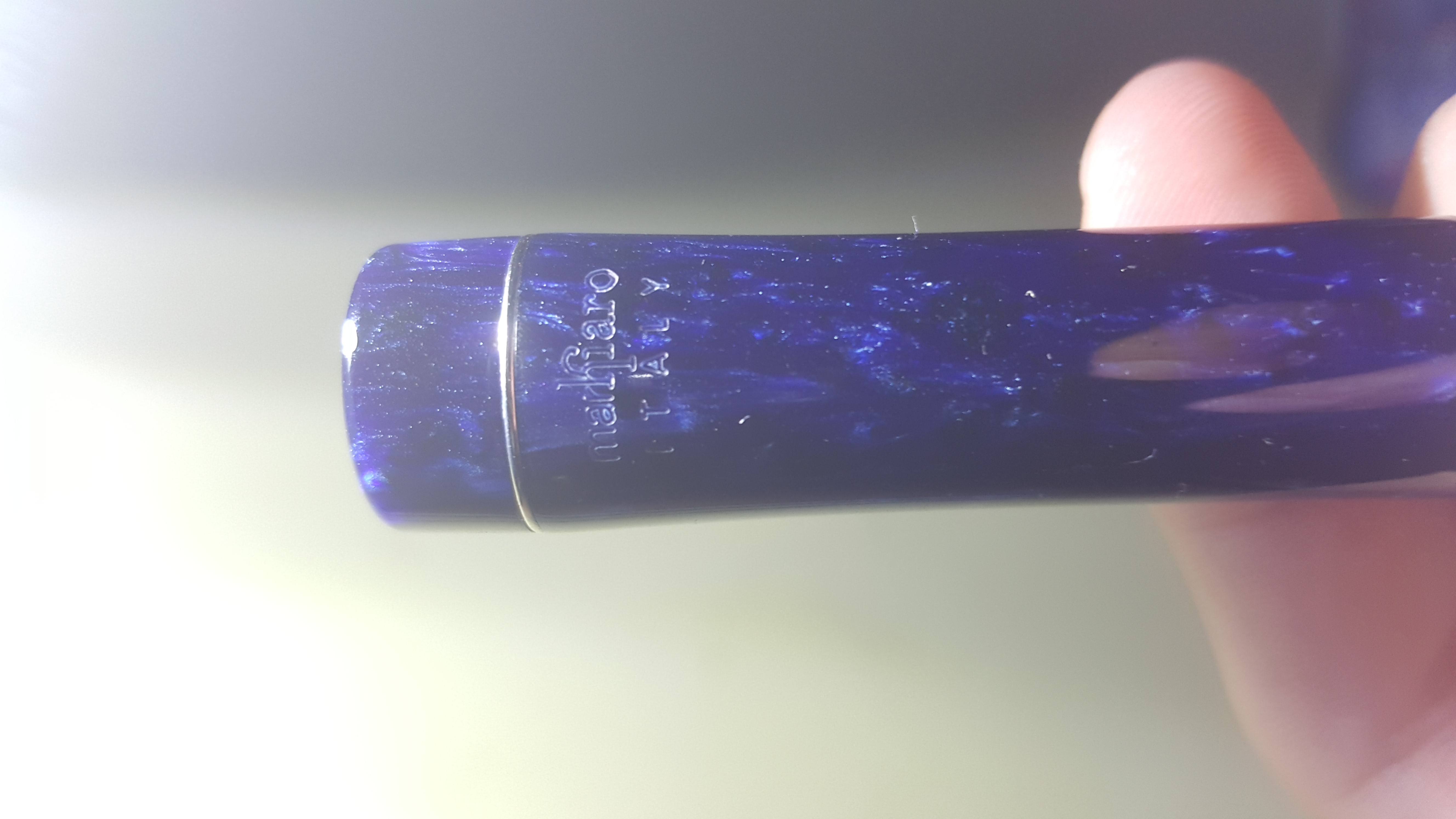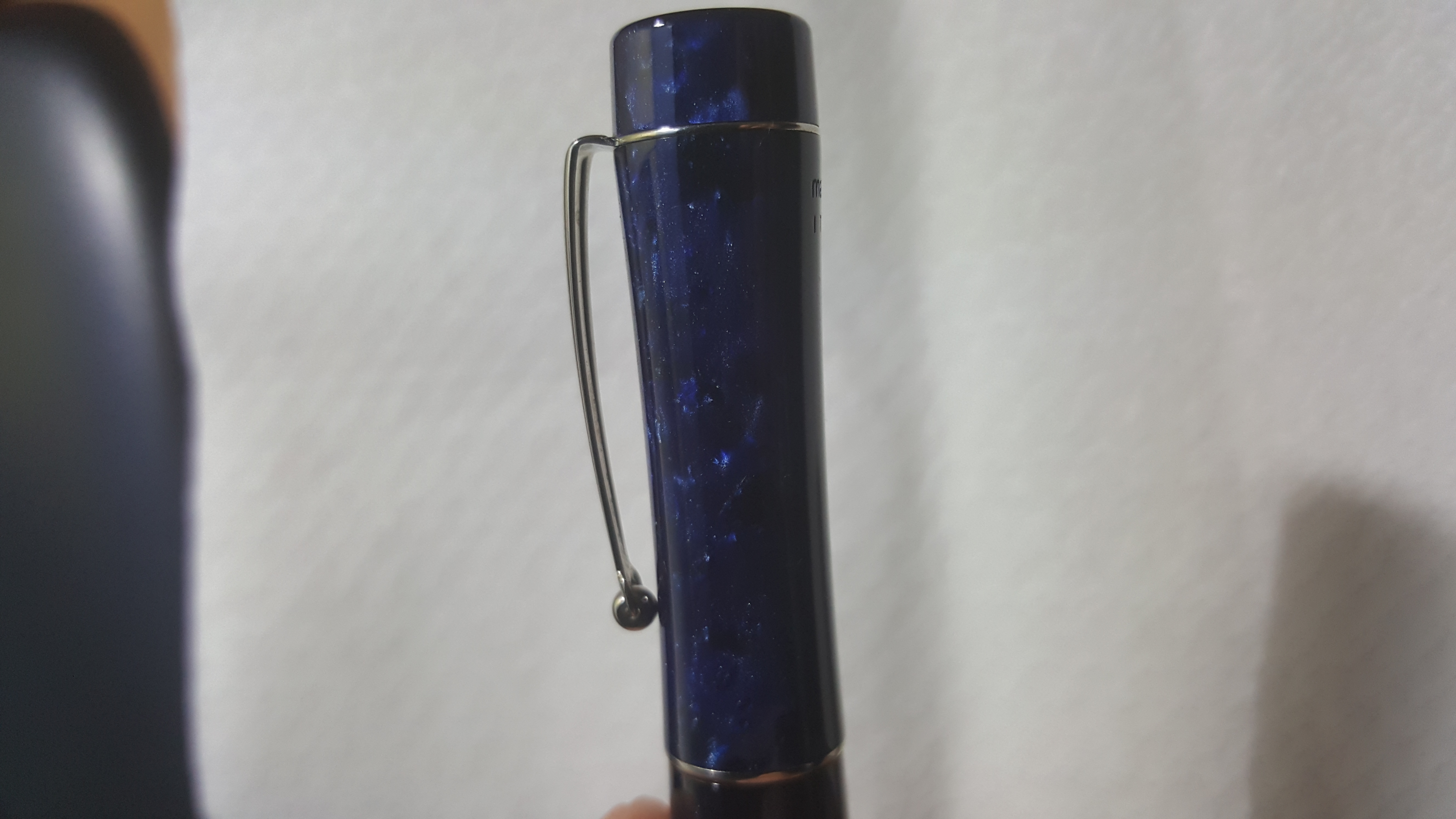 Tralasciando la presenza fastidiosa della mia mano nelle foto... direi che forse rendono almeno un decimo della bellezza di questa penna. Le sfumature di blu madreperlato della resina sono indescrivibilmente belle, ogni nuovo sguardo e ogni nuova illuminazione ne fanno scoprire qualcuna nuova.
