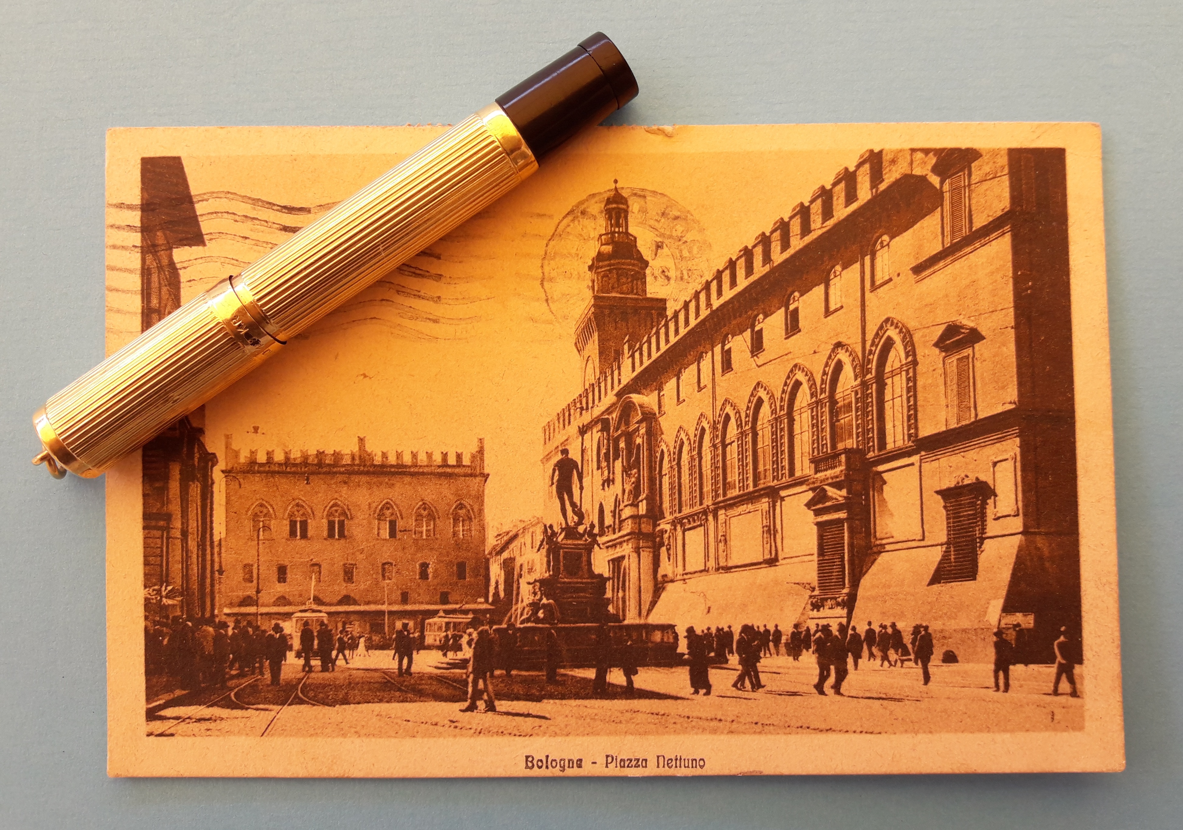 In questa sede gioverà almeno ricordare che il nome della Marca si deve alla volontà dei fondatori, i coniugi bolognesi Umberto Vecchietti e Ada Corazza, di onorare uno dei simboli storico-artistici più rilevanti della loro città: la Fontana del Nettuno, che dà il nome alla piazza omonima, opera rinascimentale del Giambologna (ovvero Jean de Boulogne, 1566), che qui vediamo rappresentata in una cartolina dei primi anni Venti (spedita nel 1926).