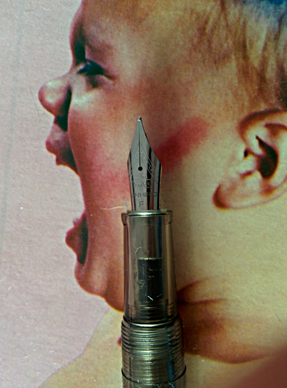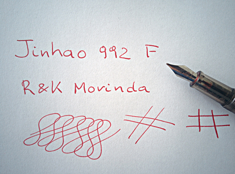 Qui una piccola sorpresa: il pennino vola leggero sulla carta, non sento grattare e sembra quasi di scrivere su una superficie imburrata. Il flusso e' OK, una volta caricata con R&K Morinda ha scritto senza problemi per una paginetta senza interruzioni anche accelerando i movimenti. Il tratto del pennino, marcato F, e' in realta' leggermente piu' spesso del F Lamy, mi aspettavo un tratto simile a quello della mia Wing Sung 698 F ma non e' cosi', e' piu' largo. Nessuna flessibilita' del pennino, ho provato a calcare un po' ma i rebbi del pennino se ne sono infischiati.