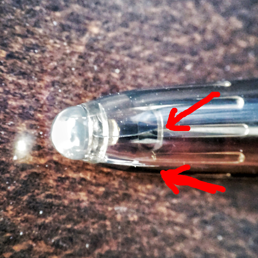 Dopo aver usato questa Jinhao 992 per alcune settimane l'ho lavata e nell'ispezionarla ho scoperto due crepe all'estremita' del corpo. Nella foto si possono vedere abbastanza bene, nonostante la qualita' bassa: