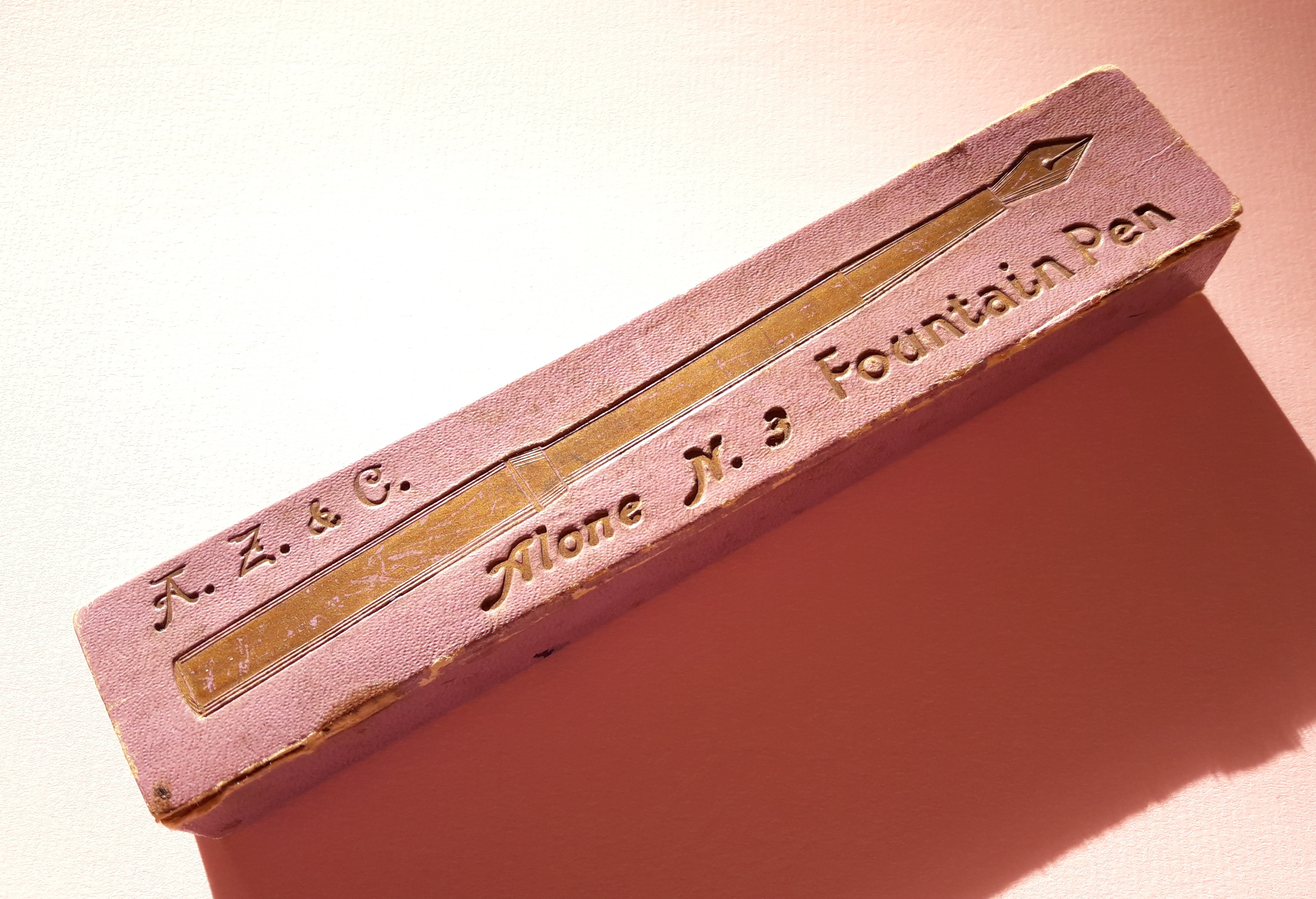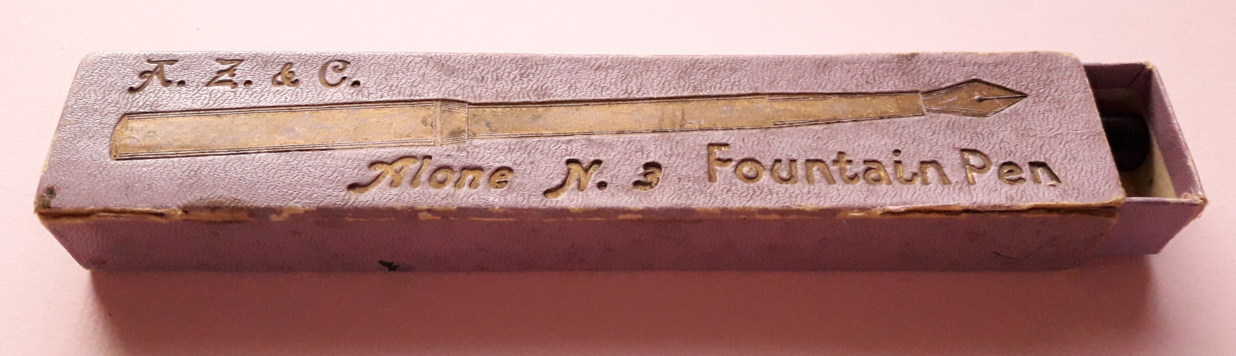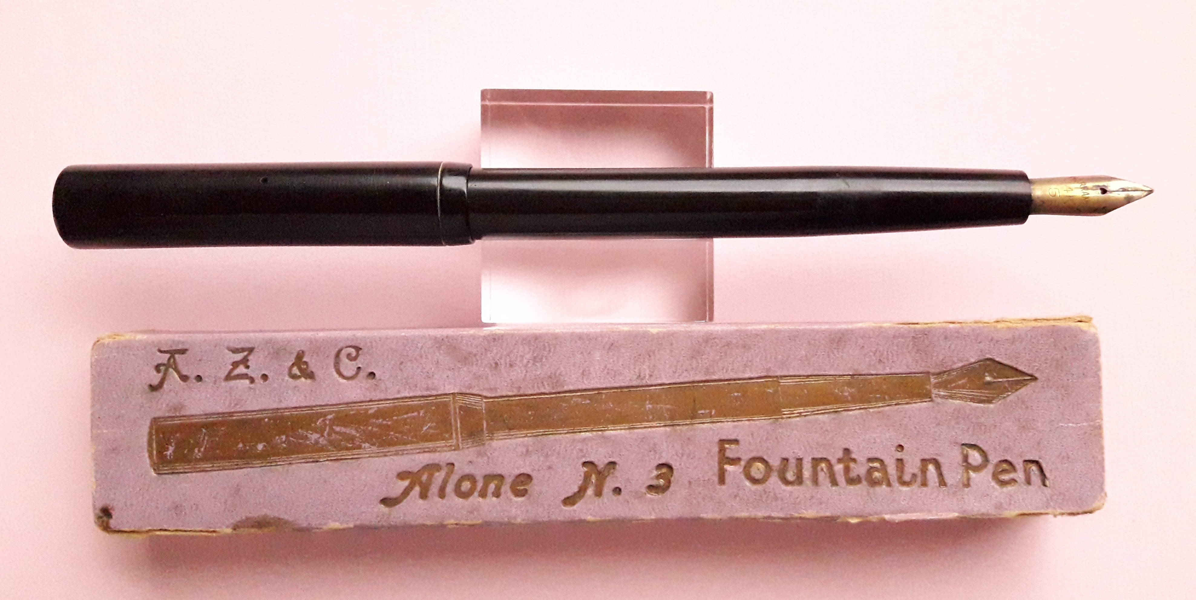 Io non so dirti se sia davvero attribuibile alla A. Zanaboni, non vi è traccia di nessun marchio assegnato a questa ditta, ne niente che corrisponda ad "Alone" nel database dei marchi. Per cui resteremo sempre con l'incertezza su quell'A.Z.&C. ma la penna è senz'altro di ottima qualità, e la confezione davvero raffinata, chiunque l'abbia prodotta, non stava realizzando un prodotto tirato via. Speriamo che si trovino ulteriori tracce, e la tua penna non resti ... "alone".