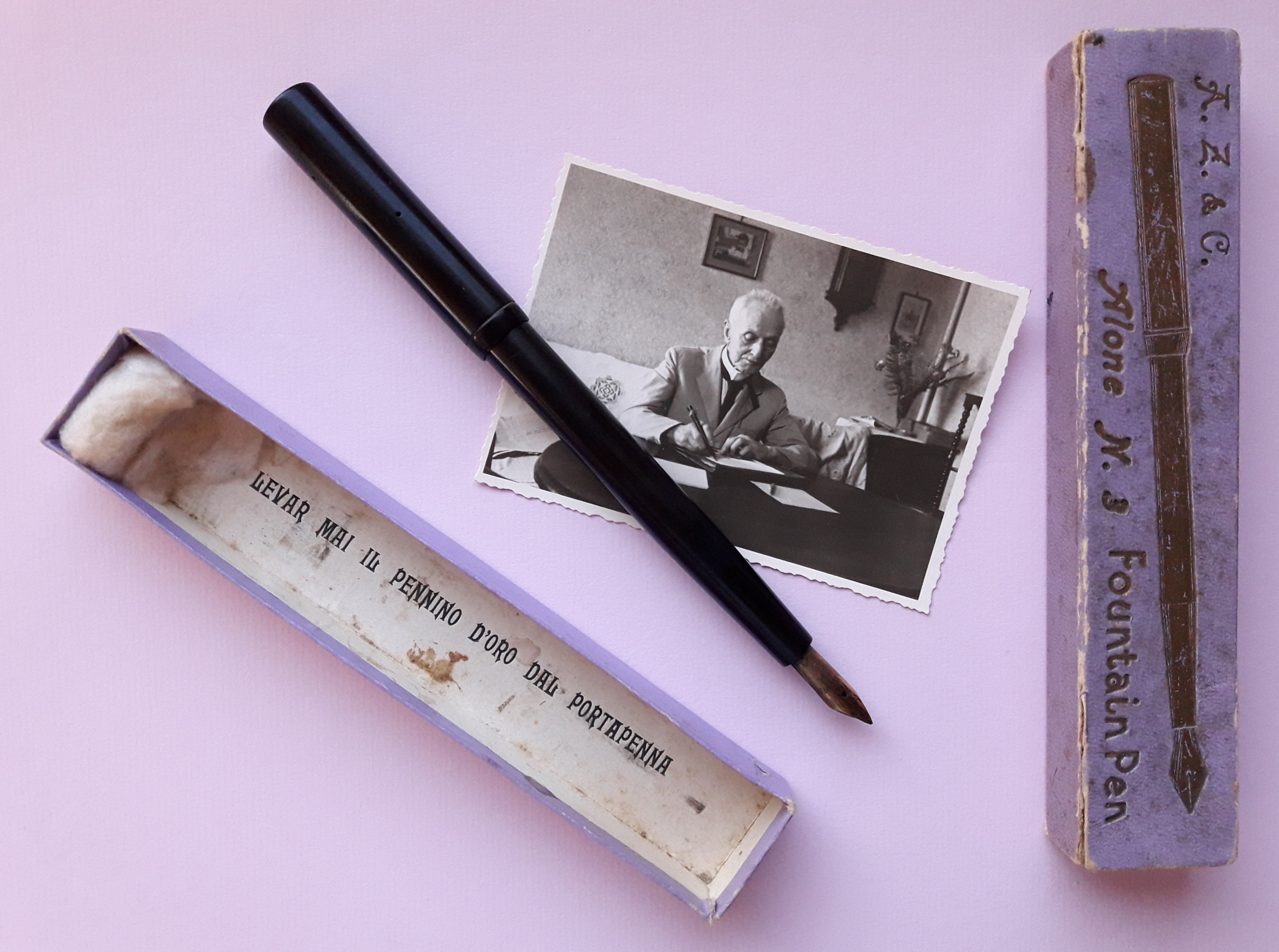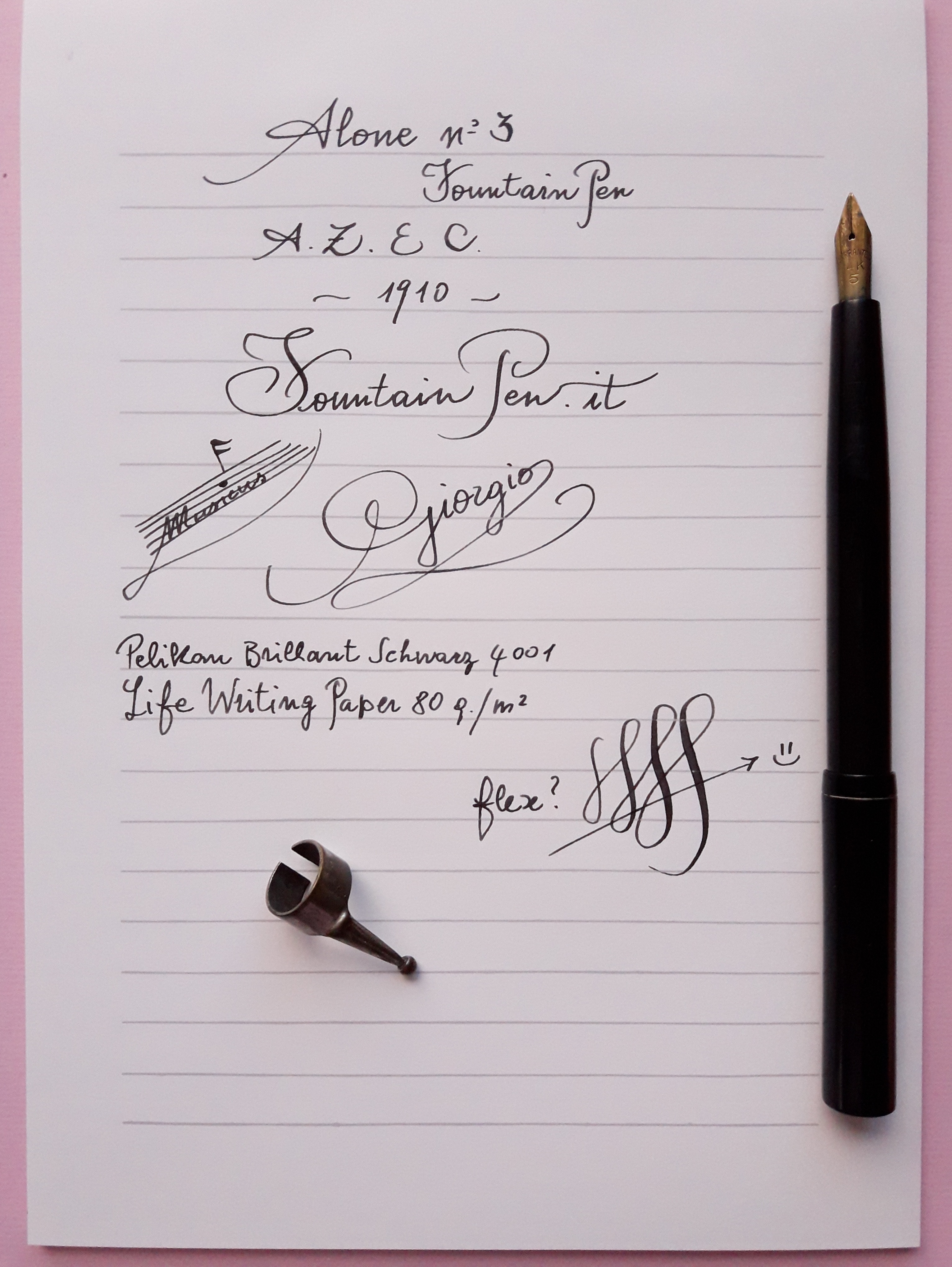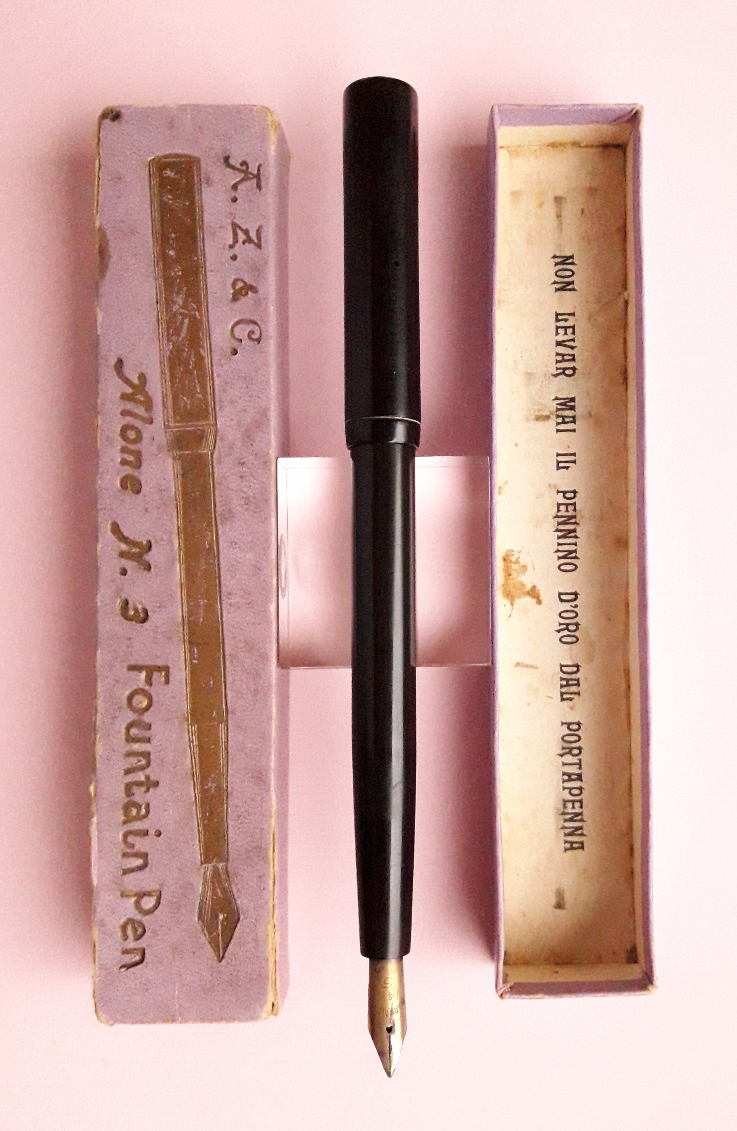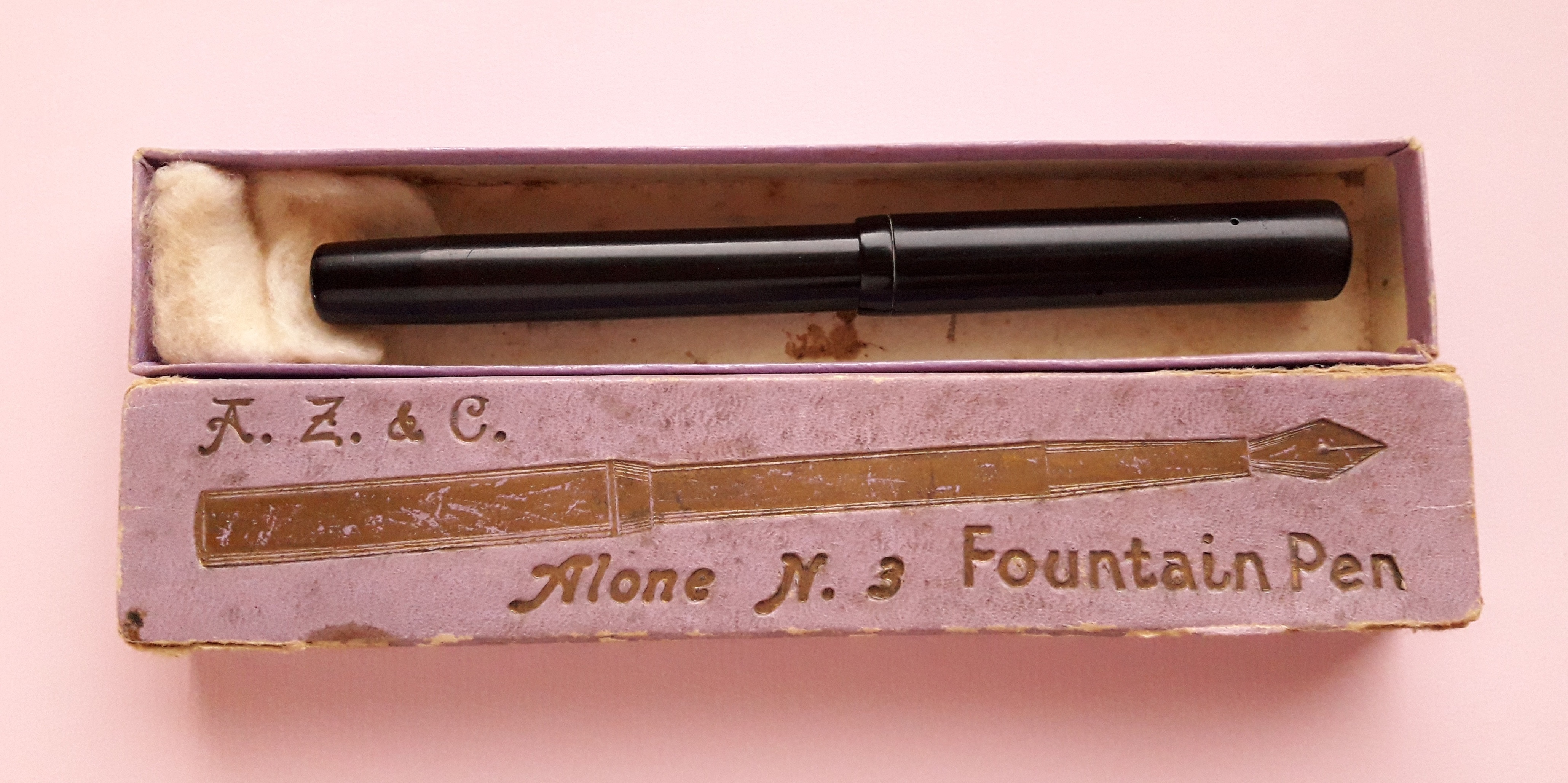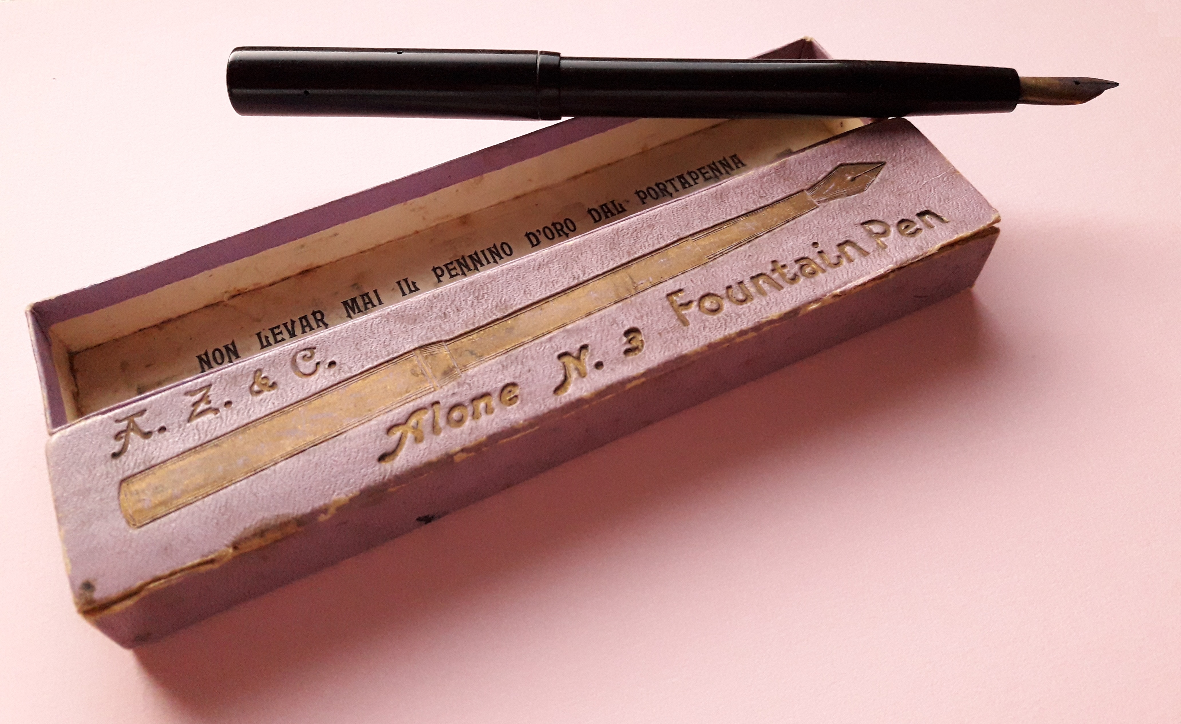 La penna è stata da me acquistata al mercatino in un lotto di oggetti provenienti da un ingegnere italiano che aveva fatto fortuna in Etiopia prima e soprattutto dopo la II Guerra Mondiale, stando a ciò e mi è stato riferito e a quanto ho potuto constatare di persona (tessera del P.N.F. dal 1923, poi foto con il Negus, Pajetta e Andreotti…). E in effetti, la nostra Alone N°3 stava (tra le altre) con una penna inglese fine anni Dieci che vi presenterò prossimamente. ;)