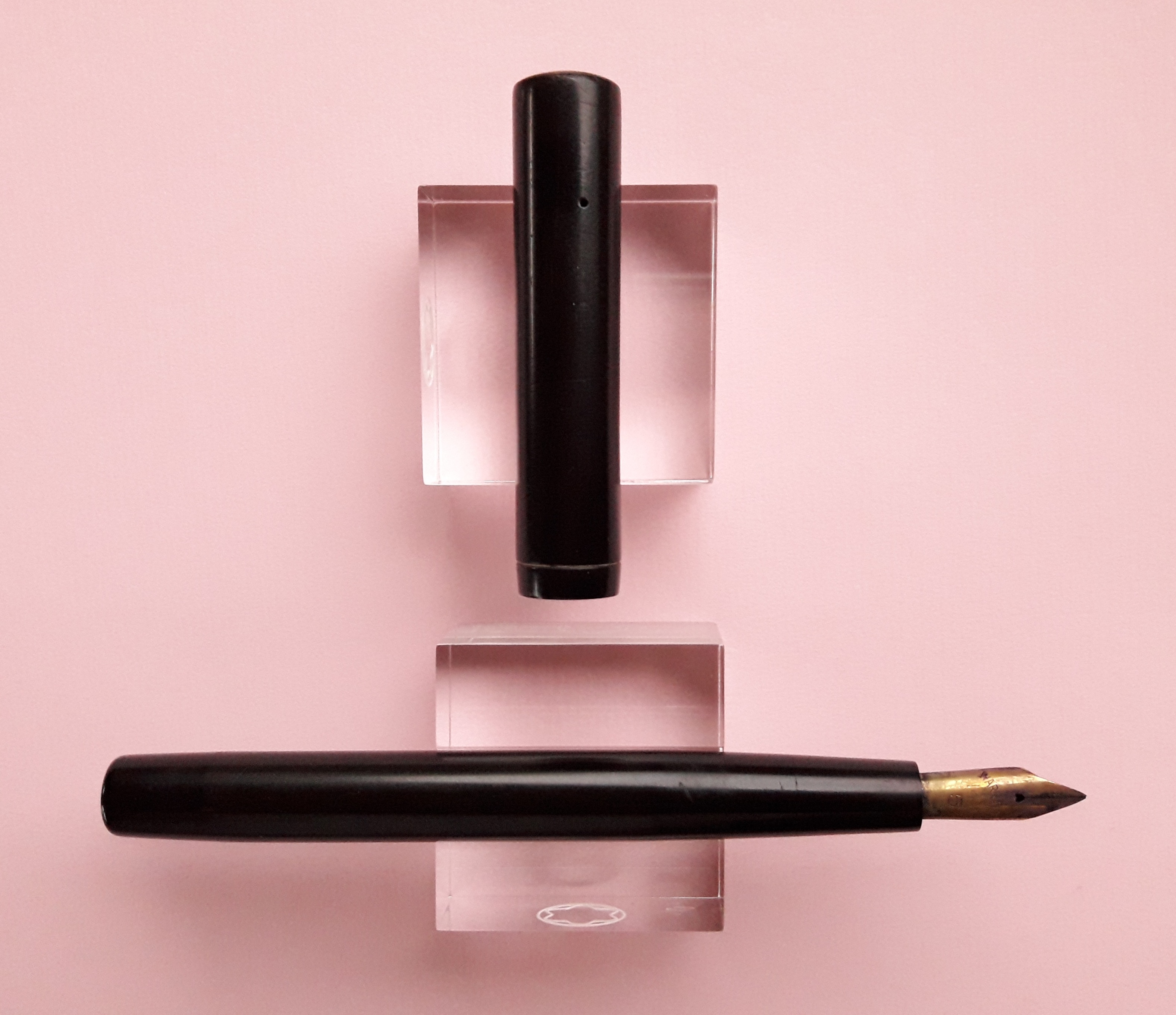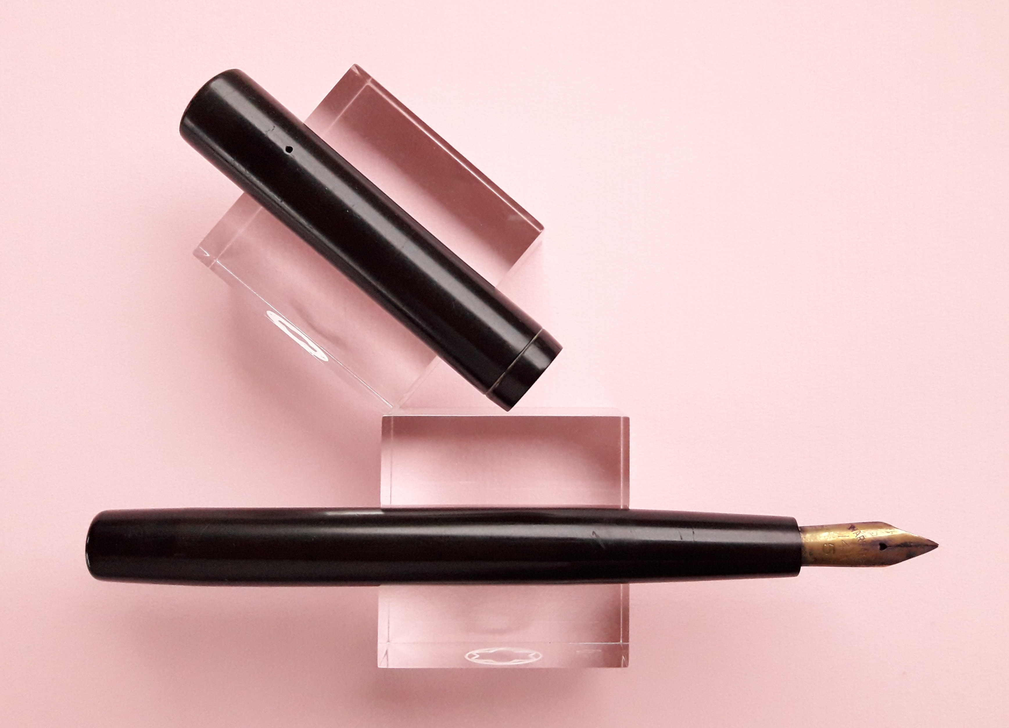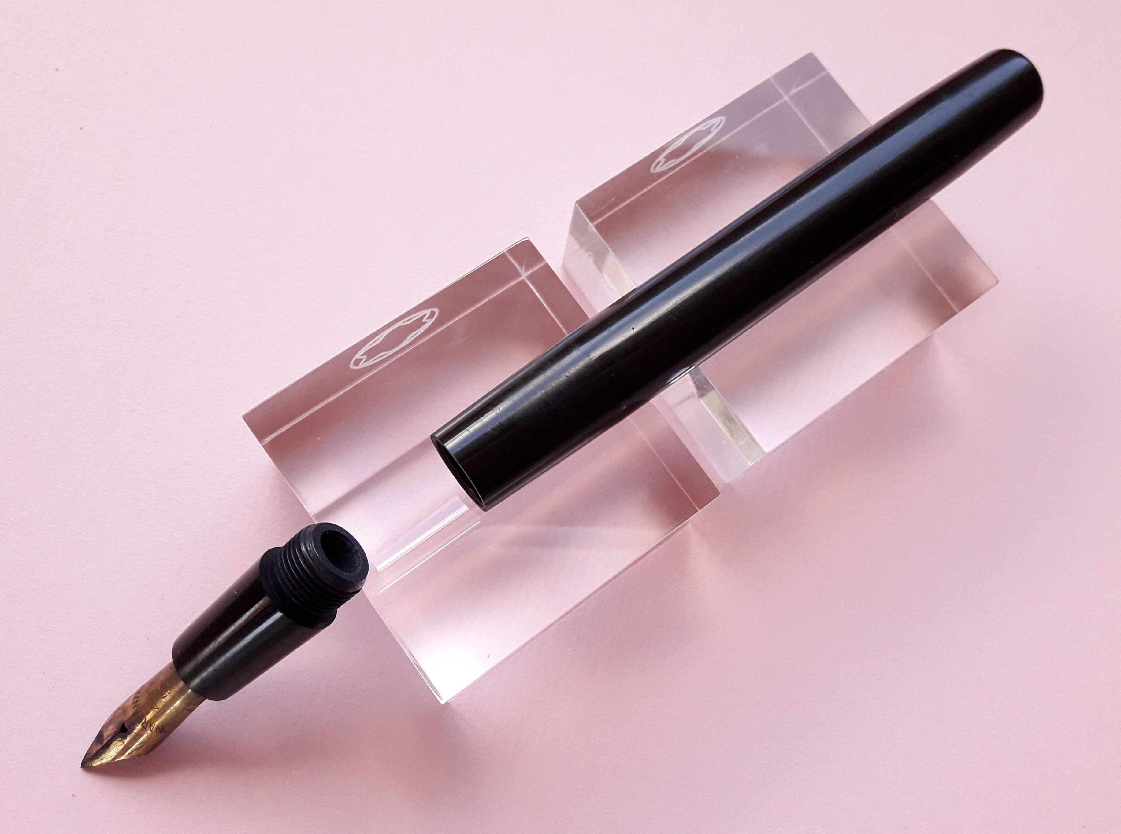 La penna è una eyedropper classica, in stile (anche) Waterman, modello “cone cap” (con labbro del cappuccio conico ad incastro sul fusto anch’esso conico)
