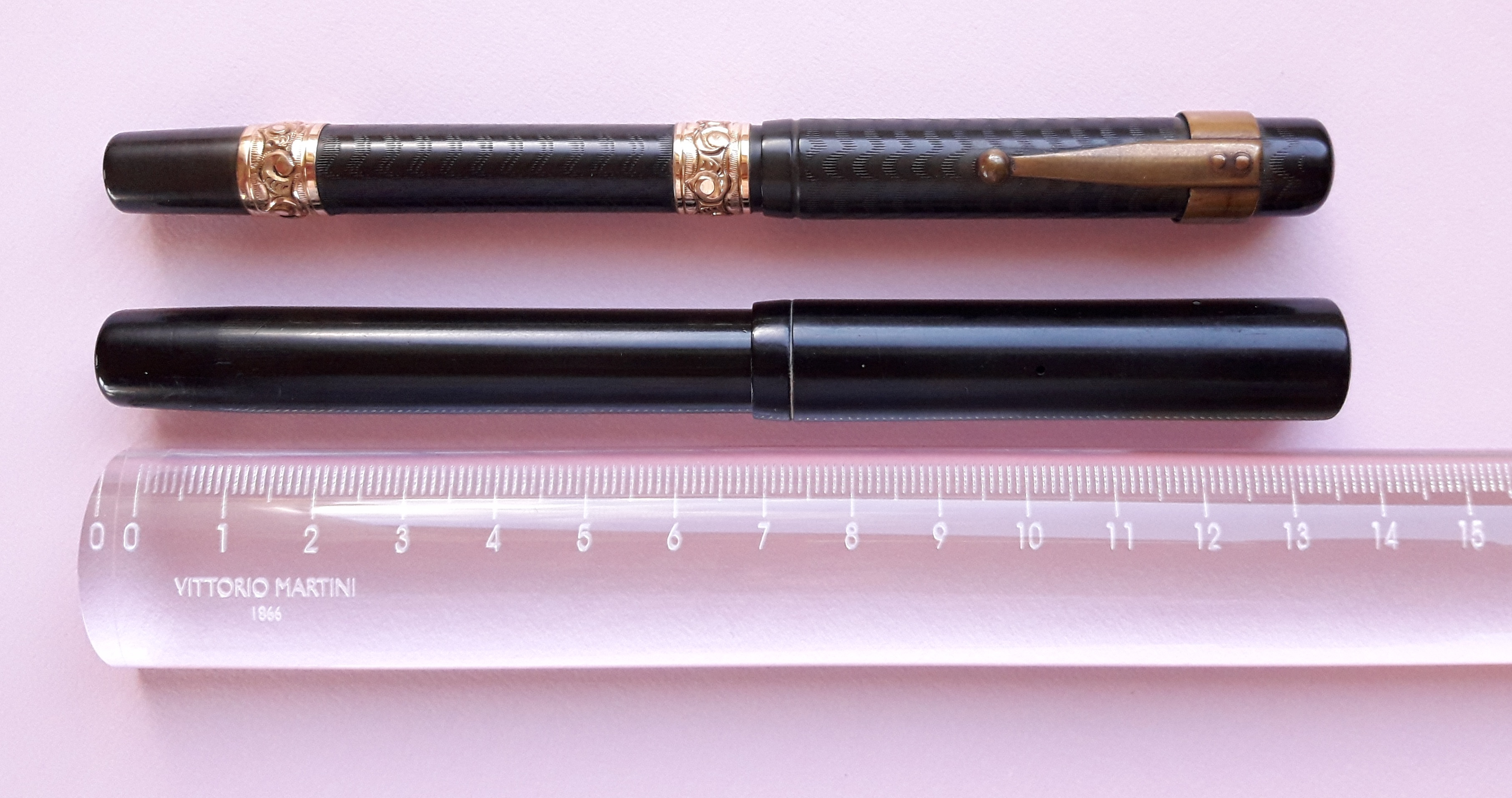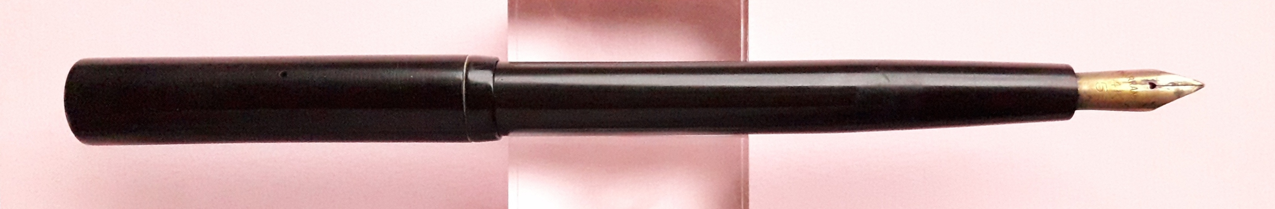 In un mercato (su scala mondiale) in rapida e costante evoluzione come quello delle stilografiche nella prima metà del Secolo XX, una eyedropper con chiusura a frizione del cappuccio non avrebbe avuto moltissime chance di vendita dopo la fine della Grande Guerra (1918), forse nemmeno in un mercato immaturo come quello italiano: Waterman stessa mantenne il modello con carica a contagocce, denominato “regular type dropper filling”, come modello di ingresso dal 1919 fino al 1925 almeno, ma esclusivamente con cappuccio a vite (che oggettivamente offriva maggior “sicurezza” contro le aperture accidentali se la penna veniva riposta nel taschino…). Eppure, tra i Produttori italiani è necessario ricordare che sia Tibaldi (dal 1916) che Aurora (dal 1919) avevano nel loro primo catalogo “semplici” eyedropper (la Casa torinese addirittura con cappuccio ad incastro non filettato, il F.A.S., fisso Aurora semplice, come quella in presentazione, ancora nel 1922!), che nella versione base si rivolgevano ad un pubblico con minori pretese tecnico/stilistiche ed una minore propensione o capacità di spesa...