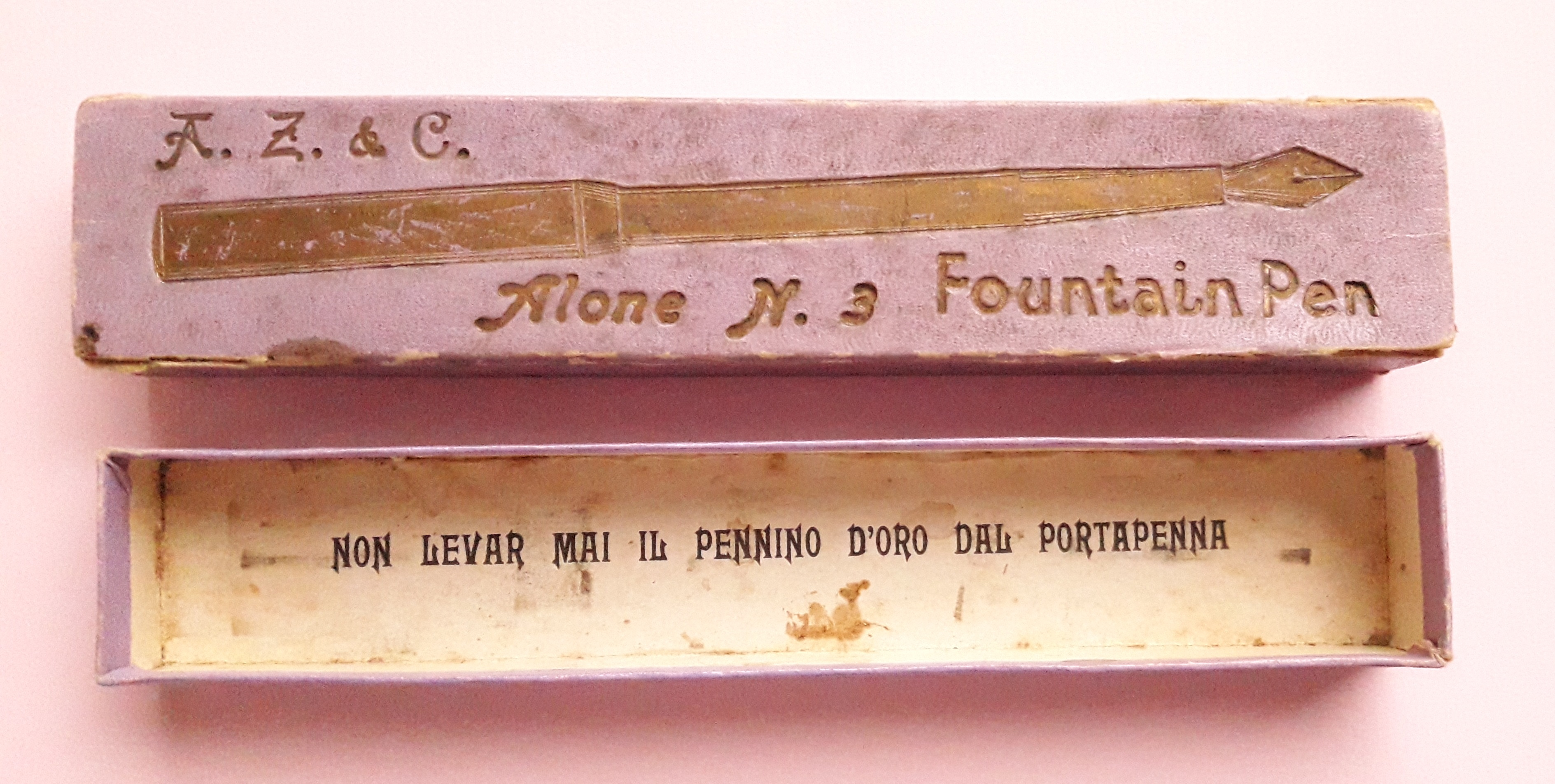 riproduca esattamente il messaggio contenuto nelle “cardboard boxes” (scatoline in cartone) di Casa Waterman, il colosso americano che produceva le penne in assoluto più pubblicizzate in Italia a partire dal 1905: unica differenza rispetto al messaggio originale è la scelta del font, il carattere di stampa, che nel caso della Alone è “con grazie” molto pronunciate, mentre nell’originale americano per il mercato italiano è senza (font “sans serif”).