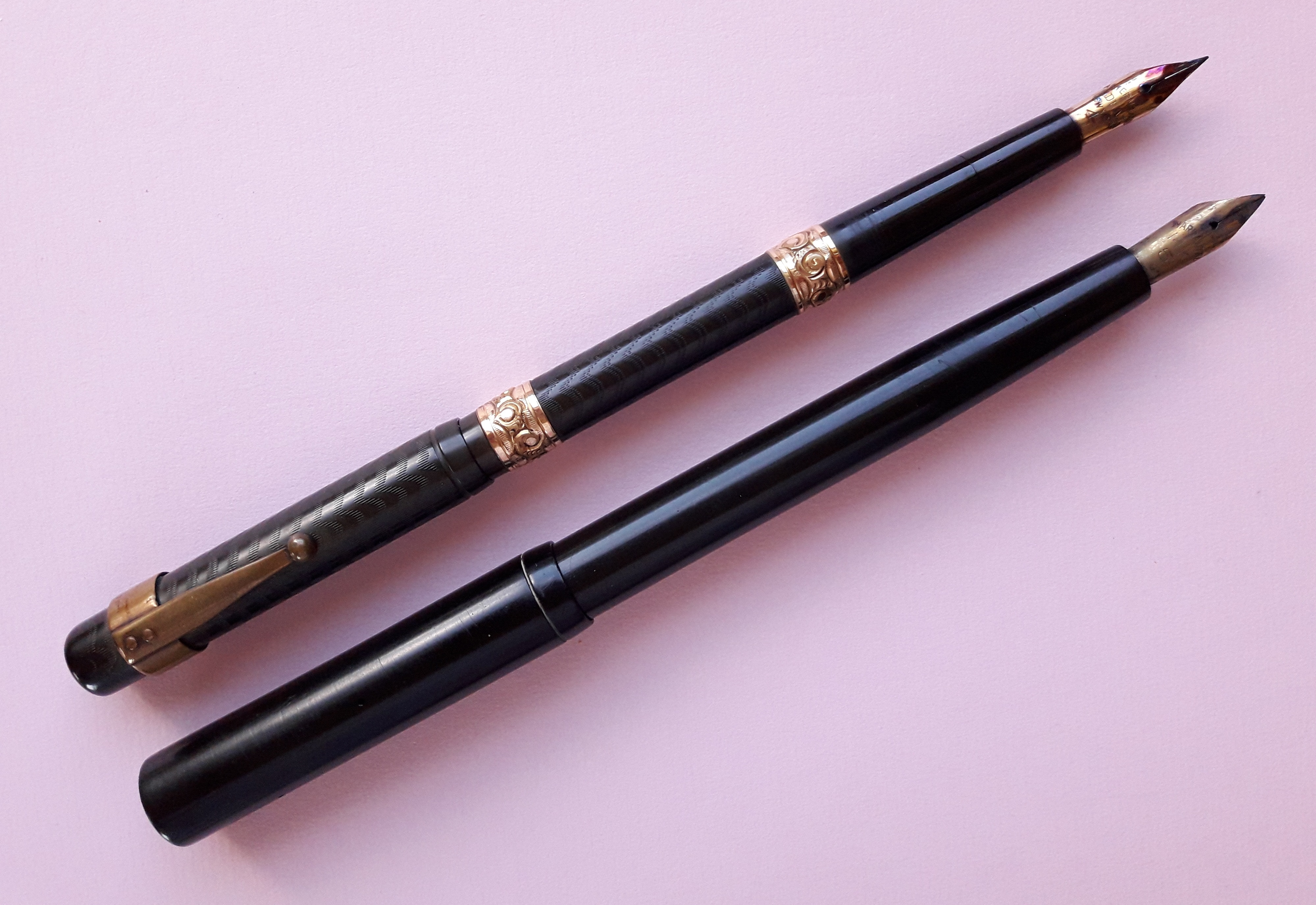 In buona sostanza, ci troviamo di fronte ad una delle innumerevoli declinazioni della primissima forma di penna stilografica (di qua e di là dell’Atlantico): trattandosi di una penna il cui design e la cui tecnologia (spoon feeder soprattutto) era disponibile sul mercato mondiale da fine Ottocento e in Italia dal 1905 (come si ricava dalle pubblicità da me conferite al Wiki), la penna potrebbe essere stata prodotta in Italia dal 1914 (quando cominciavamo a costruirle in proprio anche qui da noi, con la Uhlmann’s Eterno di Milano, per esempio) ai primissimi anni Venti, quando il modello andò fuori mercato (per avere una scatolina così carina…).