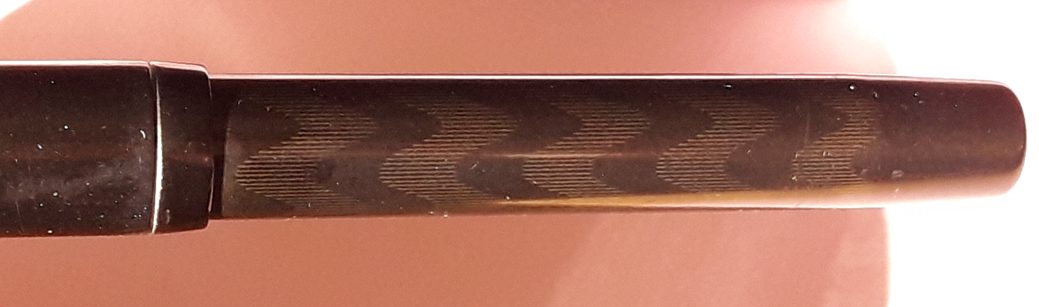 Il cappuccio (sul quale si aprono 4 fori di aerazione a coppie speculari, su due livelli) è perfettamente cilindrico e presenta un labbro conico per l’incastro sul fusto, sottolineato da un’incisione circolare. La decorazione della penna, molto usurata ma ancora visibile sotto una forte illuminazione, ricorda lo stile adottato dalle Swan degli anni Dieci, con cappuccio liscio, veretta incisa e fusto decorato a festoni guillochè.