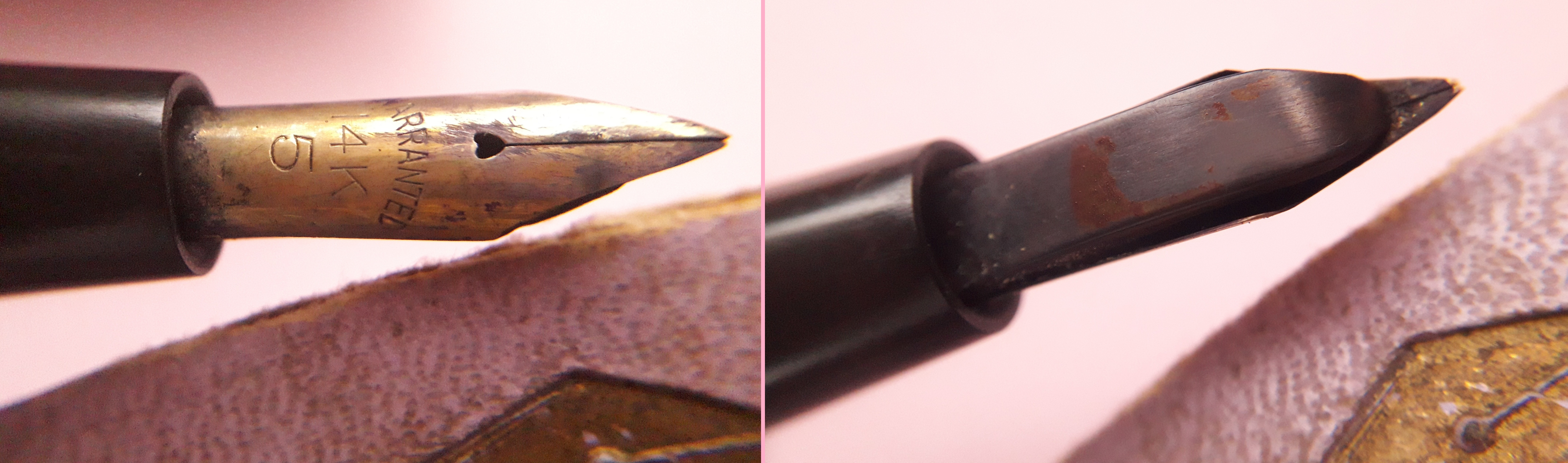 Il pennino in oro, dalla forma arcaica, ha un tradizionale foro a cuore ed è marchiato