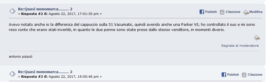 Condividere le proprie stilo è sempre un piacere per chi le possiede e per chi le vede.fockerwulf ha scritto: ↑giovedì 24 agosto 2017, 9:42 Non vedo dove sia la polemica innescata da Musicus, prima di chiamare accrocchi ciò che presento all'attenzione dei partecipanti a questo forum (visto che il cappuccio della Parker VS era stato invertito con quello della Parker 51 Vacumatic), dovrebbere essere cauto nell'esprimere pareri che potrebbero risultare non graditi a chi come me ama le stilografiche e la loro storia.