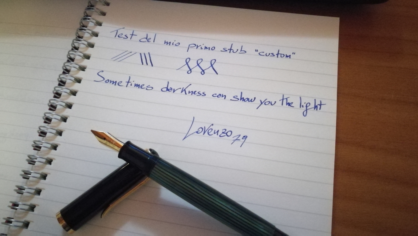 Sono abbastanza soddisfatto del risultato per essere la prima volta, non noto differenze con gli stub Conklin, Lamy e Monteverde che uso di solito. La scrittura è scorrevole e con una sufficiente variazione di tratto. Forse un po' più abbondante causa il conduttore Pelikan.