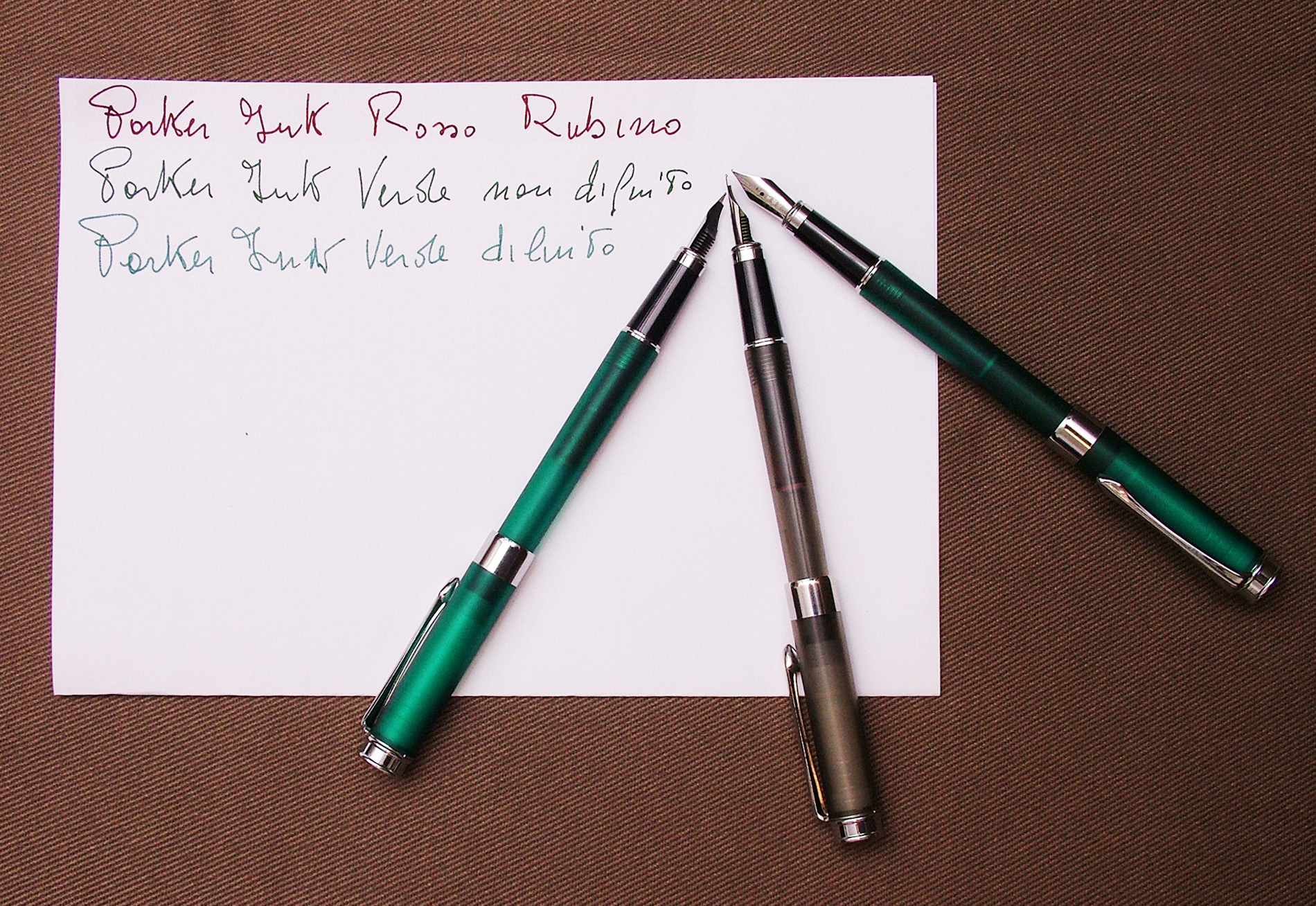 Prima di partire per una settimana ho caricato 3 cartucce vuote, una con il verde smeraldo liscio, una con lo stesso inchiostro leggermente allungato con acqua ed uno col rosso rubino, il moka non l'ho ancora provato.