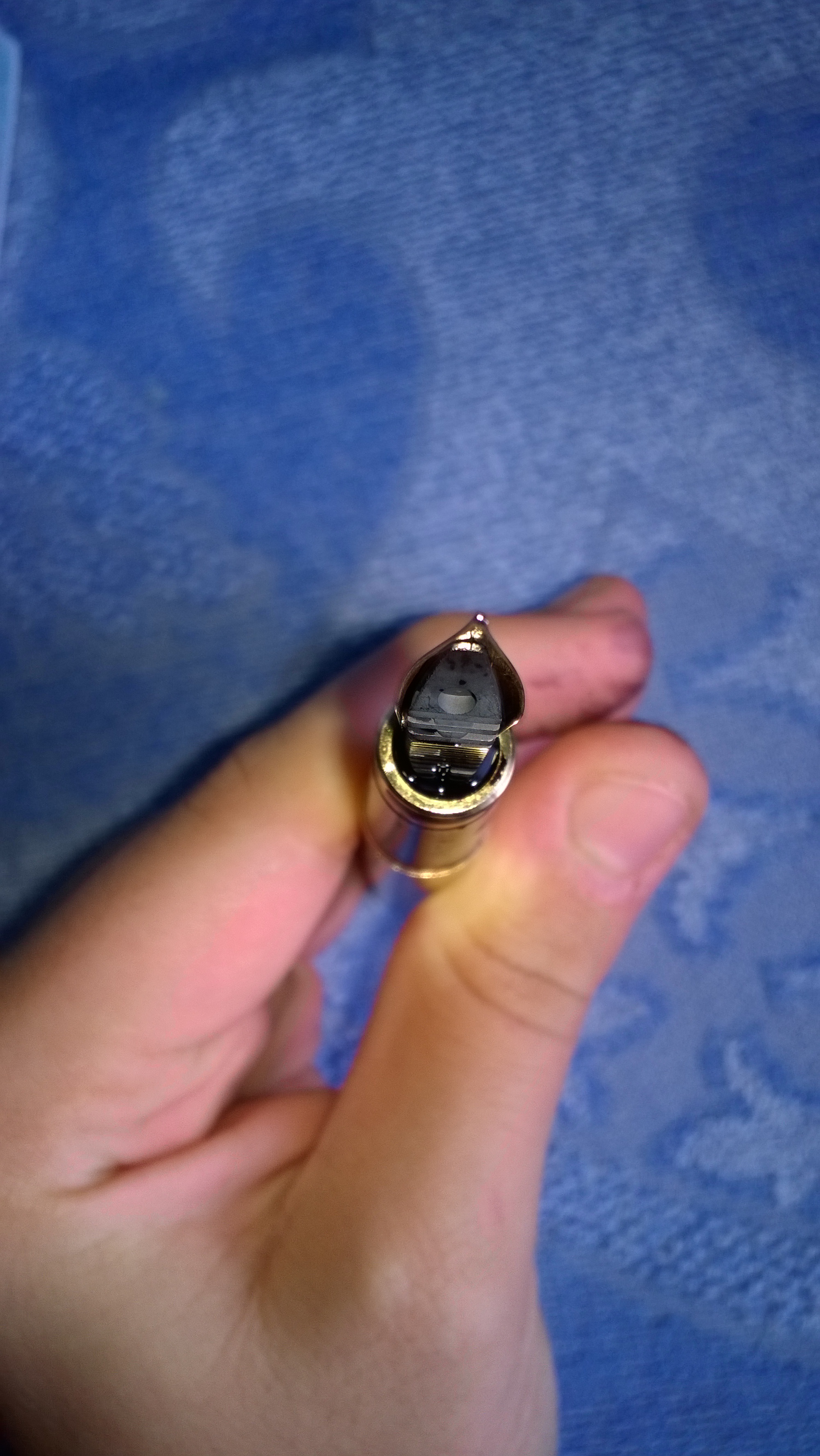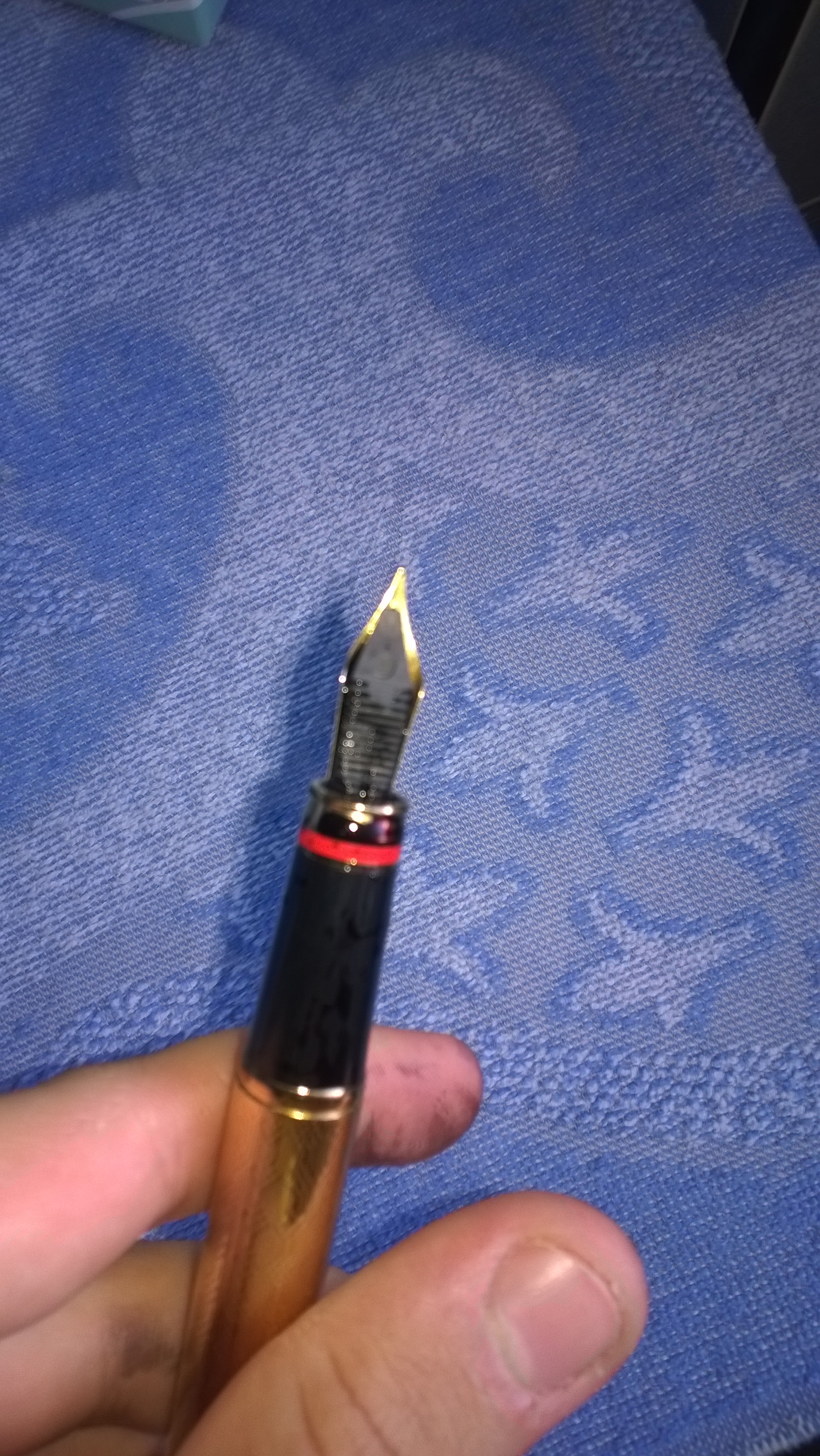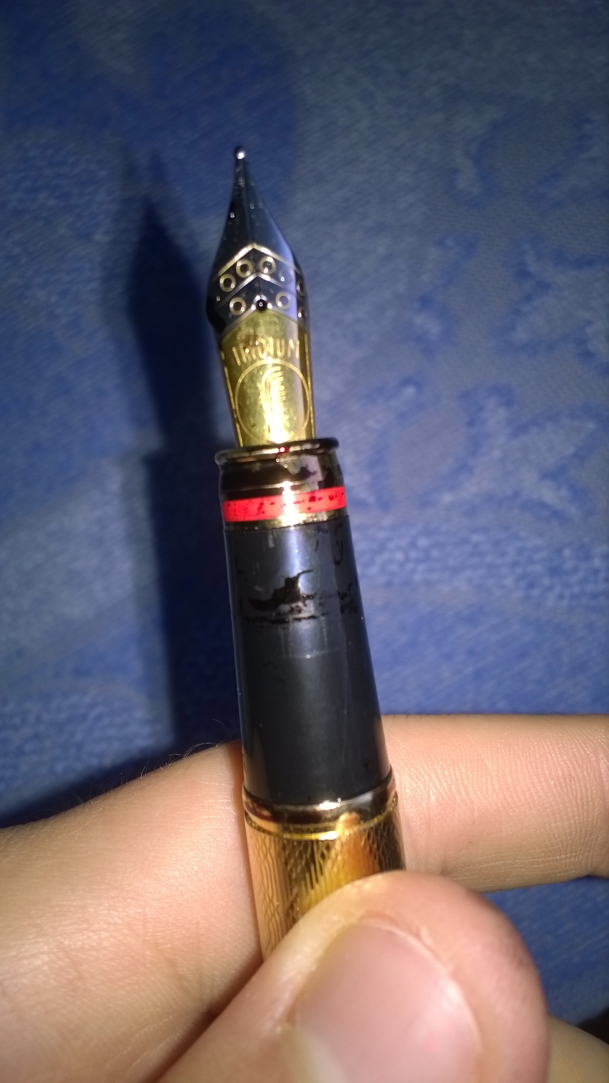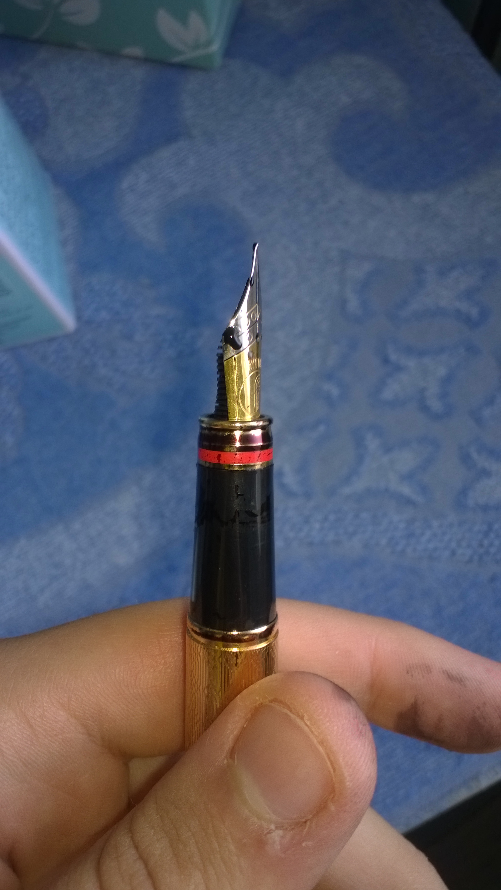 Salve, scrivo per avere delucidazioni in merito a ciò che è successo pochi minuti fa alla mia Filcao (acquistata da meno di un mese): mi siedo alla scrivania, prendo la stilografica dal portapenne (dove si trovava a testa in su da ieri sera), tolgo il cappuccio, scrivo due lettere e... mi accorgo di avere le dita tutte macchiate di inchiostro (Pelikan 4001 nero brillante, per la precisione); aggiungo che l'interno del cappuccio della penna è anch'esso macchiato. Vi chiedo quindi cosa sia potuto succedere internamente alla penna e cosa fare non solo per rimediare a questo episodio, ma soprattutto per evitare che ciò accada nuovamente. Allego le foto della penna allo stato attuale.