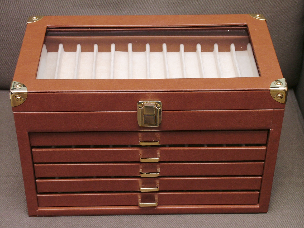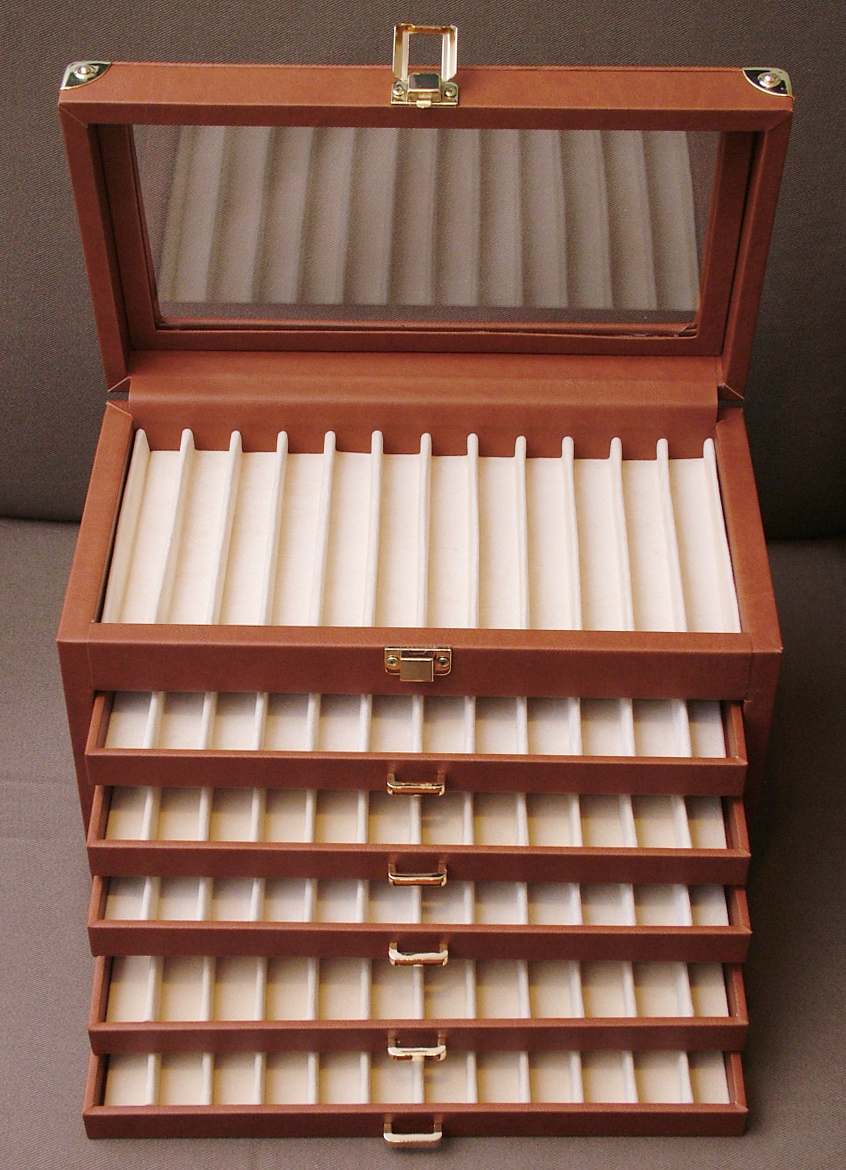 Cassettiera in multistrato ricoperta in eco pelle, colori nera o marroncina, accessori sia cromati che dorati, ottime rifiniture, anche eco pelle che copre le cerniere, bella capiente, adatta per ben 72 penne, prezzo molto concorrenziale, 48 euro + spese postali circa 13 euro o devo dire eurini?