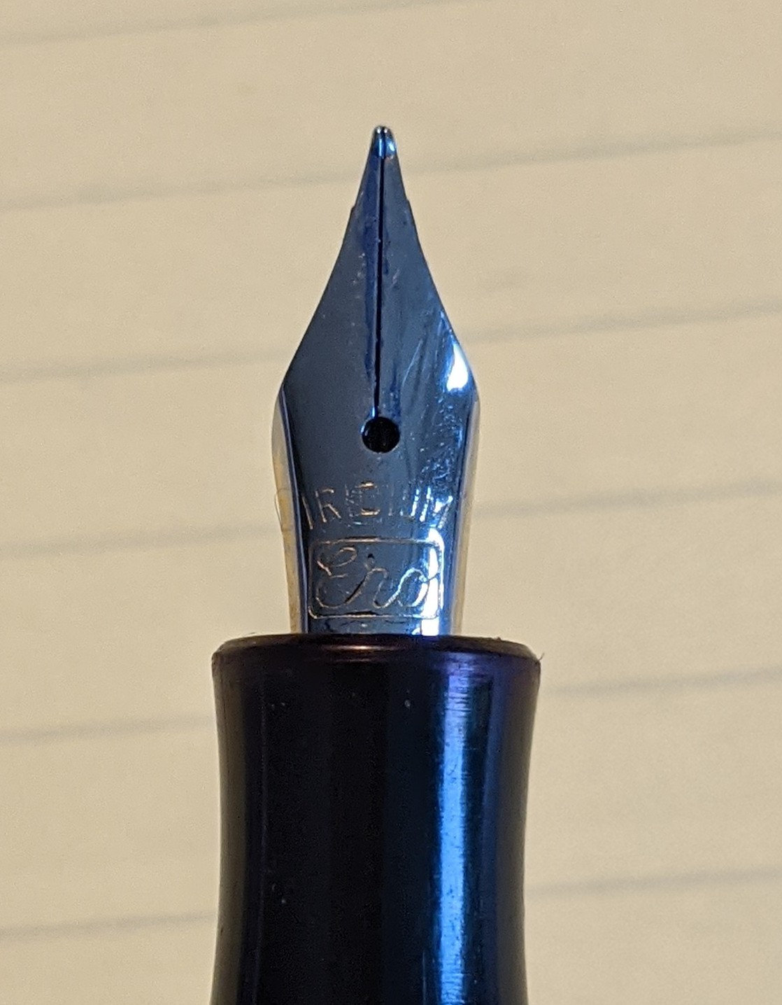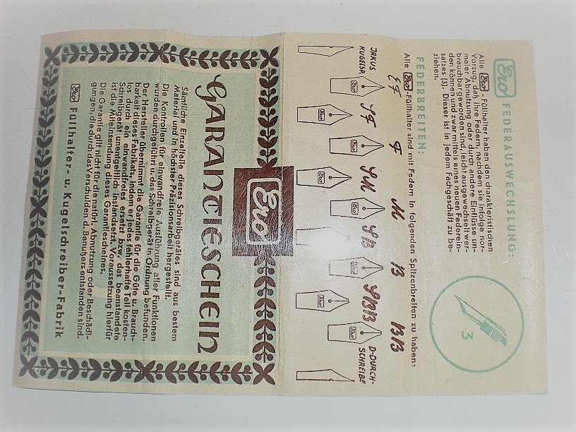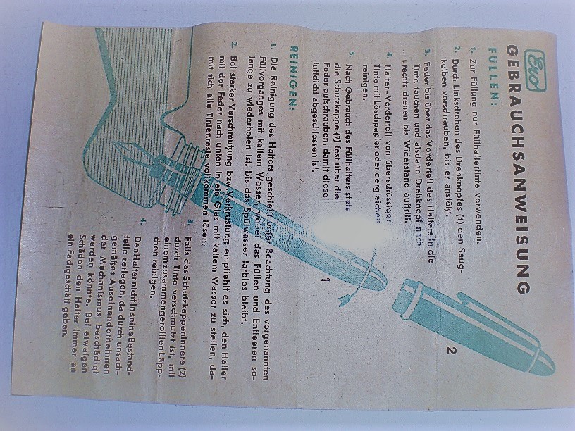 Recentemente sono venuto in possesso di questa penna ERO completa di scatola originale. All'interno ho trovato il tagliando per la garanzia e due etichette che mi riportano indietro nel tempo.Notare il prezzo di 1.100 lire che all'epoca non erano poche.Sul pennino,in acciaio dorato è scritto:IRIDIUM - Ero - Irkus - 7.