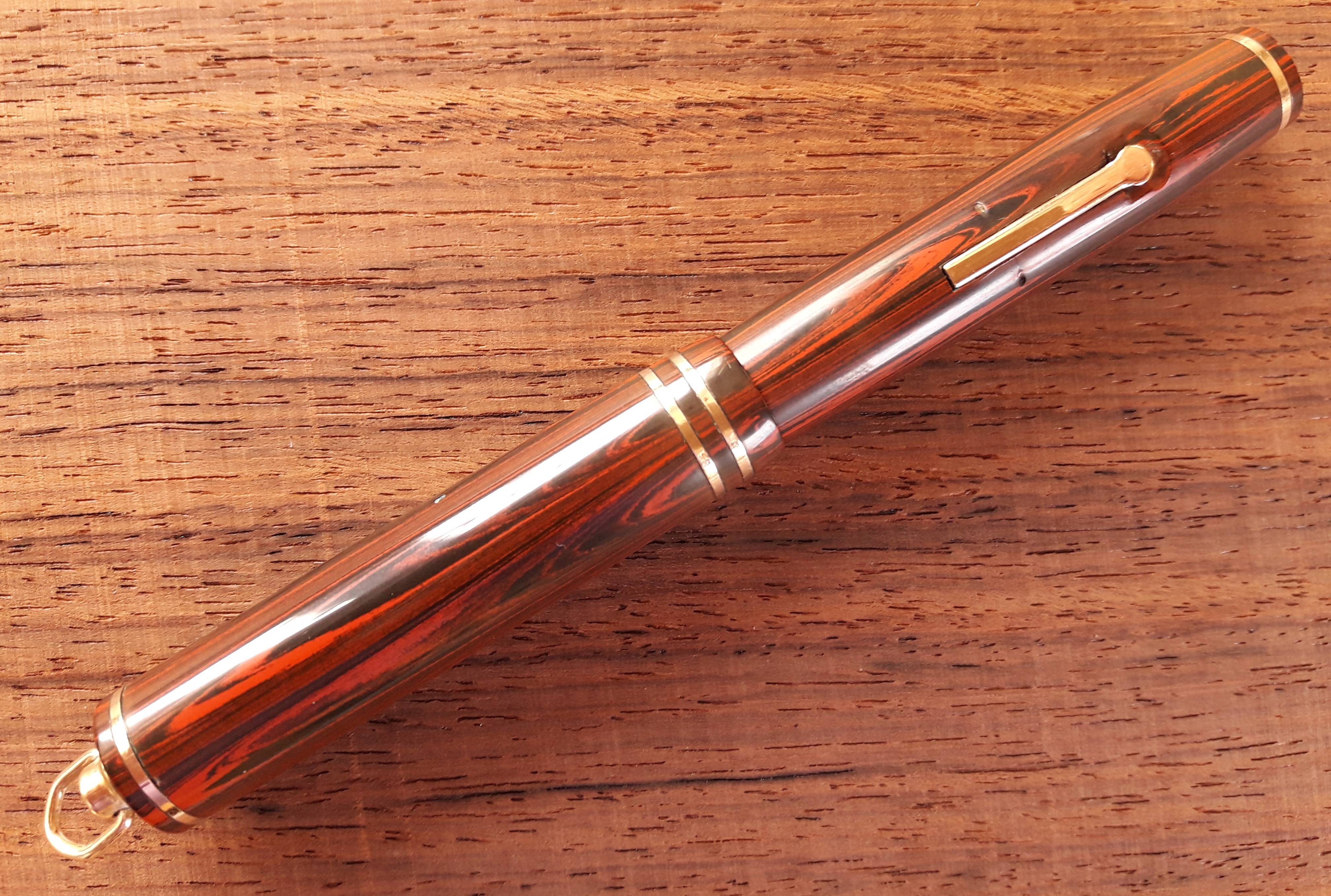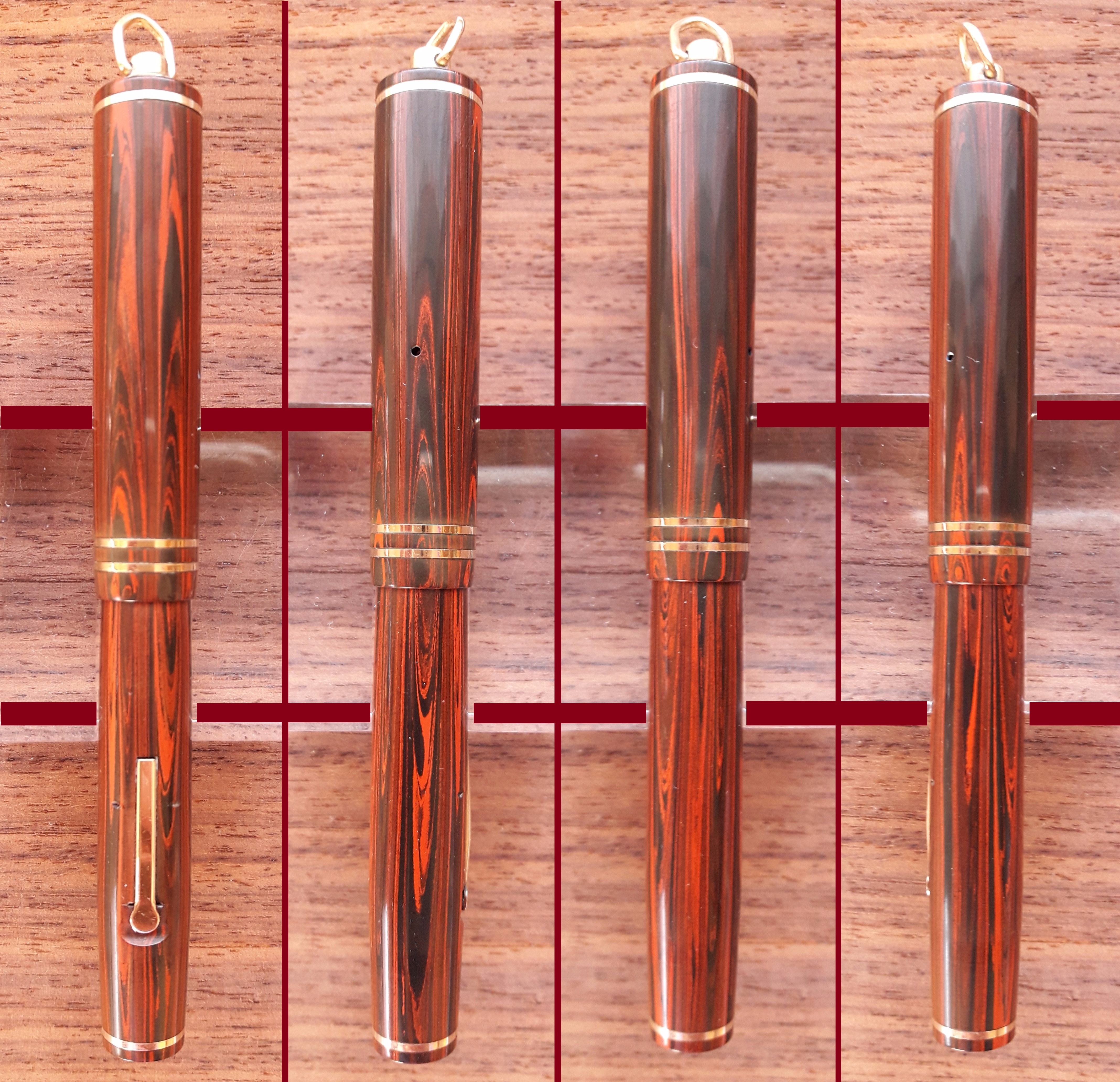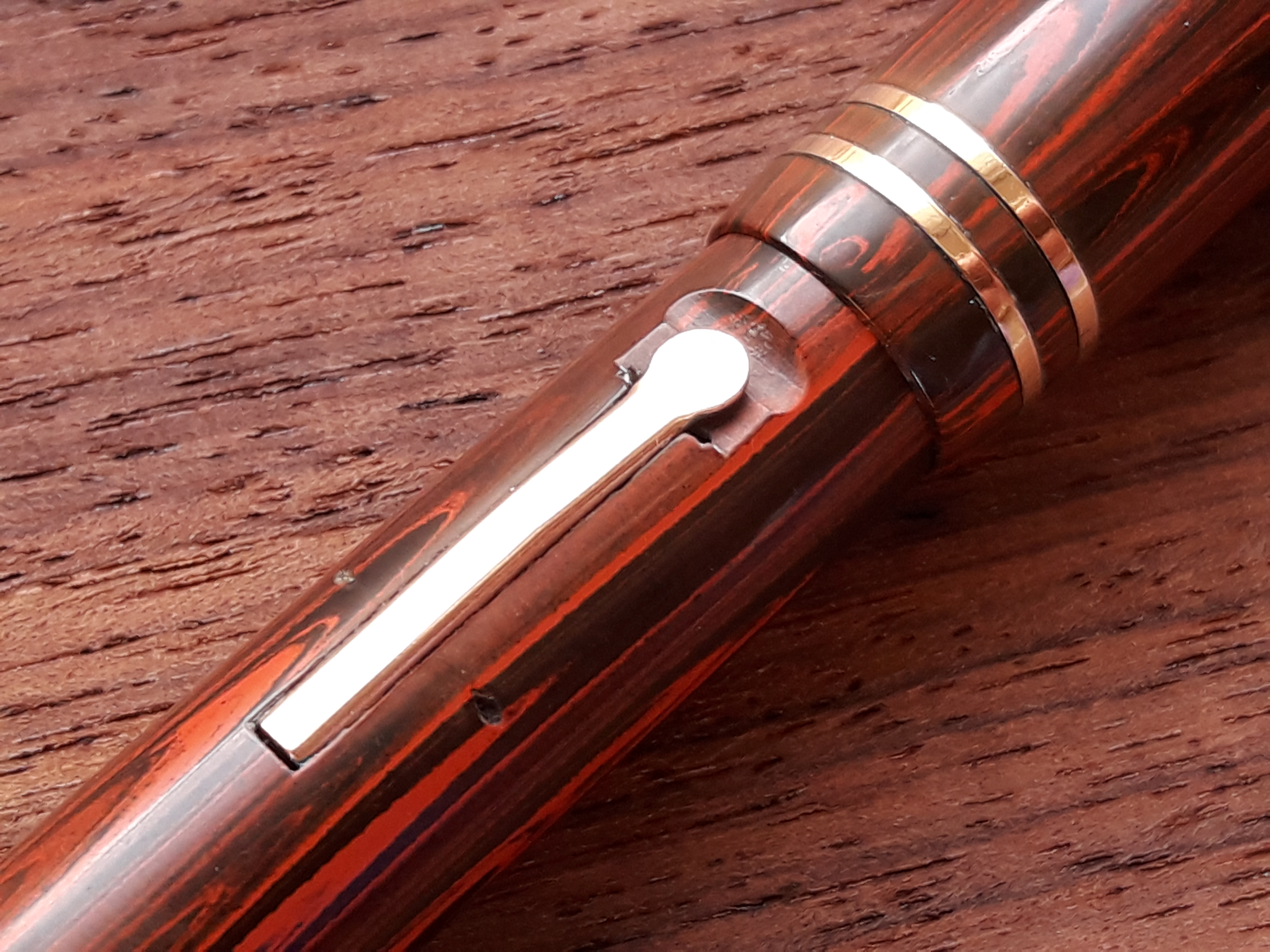 Rosewood è il nome commerciale che la Wahl-Eversharp diede alla sua ebanite rossa&nera di tipo woodgrain (che riproduce le “venature del legno”) introdotta nel 1926: ecco un’immagine ripresa sopra un campione di legno di palissandro (“bois de rose”, legno di rosa), di provenienza africana, non ancora trattato.