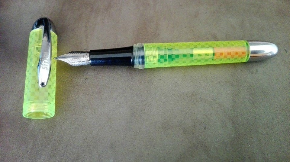 Presa su un sito olandese. Si tratta di una Stypen Lights, pennino medio. Il corpo è in materiale plastico abbastanza resistente. Misura cm 13 chiusa, cm 12 aperta, cm 14 con il cappuccio calzato. Pesa gr.20. Chiusura a vite. Può contenere due mezze cartucce, standard tp/6, ma vi ho montato un converter. La scrittura è densa e morbida, il tratto molto largo, come piace a me. Leggera e maneggevole, anche carina esteticamente (ma qui c'è il gusto personale). Pagata 15,50 spedita. :D
