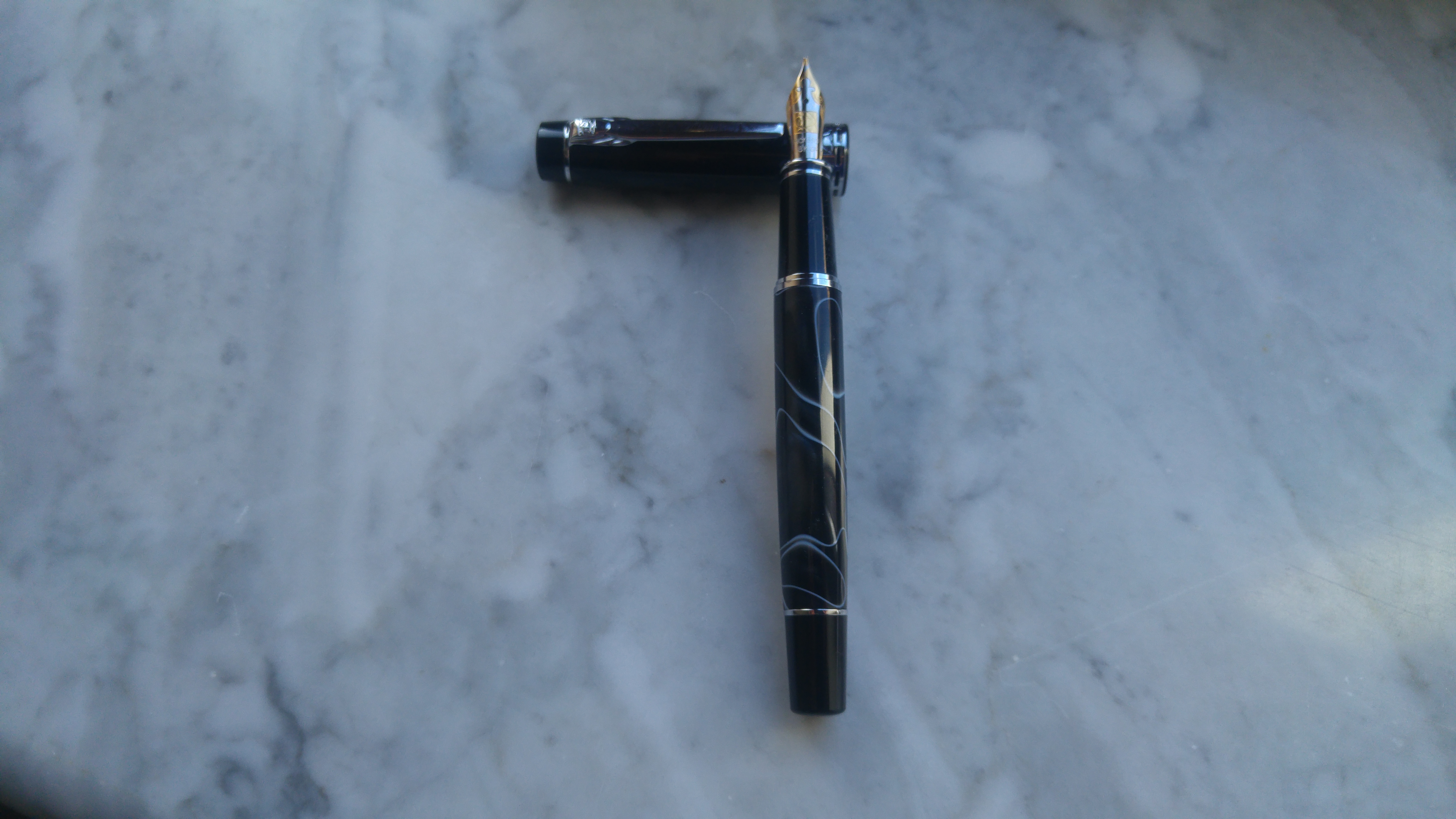La Picasso 925 che ho acquistato con pennino M sono riuscita a trovarla a 27€ inclusa spedizione, ed è il modello con il pennino completamente scoperto. Io ho preso la “Nero Swirl”, che si caratterizza per un bel colore nero lucido con un motivo bianco sul fusto dai gradevoli riflessi grigiastri.