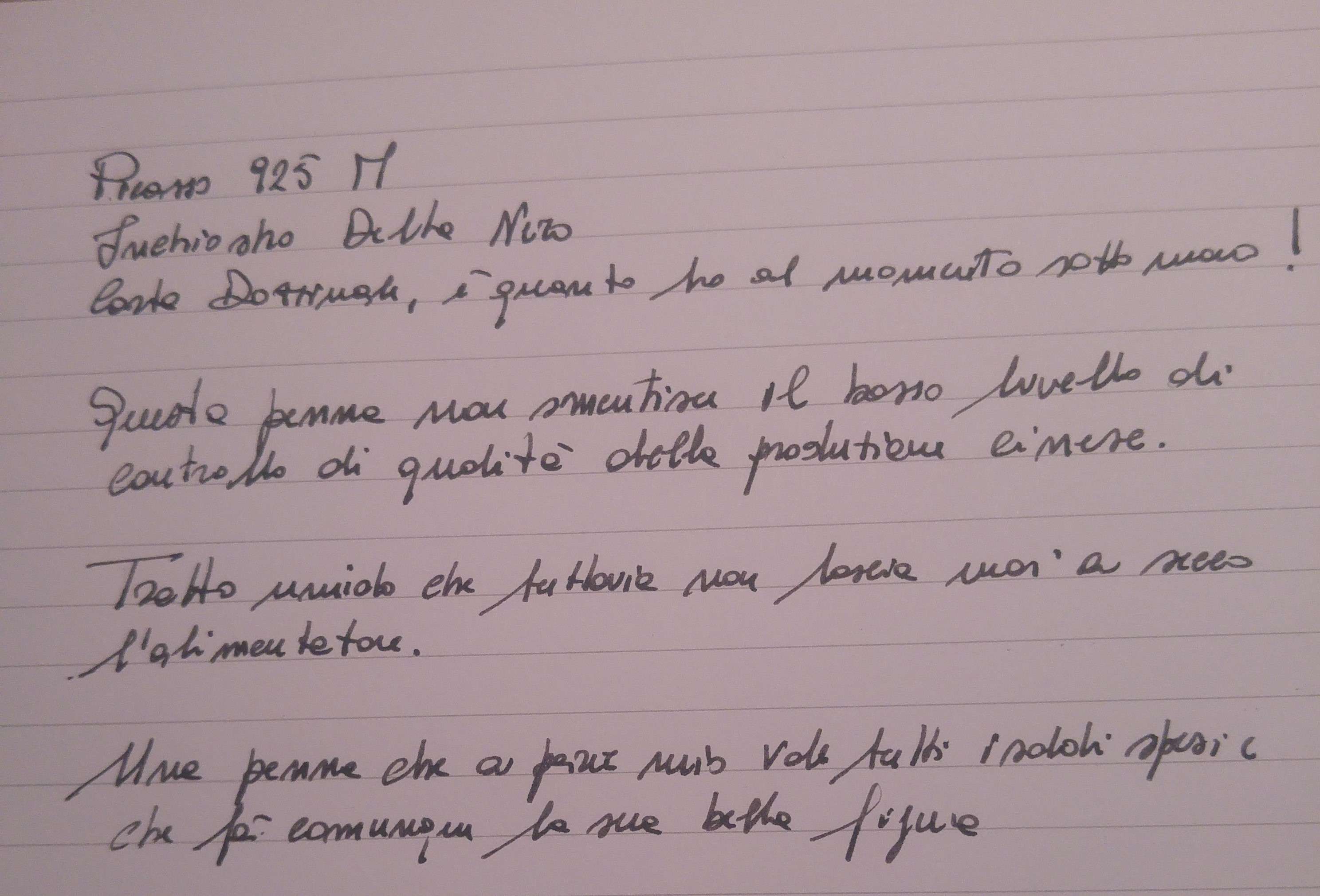 Appena arrivata gli ho fatto un bel lavaggio con acqua ed una goccia di detersivo, dopodiché l’ho caricata con inchiostro Delta nero. Inizialmente la penna benché praticamente sorvolasse la carta come se fosse su un cuscino d’aria, aveva un tratto magro e discontinuo, classica dimostrazione dello scarso livello del controllo qualità della grande maggioranza delle aziende Cinesi, incluse quelle di fascia leggermente più alta. Fortunatamente è bastato aprire leggermente i rebbi per risolvere il problema. Il flusso di inchiostro ora rende il tratto bello umido senza mai lasciare a secco l’alimentatore in lunghe sessioni di scrittura. Grazie alla docilità con cui scorre sulla carta e il suo tratto M è a mio parere una penna piacevole in scrittura