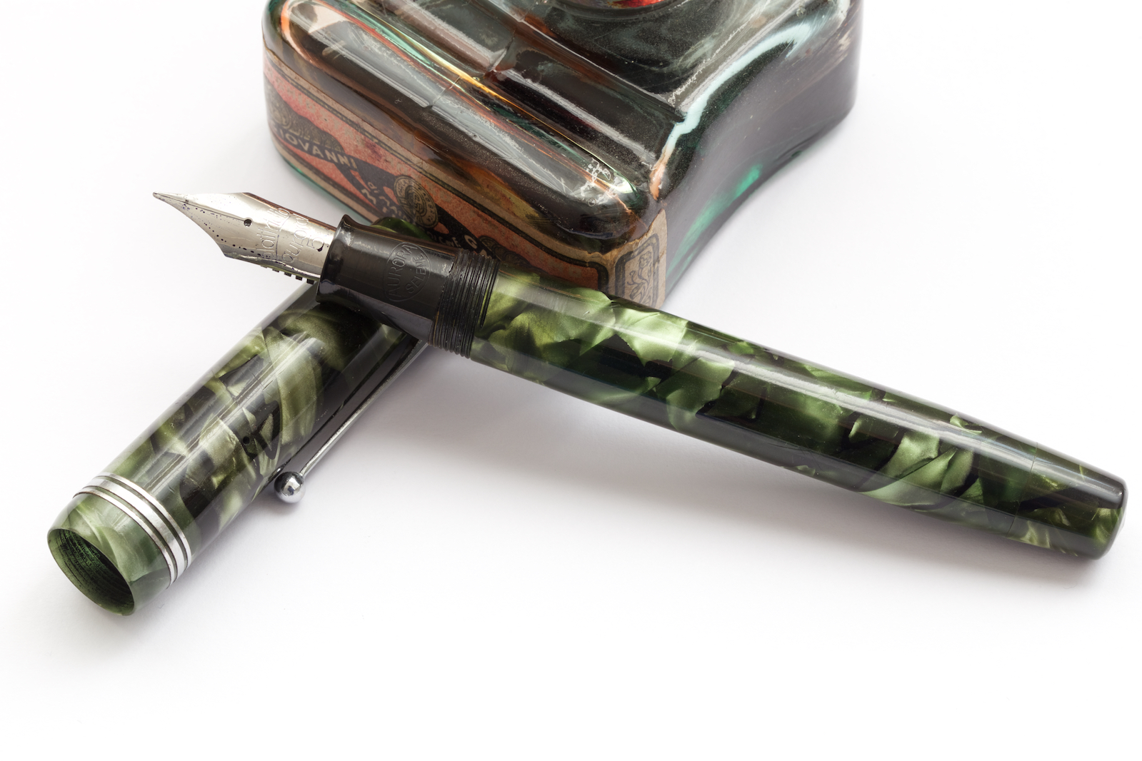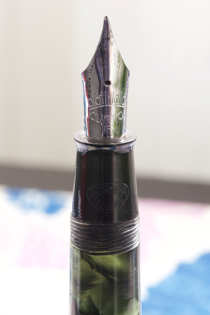 Oggi vi presento una delle ultime arrivate, l' Aurora Selene. Dalla veretta centrale più larga rispetto le altre dovrebbe appartenere alla prima serie del 1939-1940. Viene definita un modello economico ma osservando la qualità della celluloide e il bellissimo pennino in Platiridio vorrei che anche le economiche di oggi fossero così....La carica avviene tramite pulsante di fondo, coperto da un fondello dello stesso colore del corpo della penna, il pennino è molto fine e dotato di buona flessibilità che permette certi svolazzi. La misura della penna non è esagerata, chiusa 128 mm, abituato a penne generose calza comunque bene in mano. Sulla sezione si trova il "punzone" Aurora Selene.