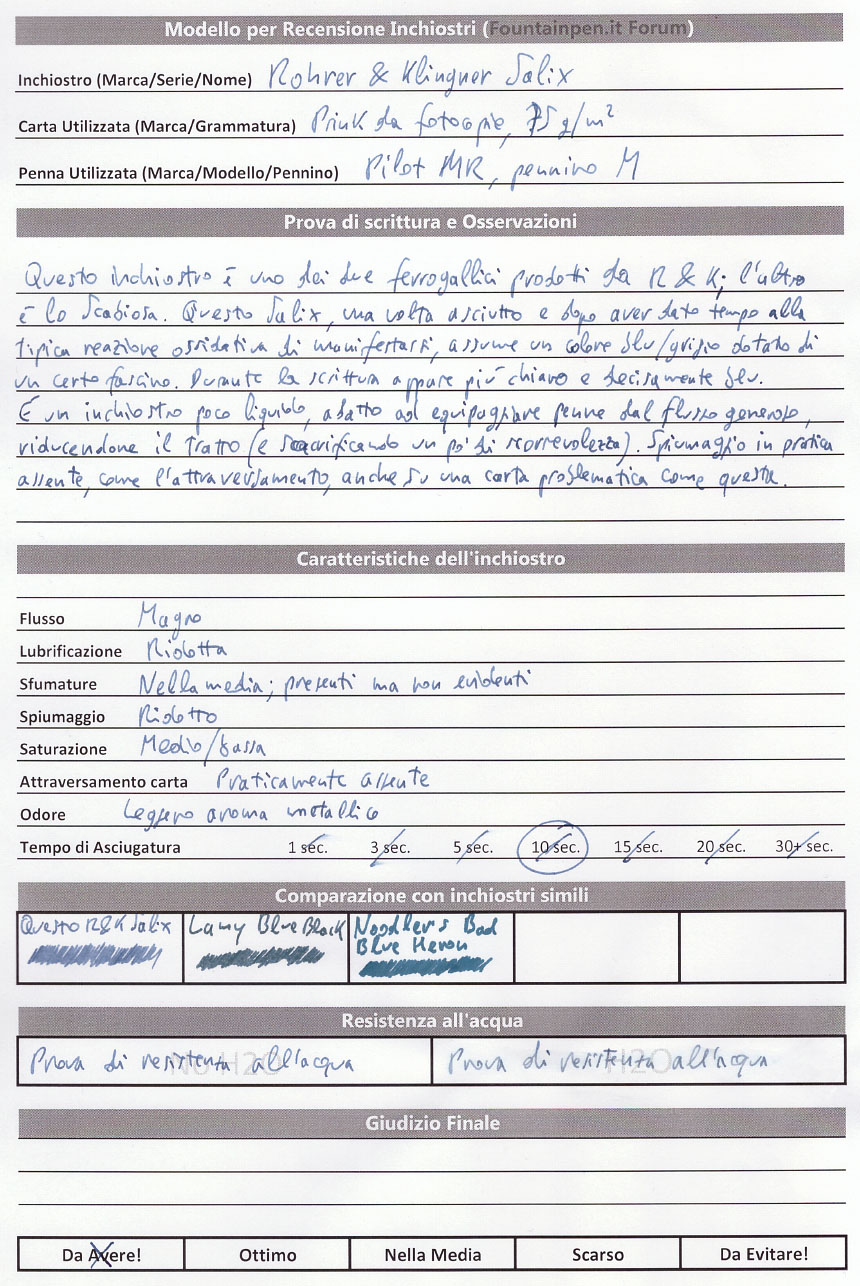 Vediamo quindi il comportamento del R&K Salix su carta economica da fotocopie Prink da 75g/mq; una carta diffusa ma poco adatta alle stilografiche perché piuttosto assorbente e facile da attraversare.