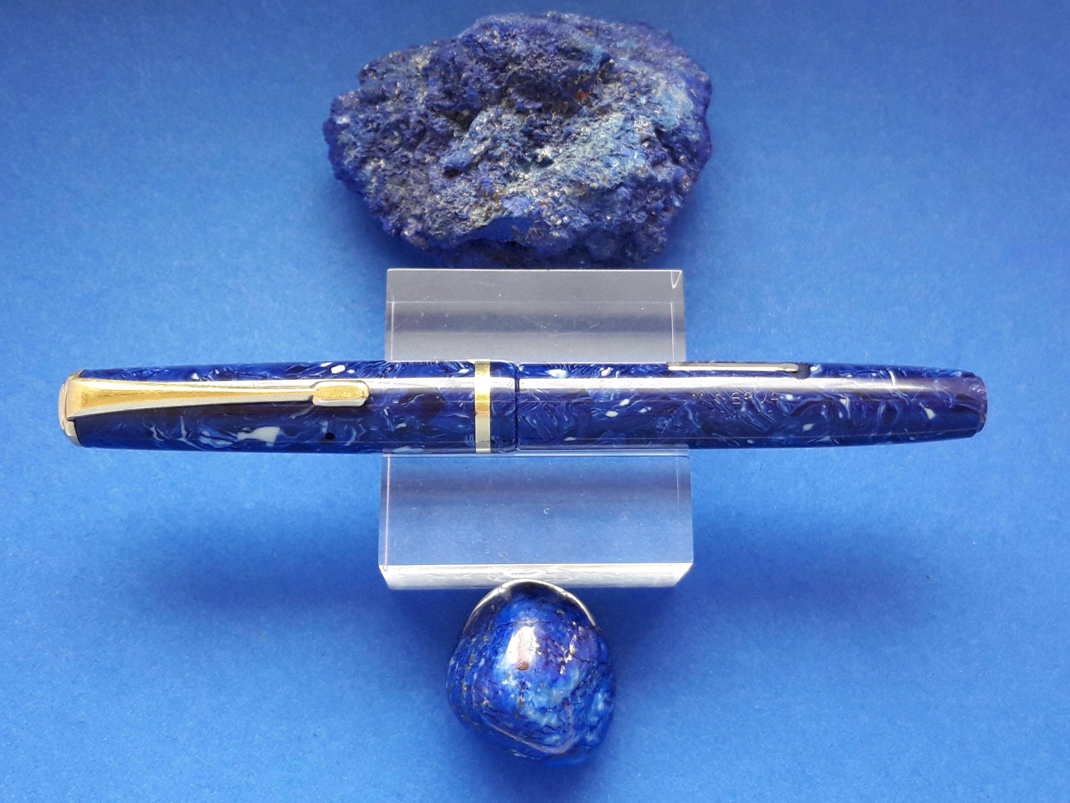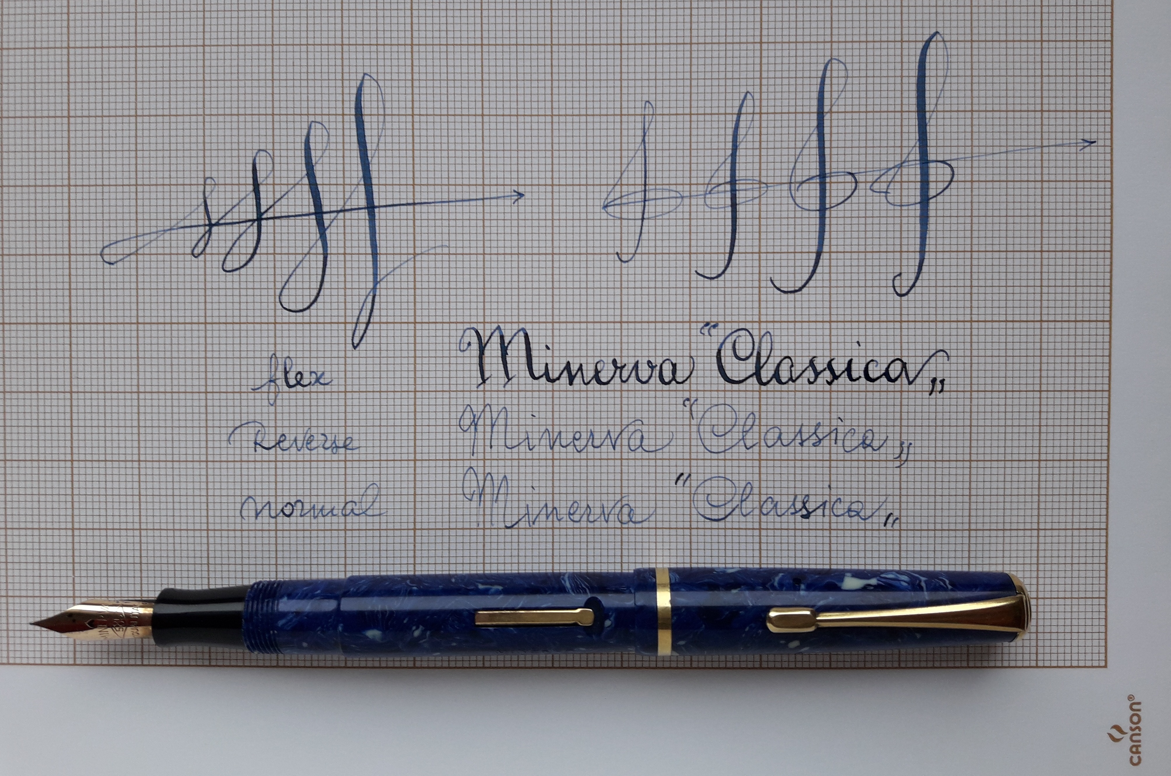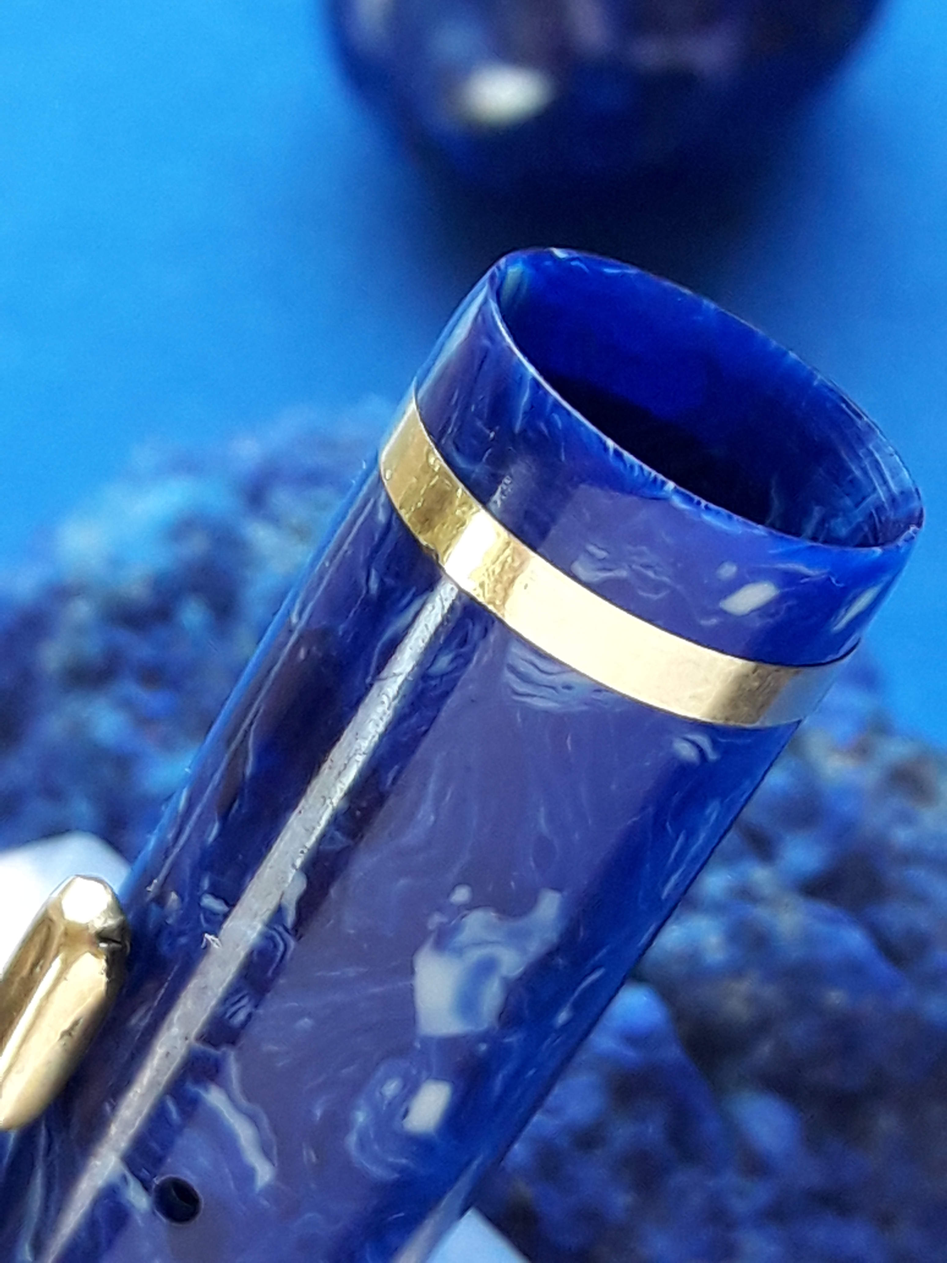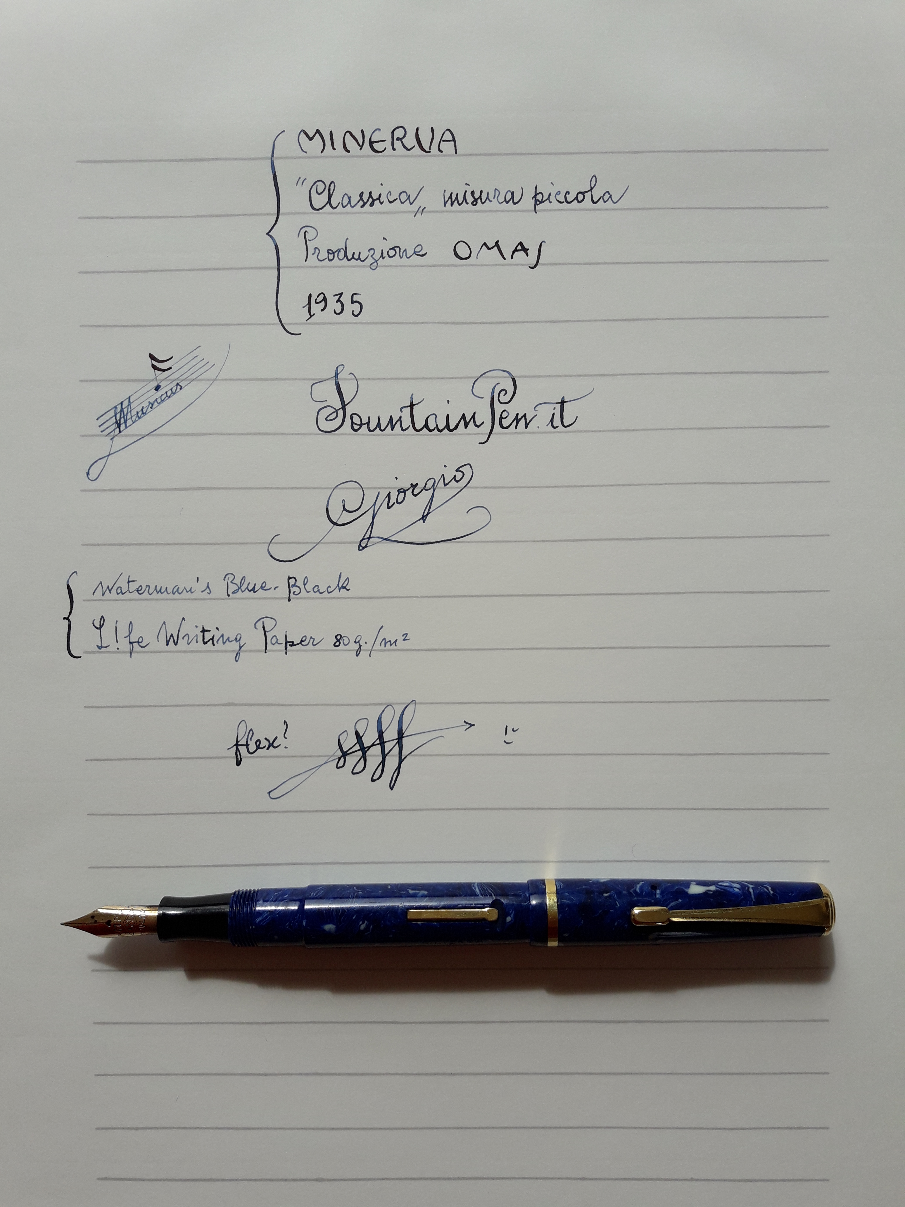Omas, questo è ben noto, utilizzò per la sottomarca Minerva partite di celluloide diverse da quelle impiegate dal Marchio principale (ma parimenti pregiate): poiché il modello “Ellittica” era spesso destinato alla produzione per conto terzi (ad esempio importanti cartolerie storiche nelle principali città, che spesso richiedevano anche aggiunte di anellini decorativi supplementari) in questo modo era meglio garantita l’originalità della penna, rispetto alla produzione standard del Marchio principale. Ma anche tra Minerva Ellittica e Minerva Classica le colorazioni non coincidevano, e tra tutte le colorazioni disponibili sulle “Classica” il blu (un intenso oltremare “lapislazzuli”, secondo me) è sicuramente tra i meno comuni…