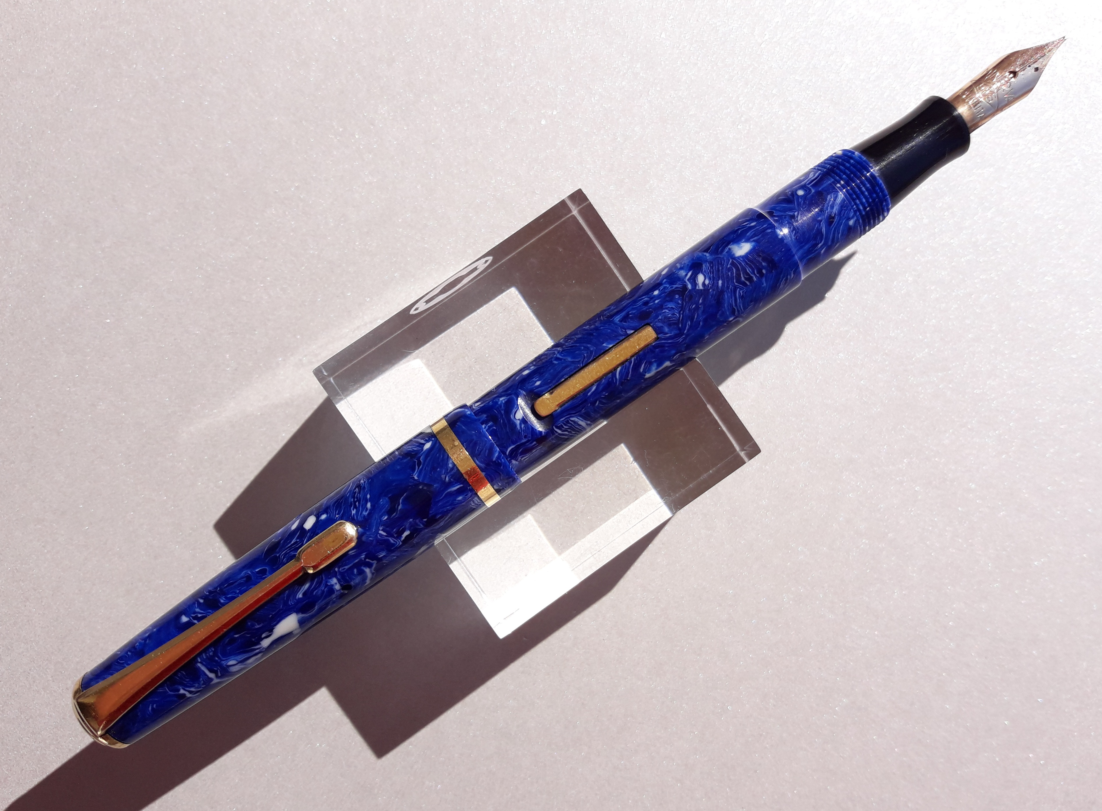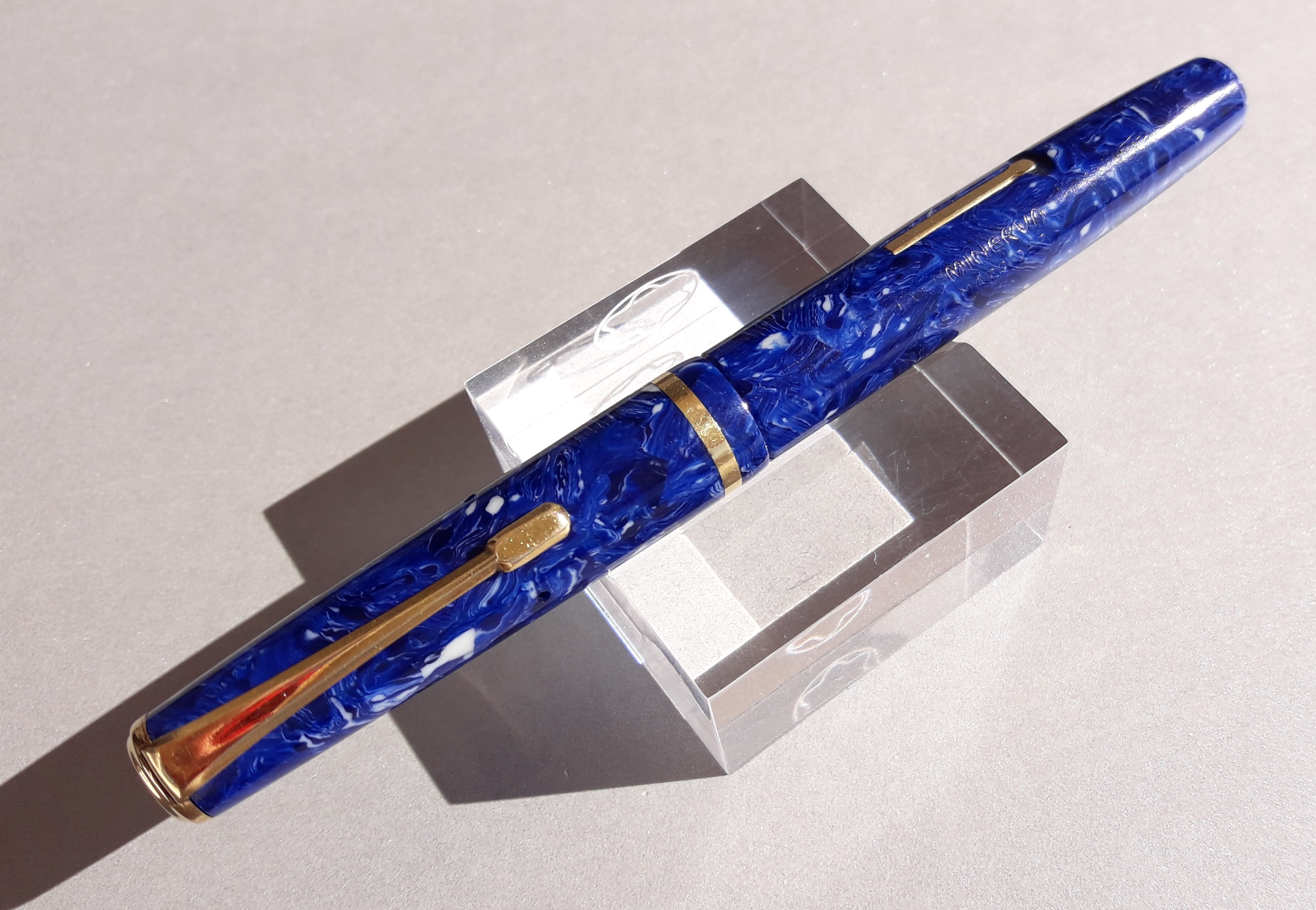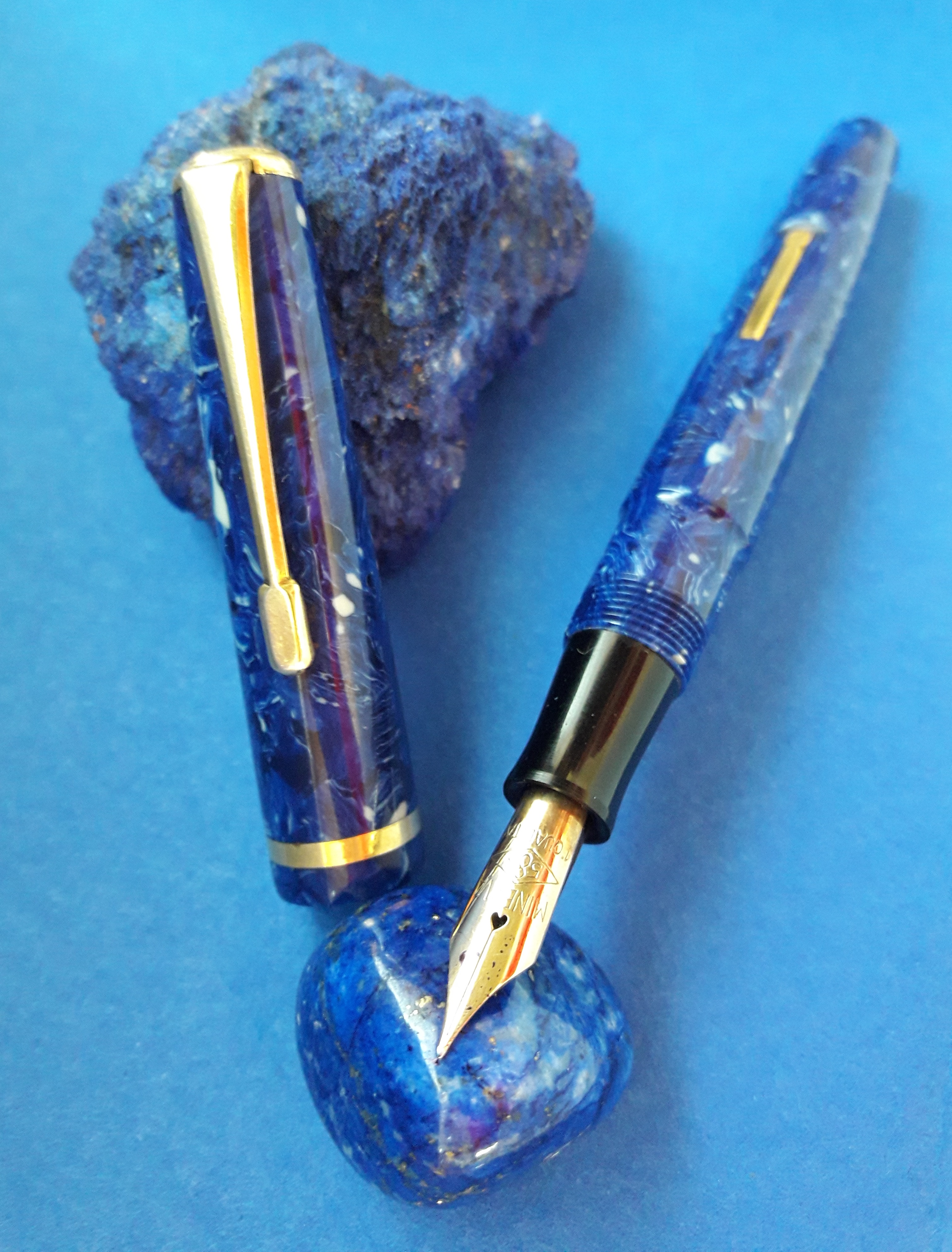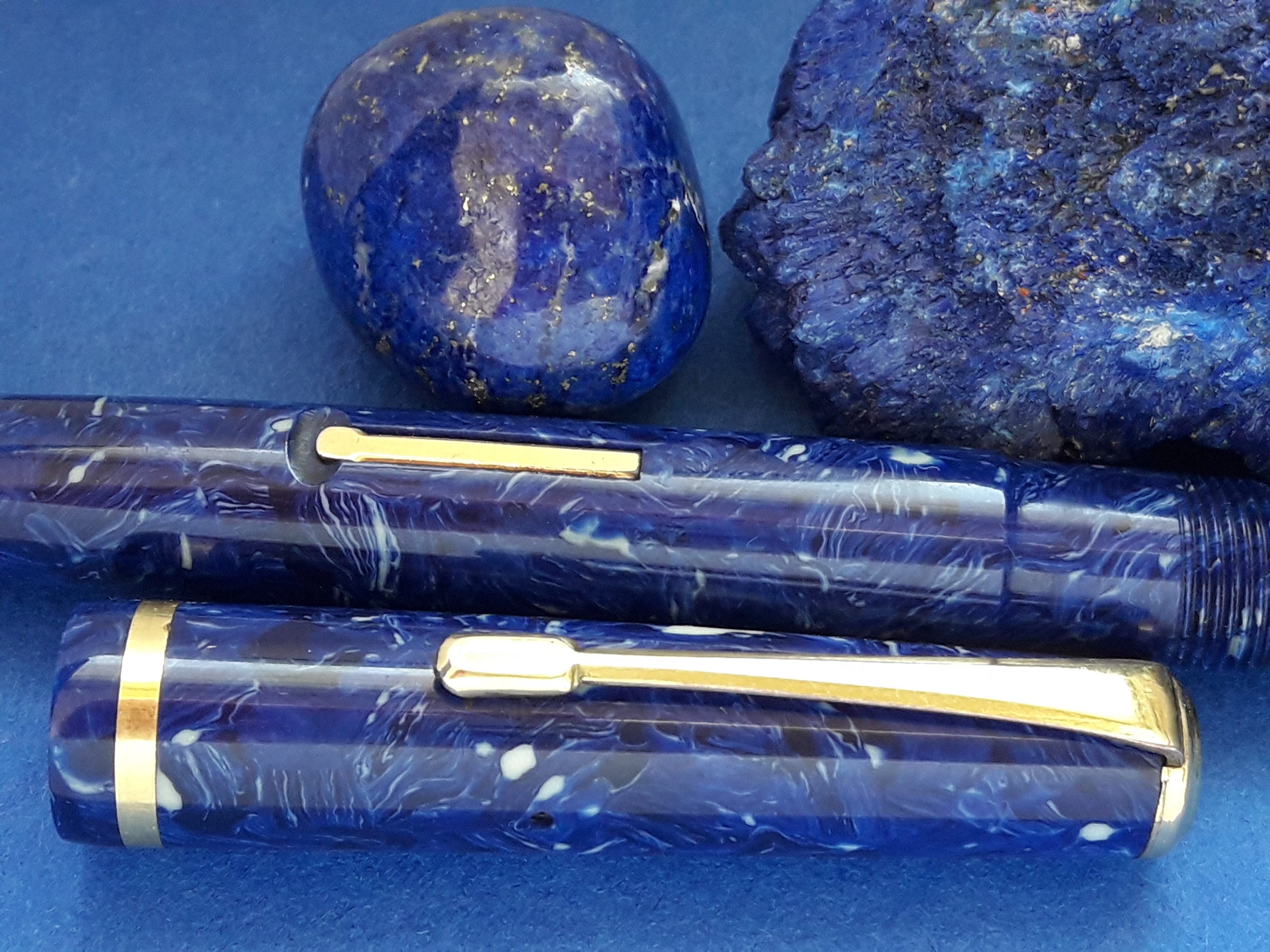 Omas, questo è ben noto, utilizzò per la sottomarca Minerva partite di celluloide diverse da quelle impiegate dal Marchio principale (ma parimenti pregiate): poiché il modello “Ellittica” era spesso destinato alla produzione per conto terzi (ad esempio importanti cartolerie storiche nelle principali città, che spesso richiedevano anche aggiunte di anellini decorativi supplementari) in questo modo era meglio garantita l’originalità della penna, rispetto alla produzione standard del Marchio principale. Ma anche tra Minerva Ellittica e Minerva Classica le colorazioni non coincidevano, e tra tutte le colorazioni disponibili sulle “Classica” il blu (un intenso oltremare “lapislazzuli”, secondo me) è sicuramente tra i meno comuni…