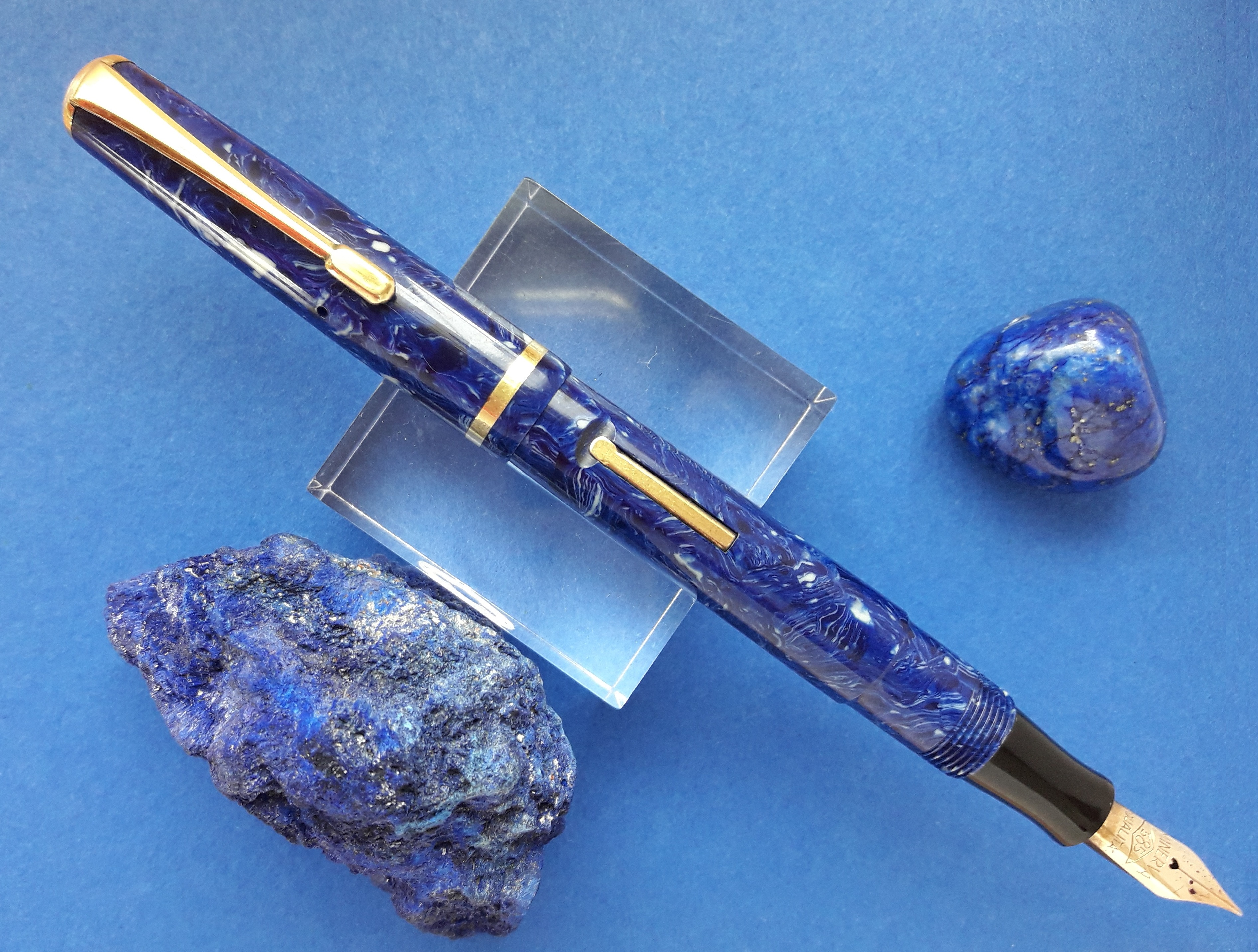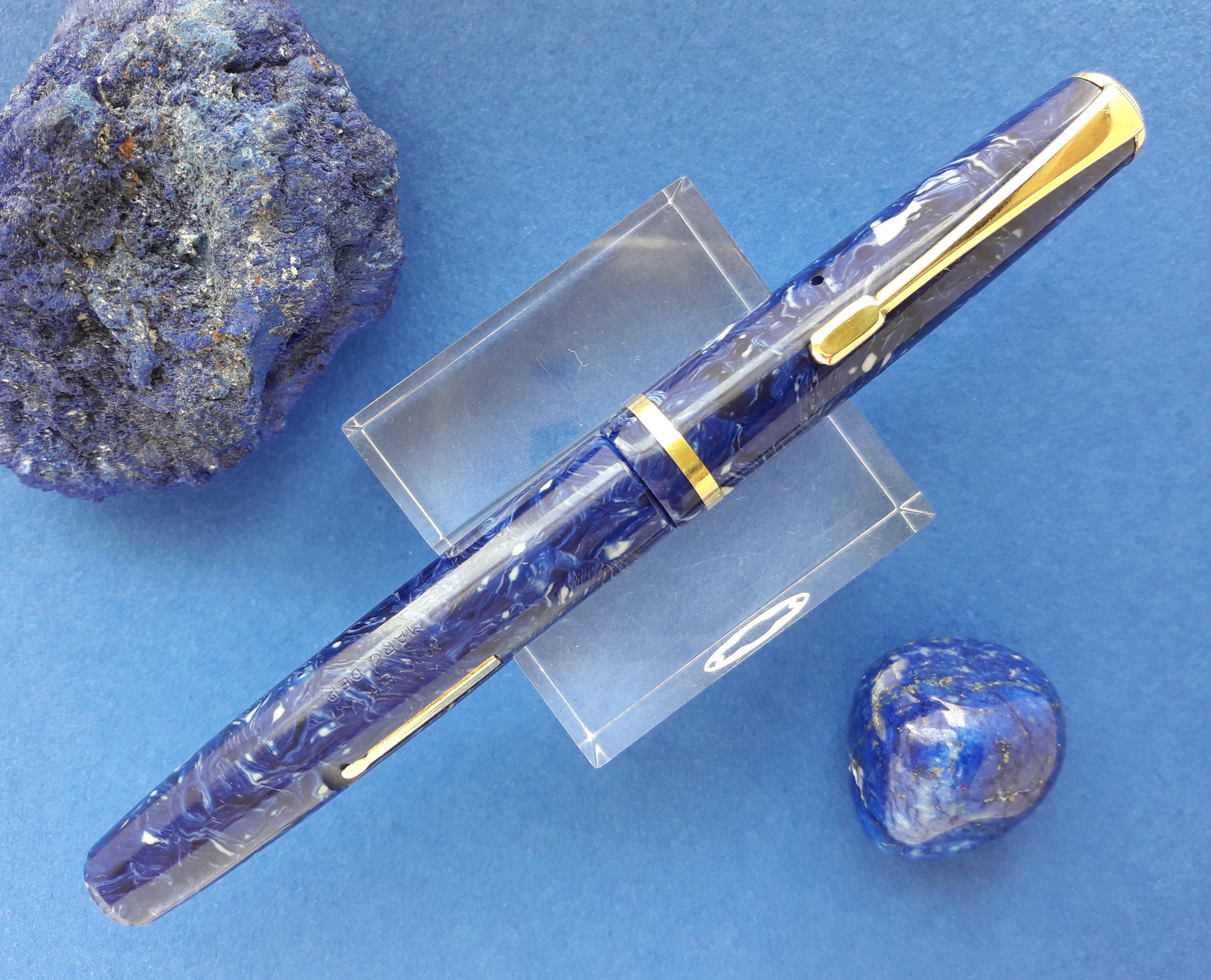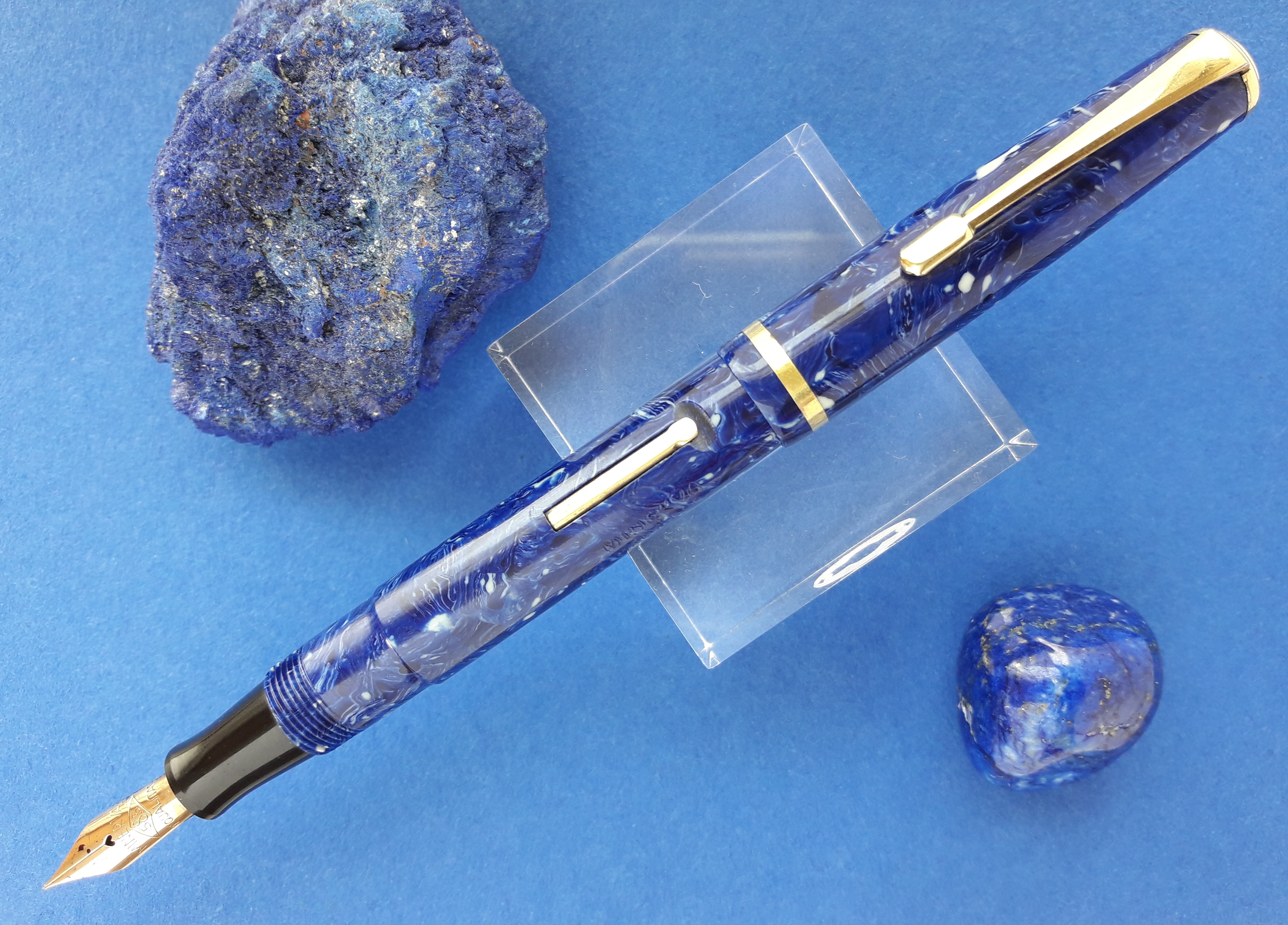 MINERVA “CLASSICA” misura piccola in celluloide blu lapislazzuli tornita da barra piena, parti metalliche a vista laminate oro, corretto pennino Minerva in oro 14 ct., caricamento a leva laterale, produzione OMAS anno 1935.