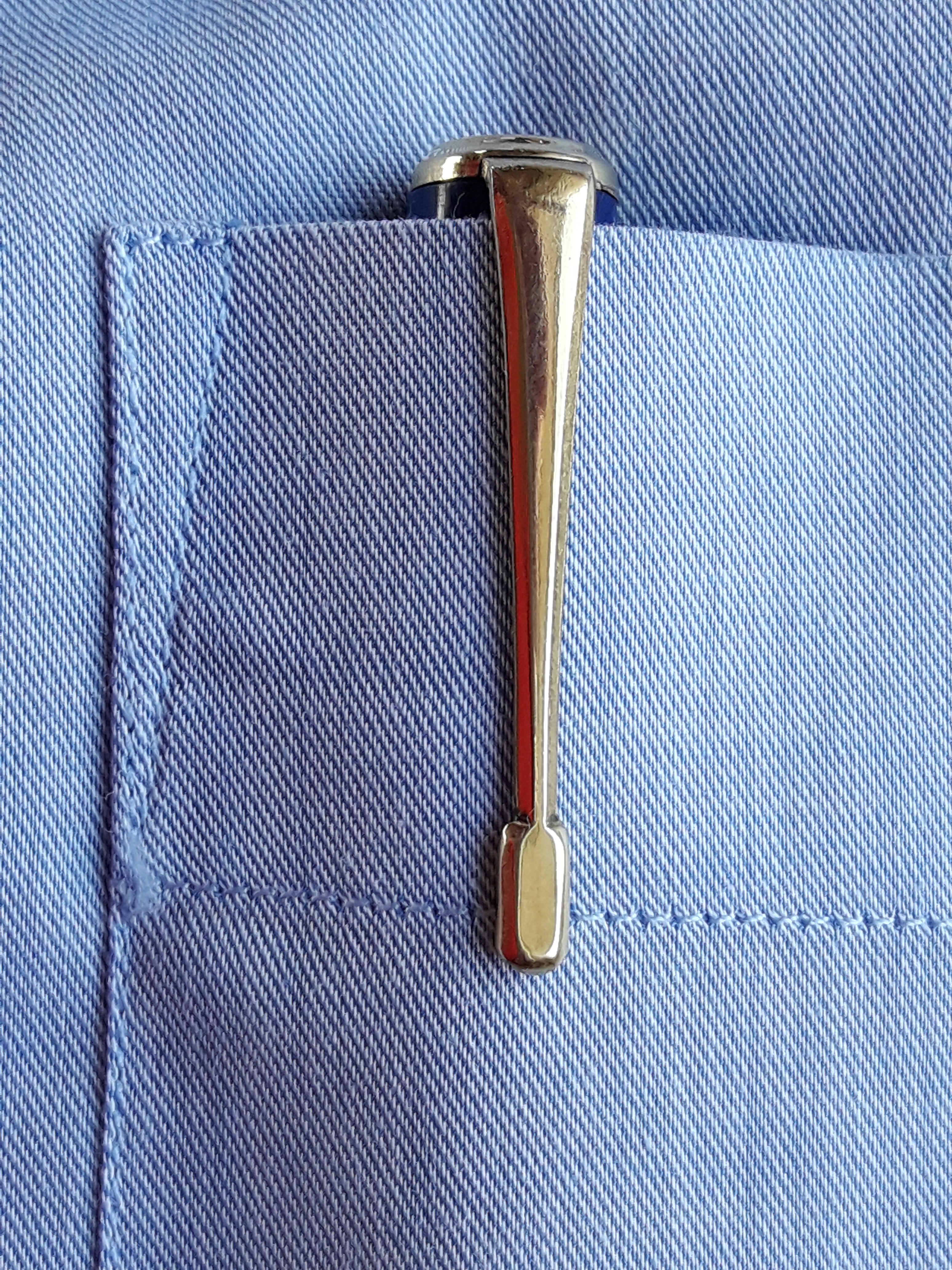 Il fermaglio è un’interpretazione di “military clip” [un fermaglio che rispetti i regolamenti militari statunitensi: dal taschino richiuso con pattina abbottonata non deve fuoriuscire alcun oggetto, né gli oggetti in esso contenuti possono avere un aspetto voluminoso] davvero da manuale!