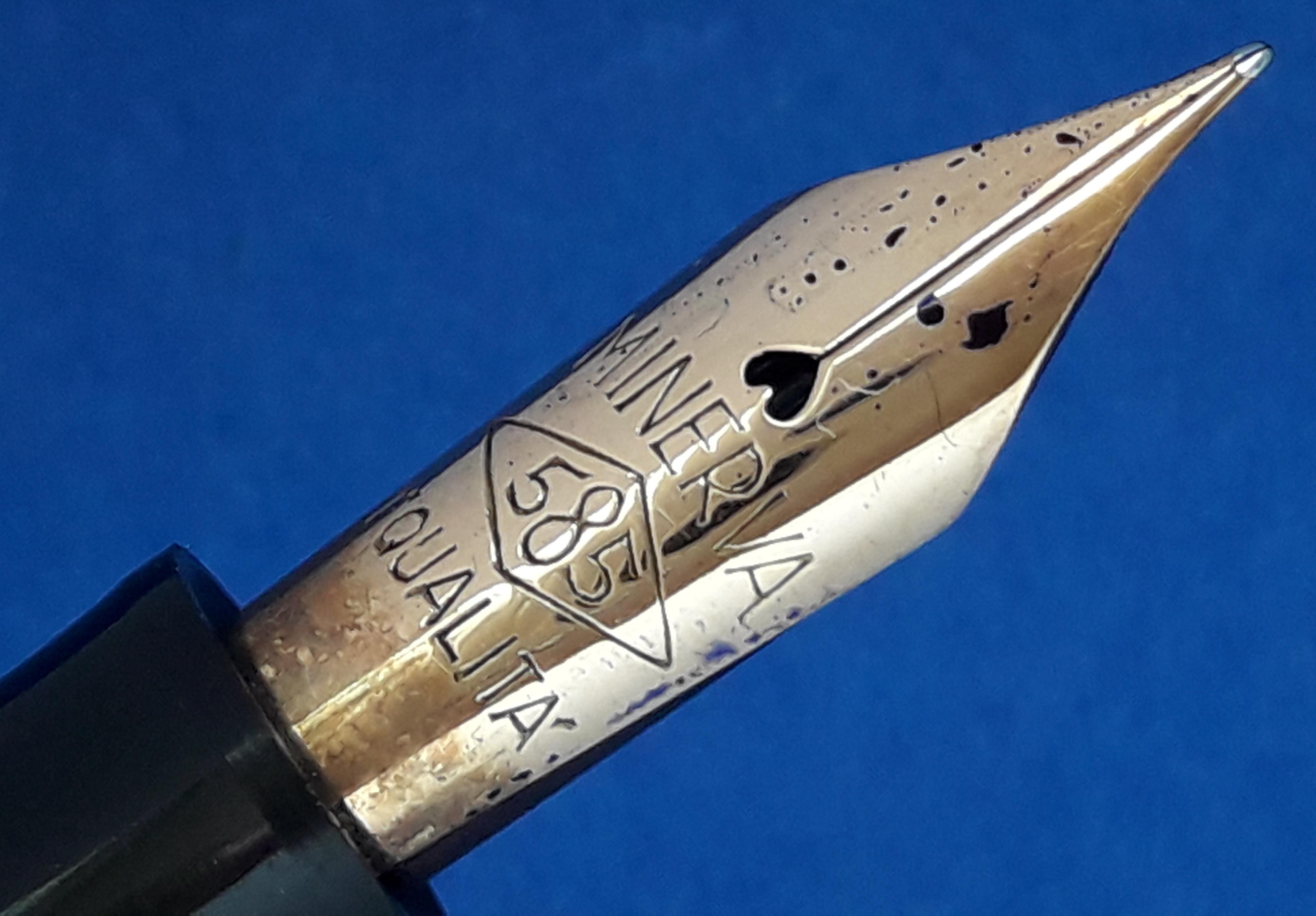 Sui quattro modelli Minerva d’anteguerra (“tipo Parker Duofold Streamline”, Classica, Ellittica e Trasparente) i pennini in oro 14 carati montati parrebbero essere in realtà… uno solo (e questo in circa una trentina di esemplari che ho potuto osservare in rete): il pennino ha foro a cuore e riporta l’iscrizione