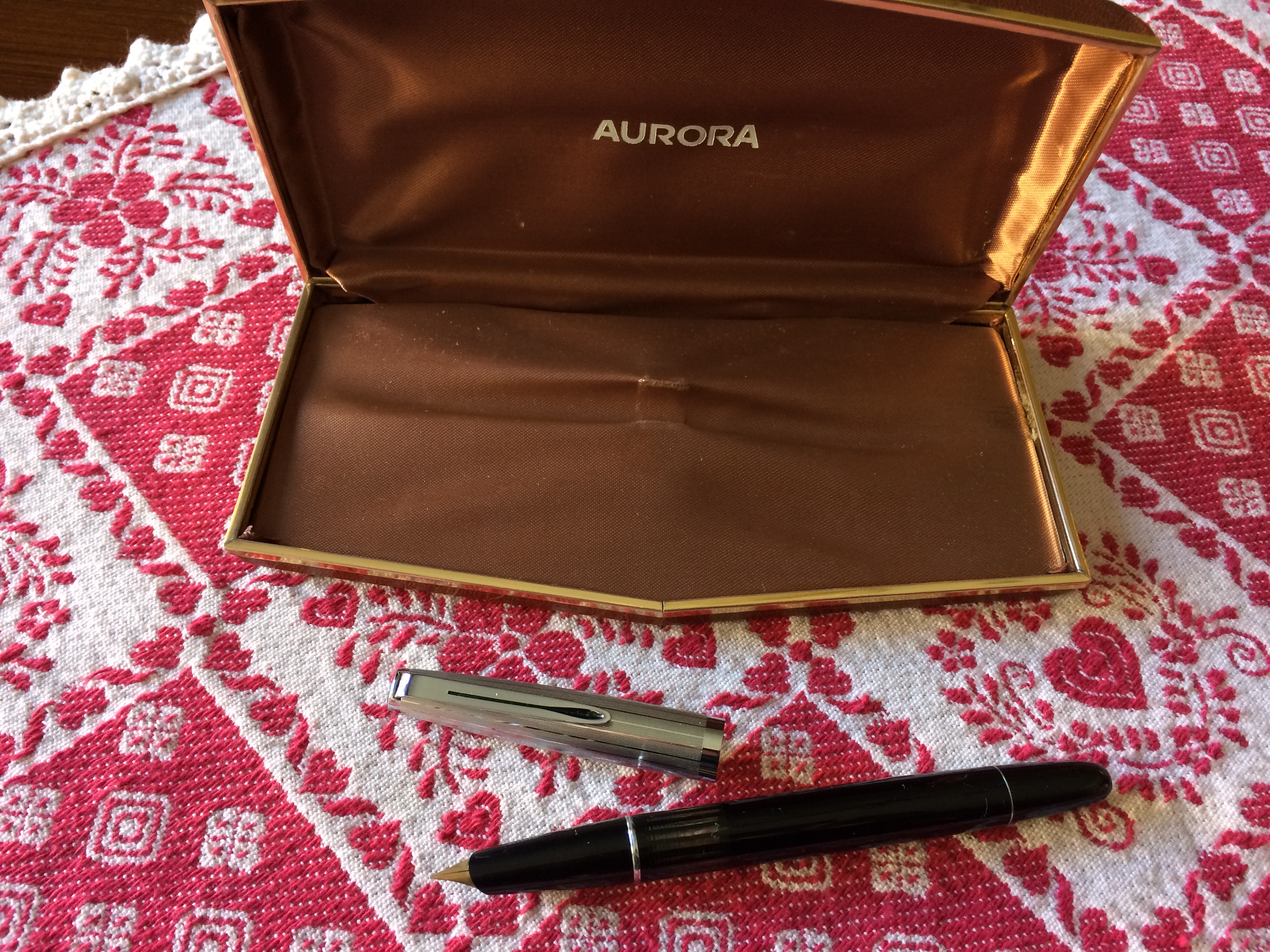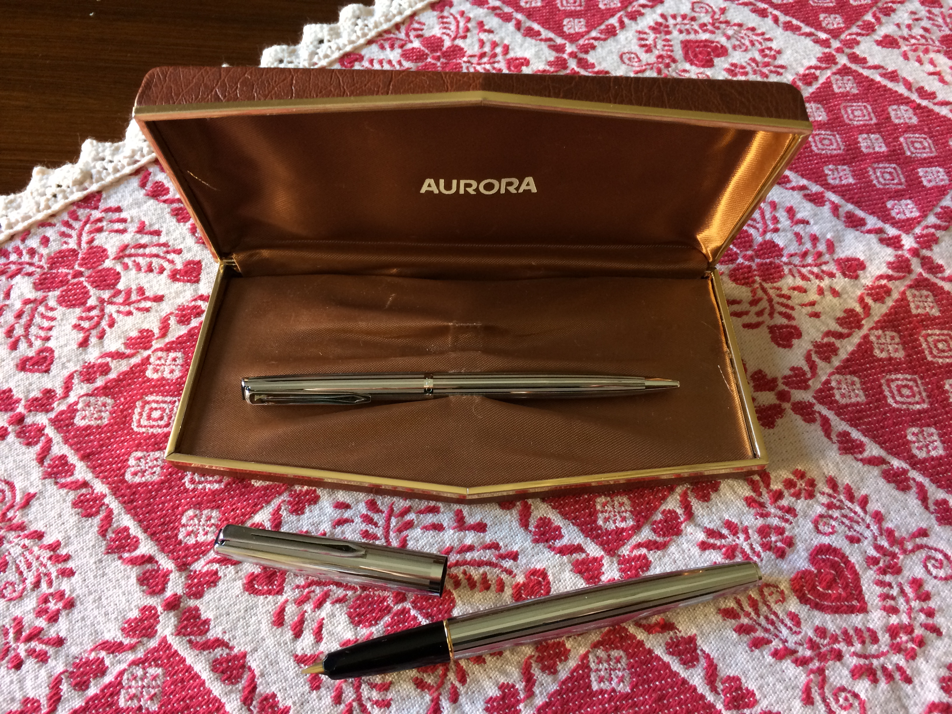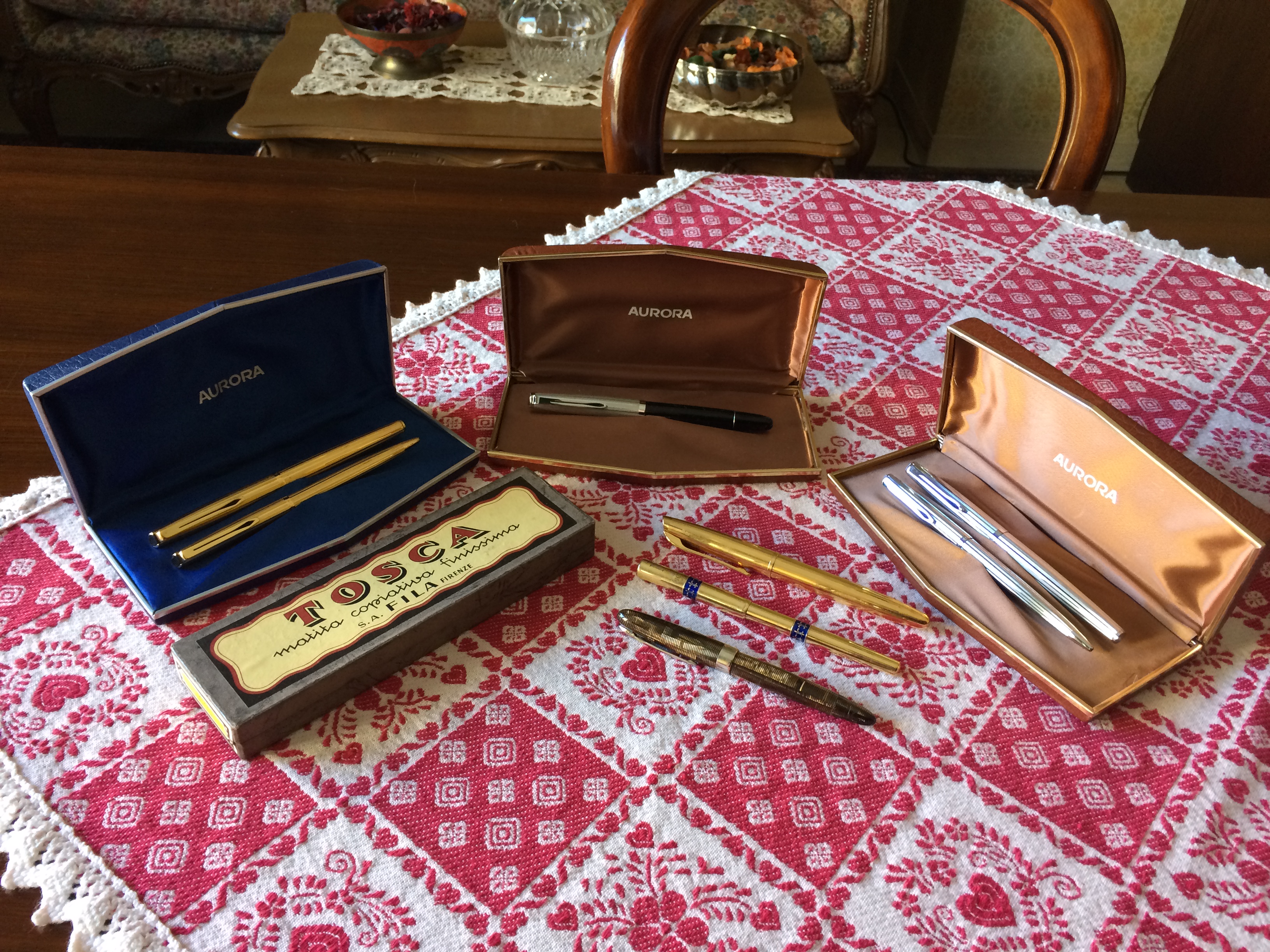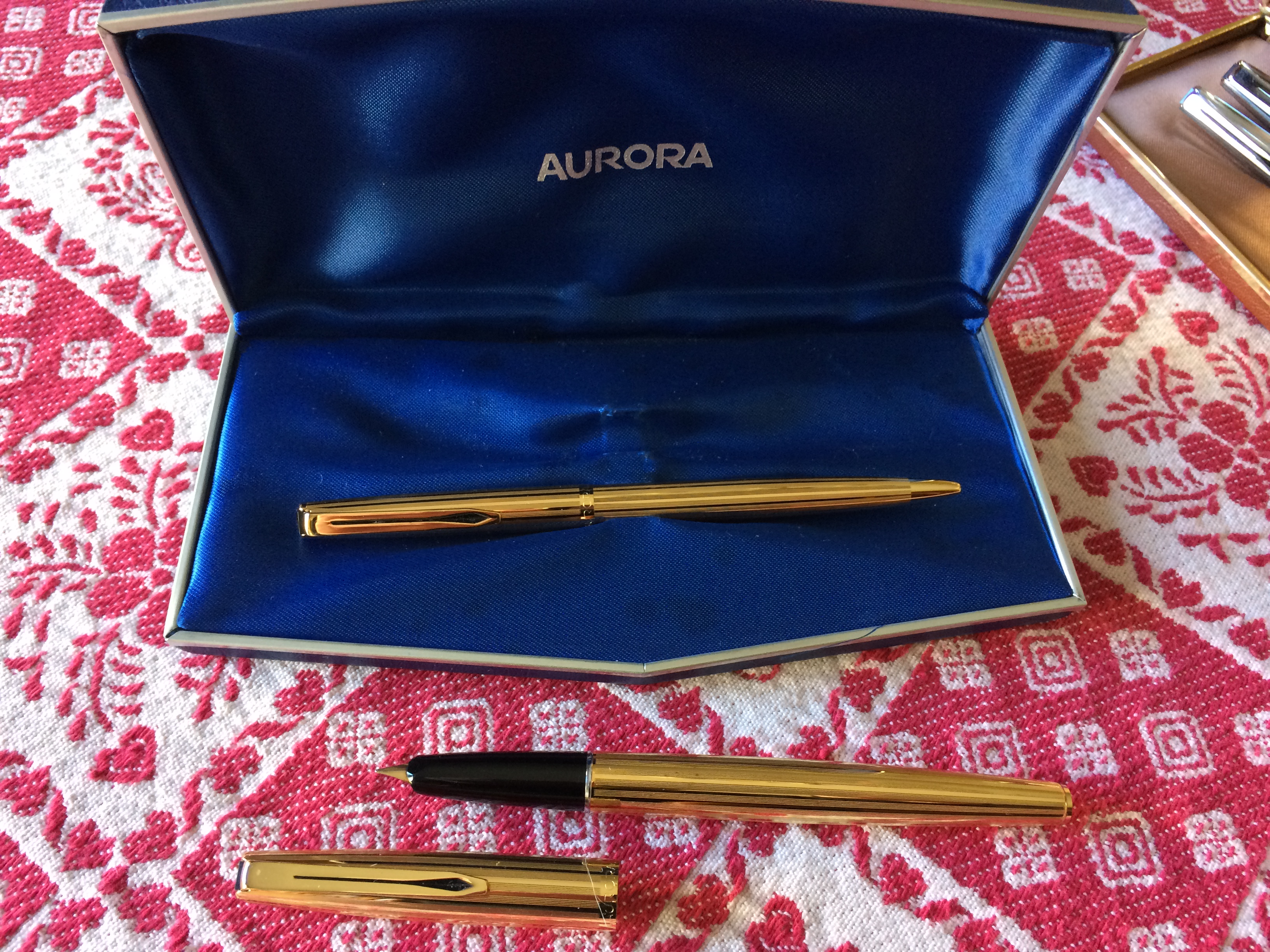 Ecco un mix di stilografiche e non. Scatola di matite marca Fila, non sono stilografica ma fanno un gran bell'effetto nuove sulla scrivania; parure Aurora 98 stilo e biro dorate, nuove; stilo Aurora 88, nuova con scatola; parure Aurora 98 stilo e biro cromo nuove; stilografica in celluloide marca Loth pennino oro 14 kr marchiato Loth; Aurora Style placcata oro seminuova; per finire, sembra una penna da calamaio, ma ho dubbi, placcata oro, pennino in oro 14 kr Warranted. Le foto.