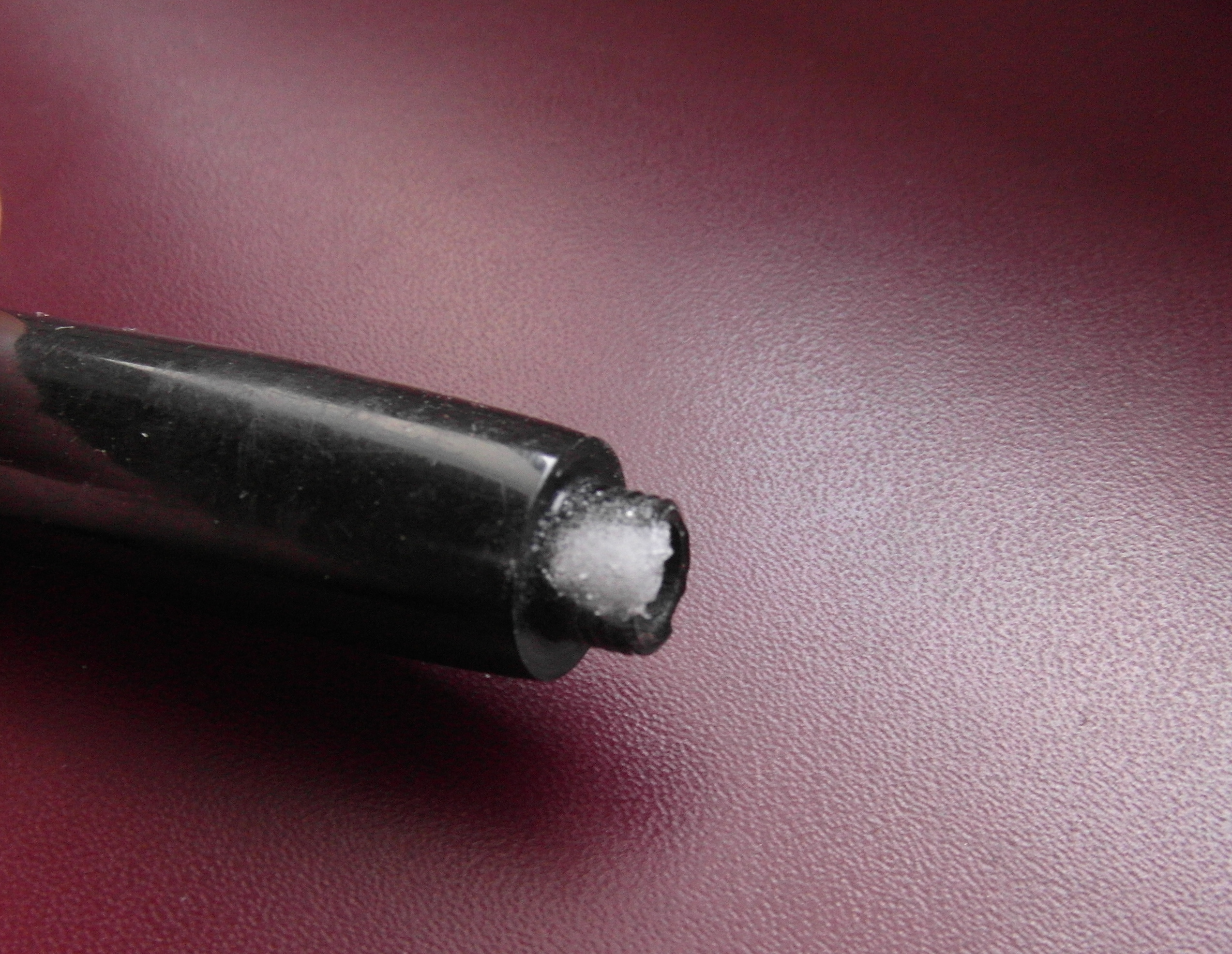 Oggi ero sufficientemente ispirato per cercare di risolvere l'ultimo problema di una vecchia Montblanc "Fabbricata in Italia": una rottura nella parte filettata che ospita il pulsante di fondo e sulla quale si avvita il fondello. Questa parte, come spesso accade non è ricavata insieme al corpo della penna, ma inserita nel suo fondo, spesso realizzata in un materiale diverso: in questo caso è in ebanite mentre il corpo è di celluloide.