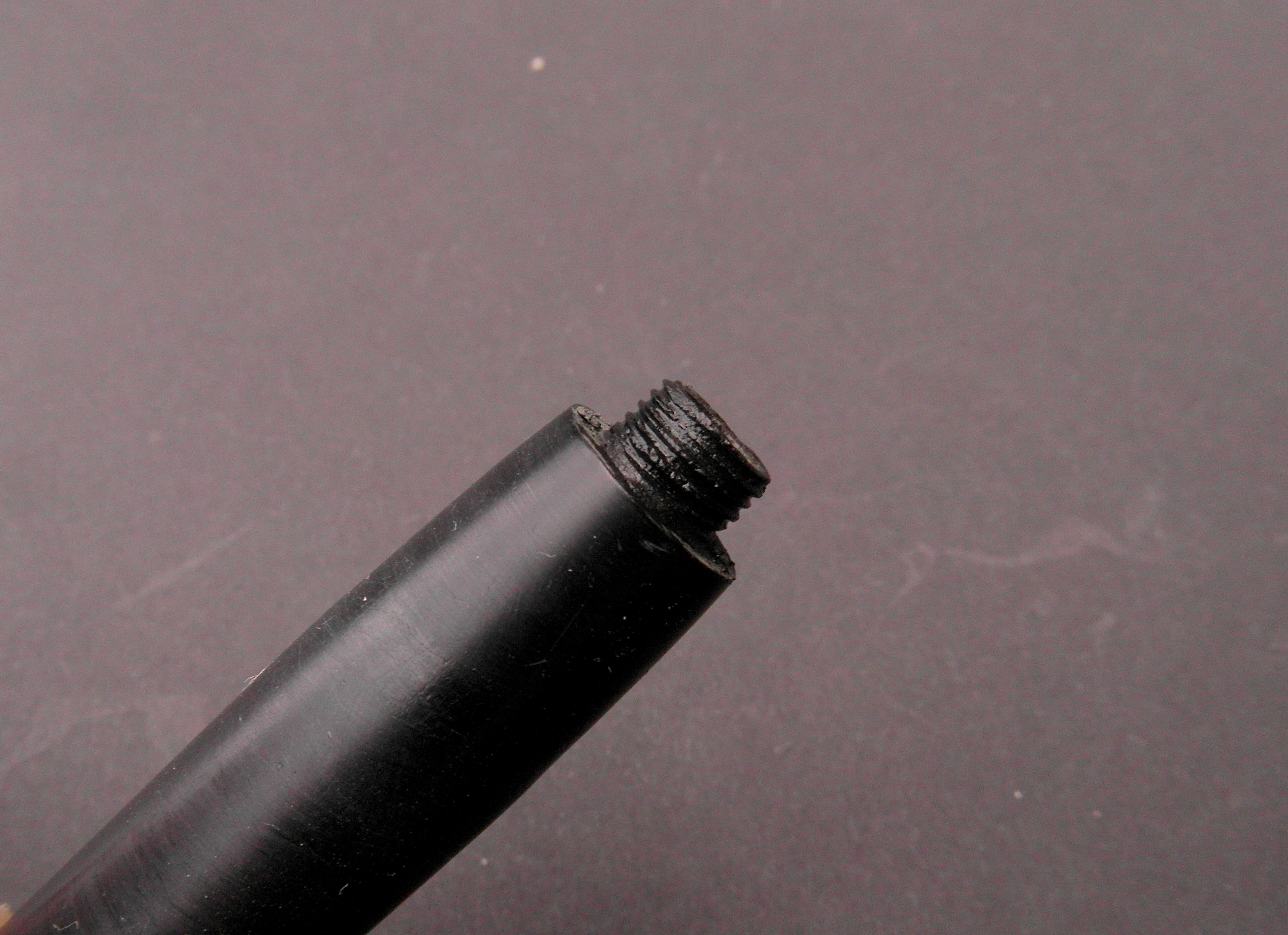 Per conservare il più possibile intatto il foro inserisco un cilindretto avvolto nel nastro di teflon sino a raggiungere il diametro corretto. Applicato il prodotto facendo molta attenzione a non andare fuori dalla zona del danno ne regolarizzo la forma con la lima e passo quindi alla fase più difficoltosa, ovvero quella di raccordare la filettatura sulla parte applicata. C'è da perderci gli occhi, ma poco alla volta riesco a ricreare i solchi mancanti con una lima di forma adeguata. Dopo qualche ritocco il fondello si avvita correttamente e non resta che applicare un pò di vernice per l'ebanite per rendere pressoché invisibile la riparazione.