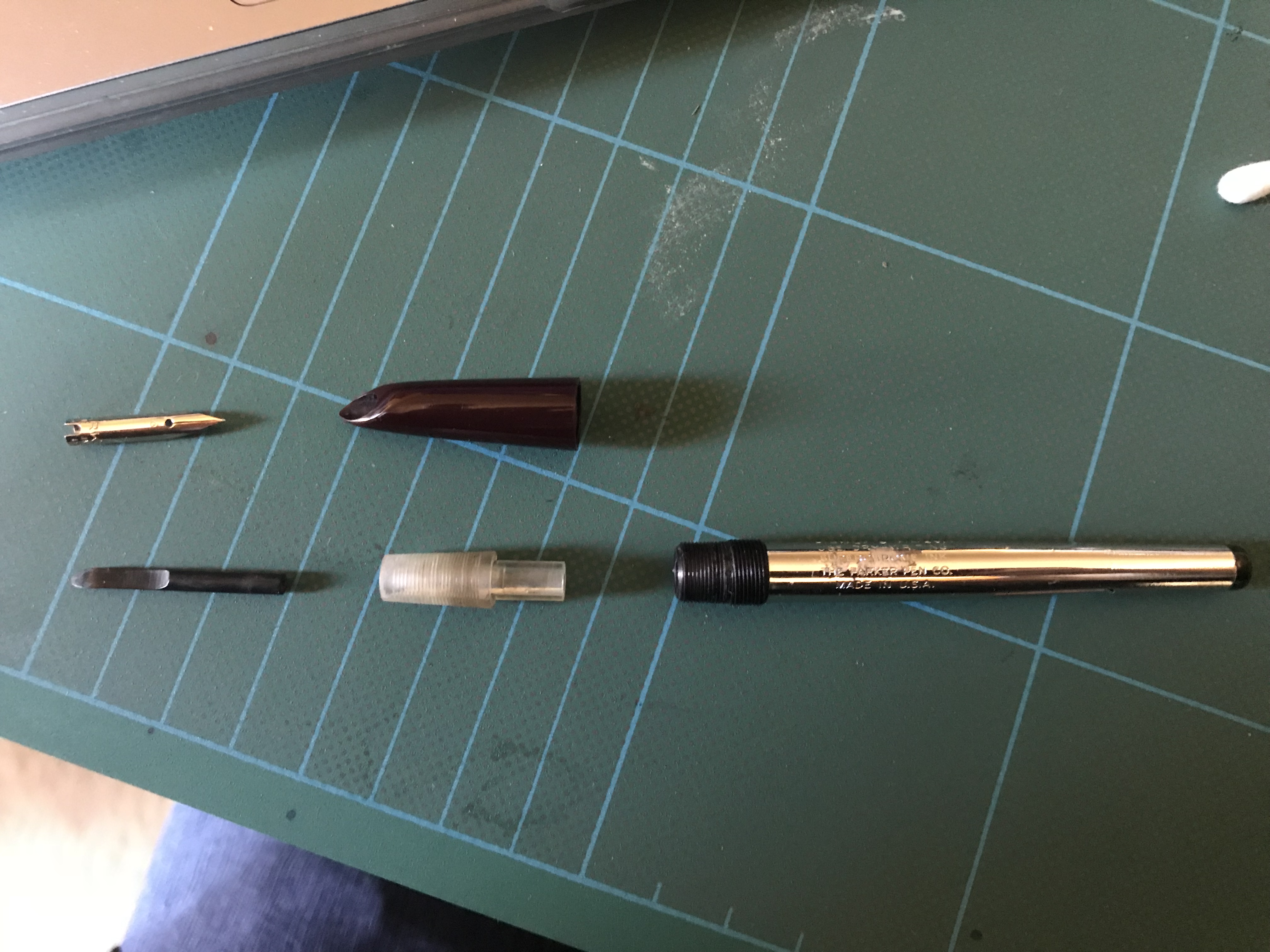 Ho una Parker 51 che mi da problemi di scrittura. L'ho completamente smontata. Per intenderci: aperta la sezione, sfilato il pennino, sfilato il tubicino dal feeder, sfilato il feeder, pulita la sezione interna che contiene il gruppo. Rimontato tutto facendo attenzione all'allineamento sulla sezione interna . L'unica cosa che non ho smontato è il contenitore di metallo del sacchetto perchè mi sembra non abbia problemi di carica. Ho provato a fare un test di scrittura a penna aperta, ma trovo la sezione interna bagnata di inchiostro. Non riesco a capire da dove cavolo esce....