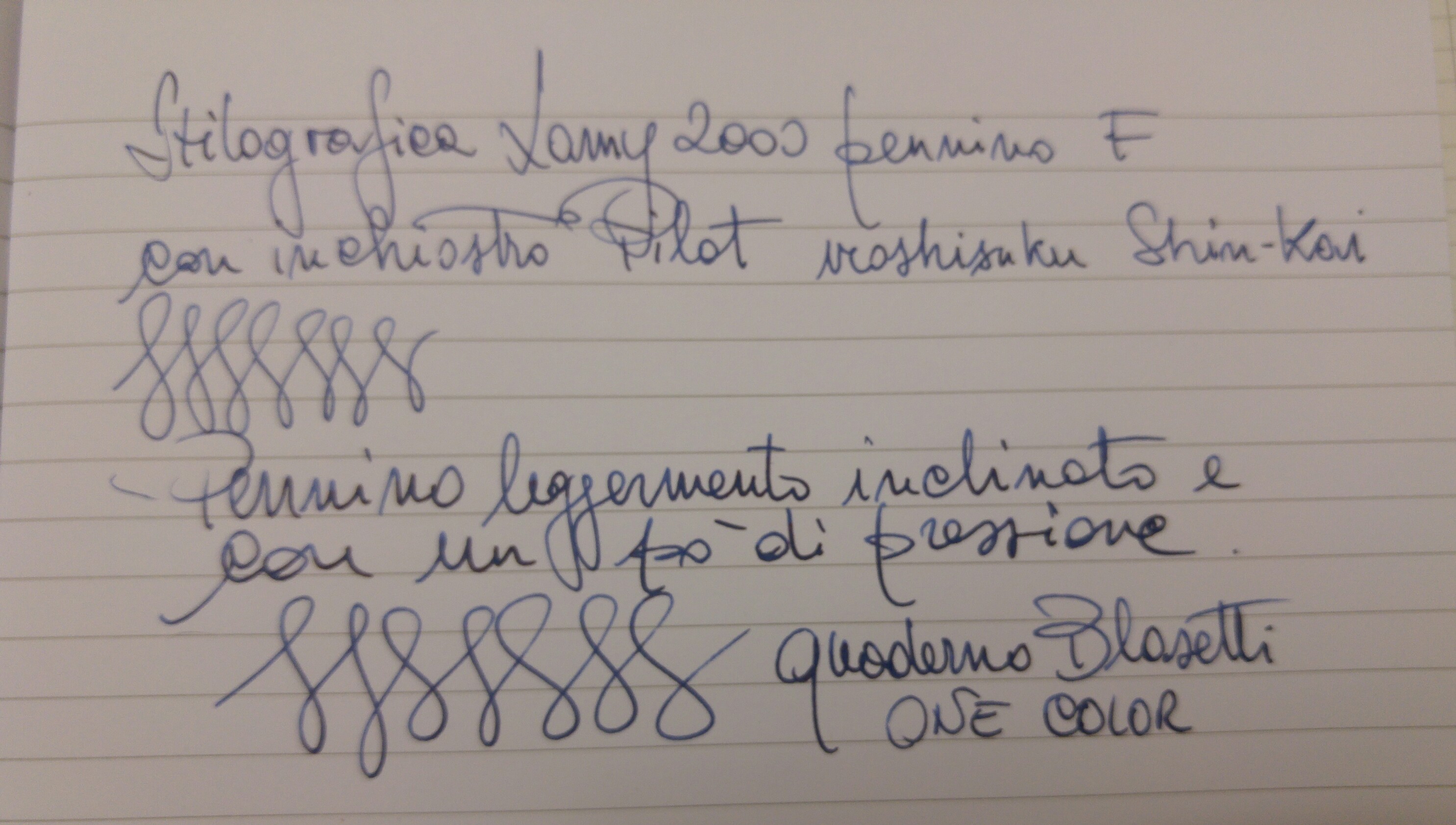 Ho notato che a seconda di come si tiene l'angolazione del pennino il tratto cambia virando dal fine al medio credo.Leggera flessibilità ed ottima scorrevolezza va via che è un piacere.