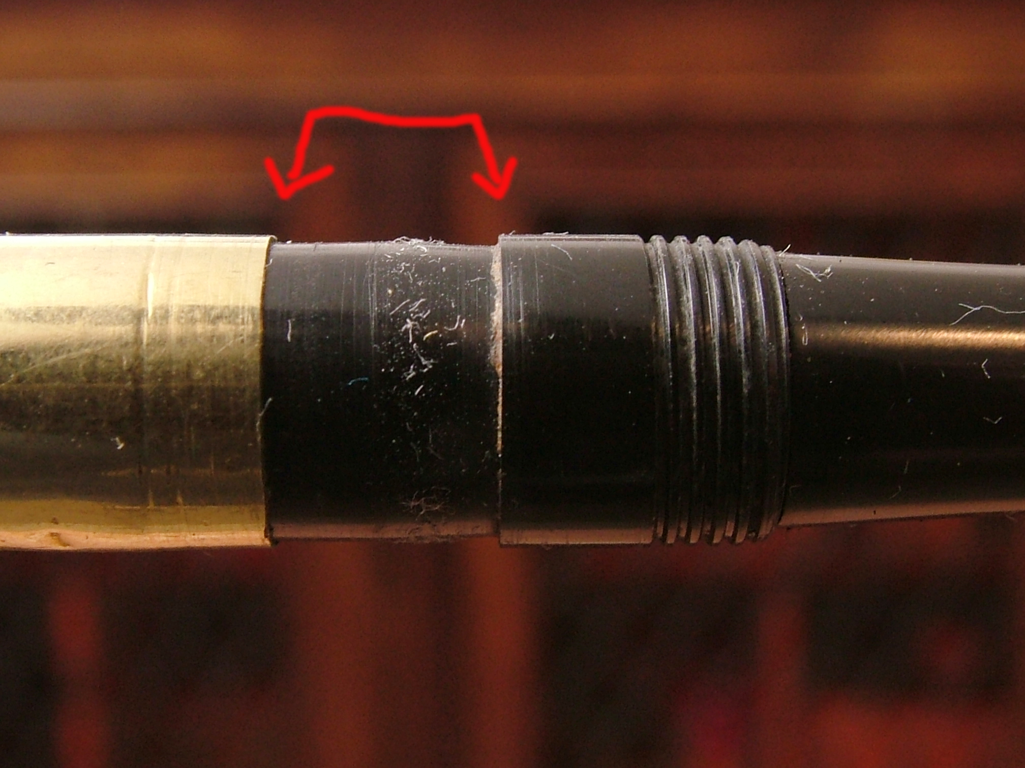 La parte del fusto in ebanite è più avanti rispetto alla laminatura creando uno scalino e dello spazio nero tra il cappuccio e il fusto.