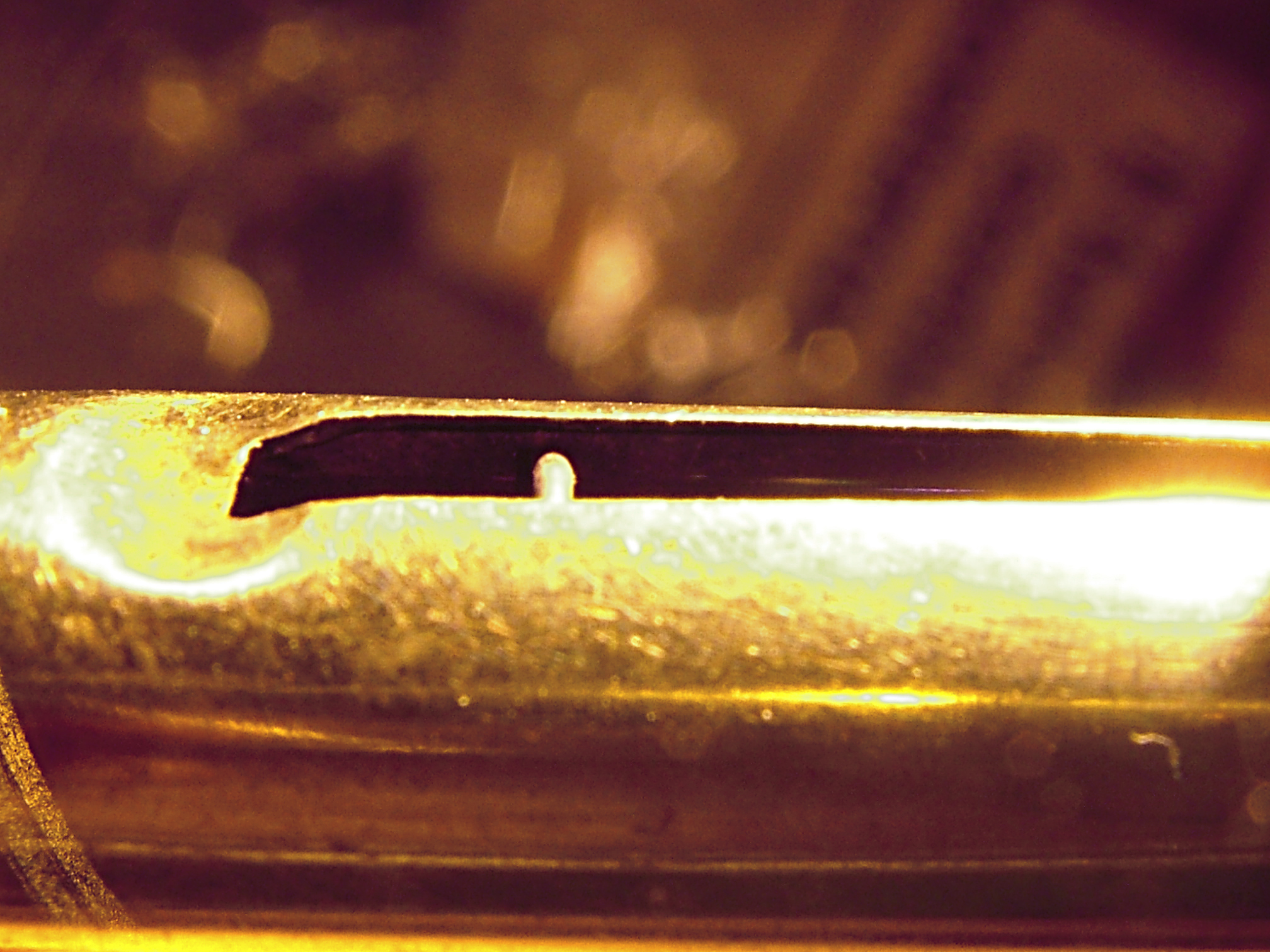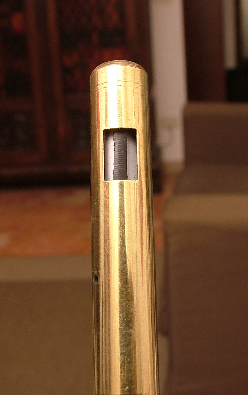 Ci sono un paio di cose ancora che mi risultano strane, dovrebbe avere la clip rivettata, ma al suo posto c' è un foro rettangolare da cui si intravede una striscia nera centrale, che credo faccia parte del cappuccio in ebanite sotto la laminatura.e si vede dello spazio vuoto ai lati.