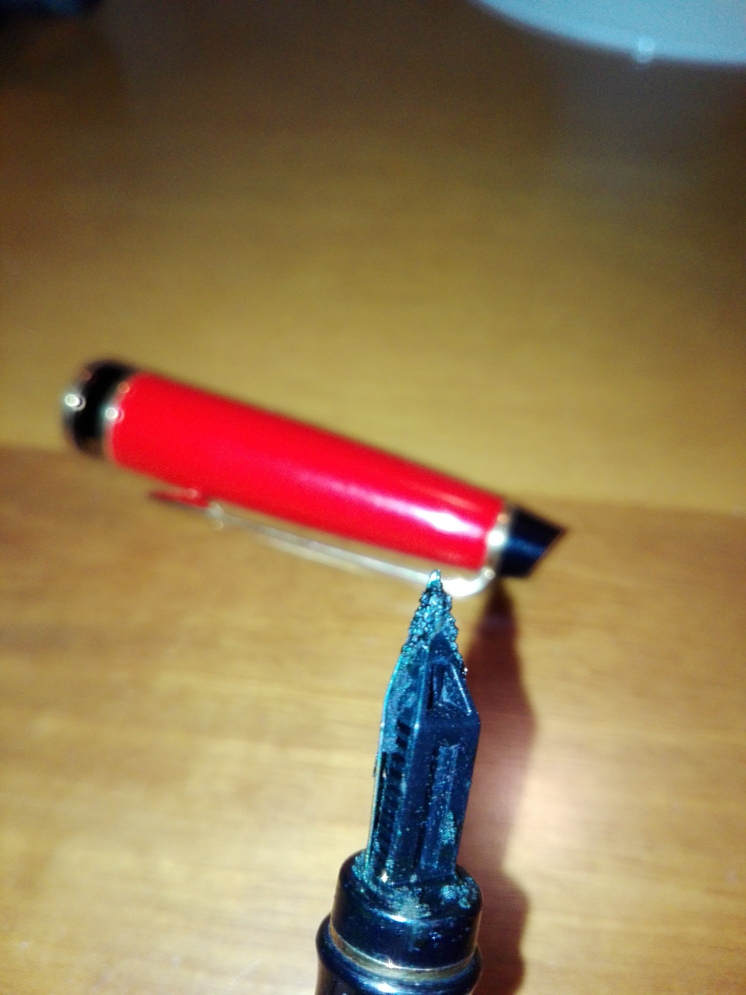 Mi è capitato quando ho lasciato una penna caricata di rosso(Diamine Oxblood)ferma per un pò di tempo. Nulla di grave. Soprattutto nulla che non venga via con un lavaggio. Capita con alcuni inchiostri, più son pigmentati più capita.