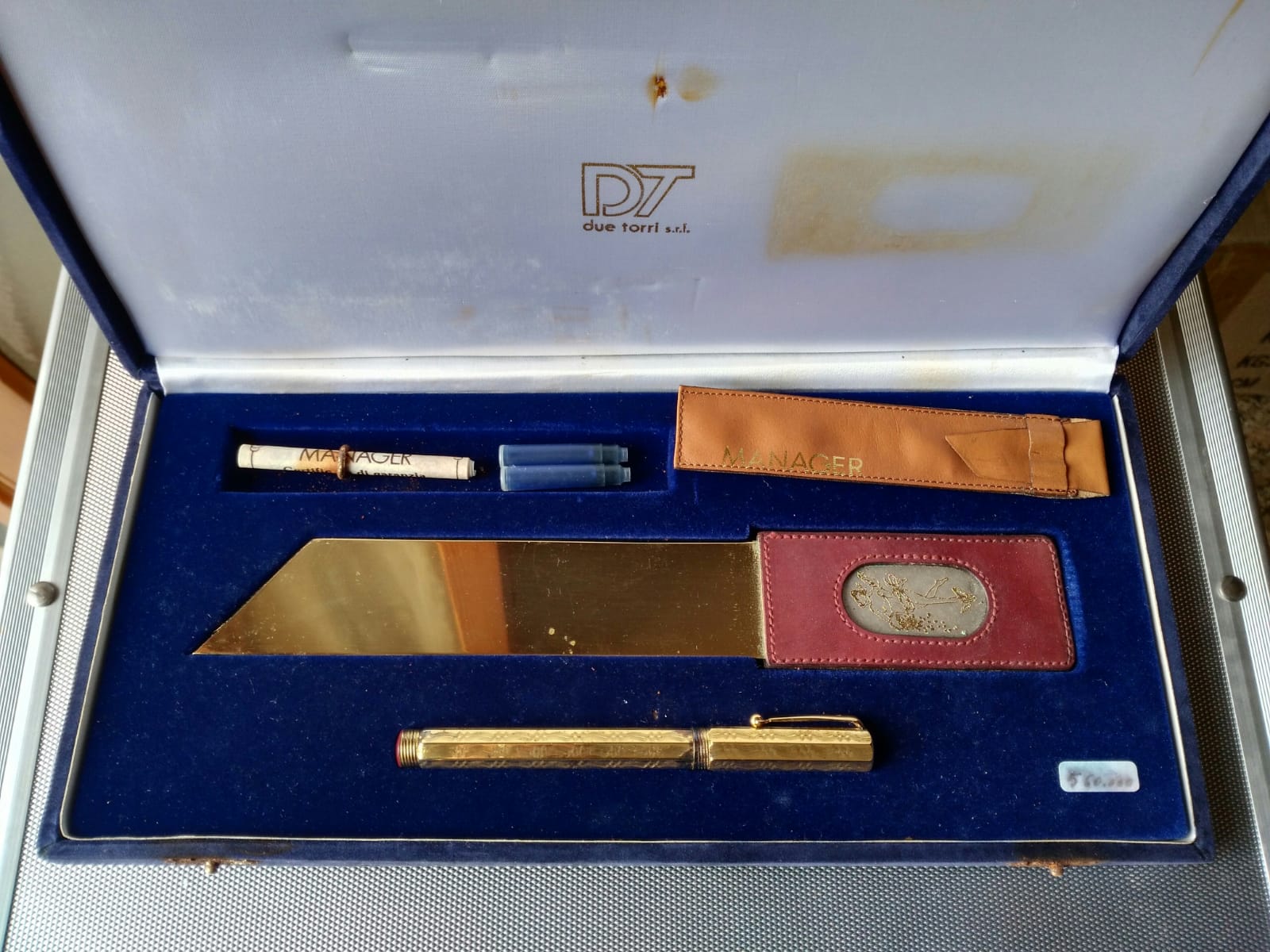 Lui mi dice di averne una in garage che non ha mai usato. In parte ossidata,fa parte di una confezione da gioielleria con marchio "due torri".