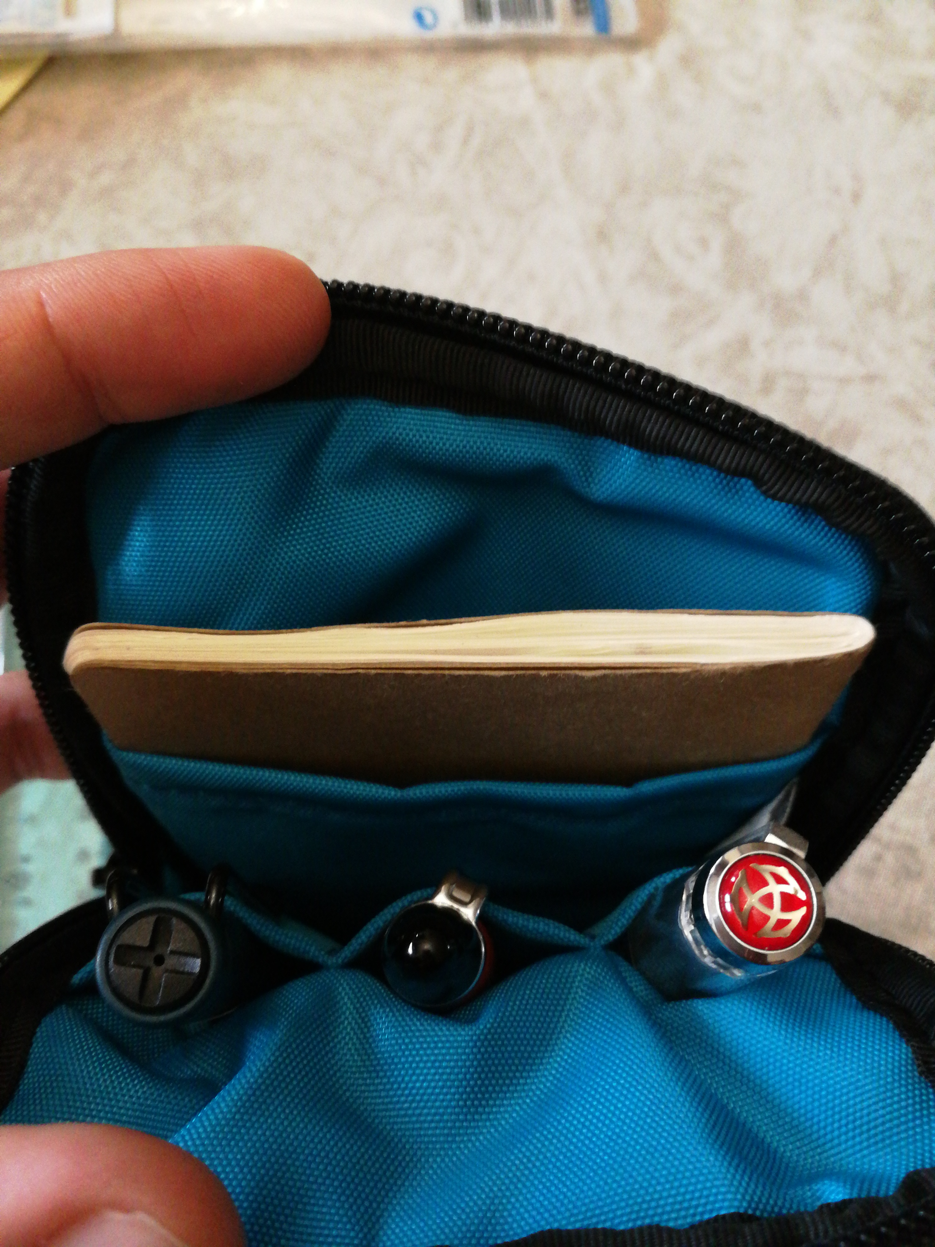 5) Capienza: tre penne (tasca dedicata per ciascuna) + tasca per tacquino pocket (misura field notes) + spazio per altro tacquino o cellulare o soldi.